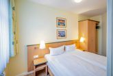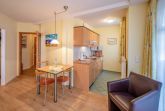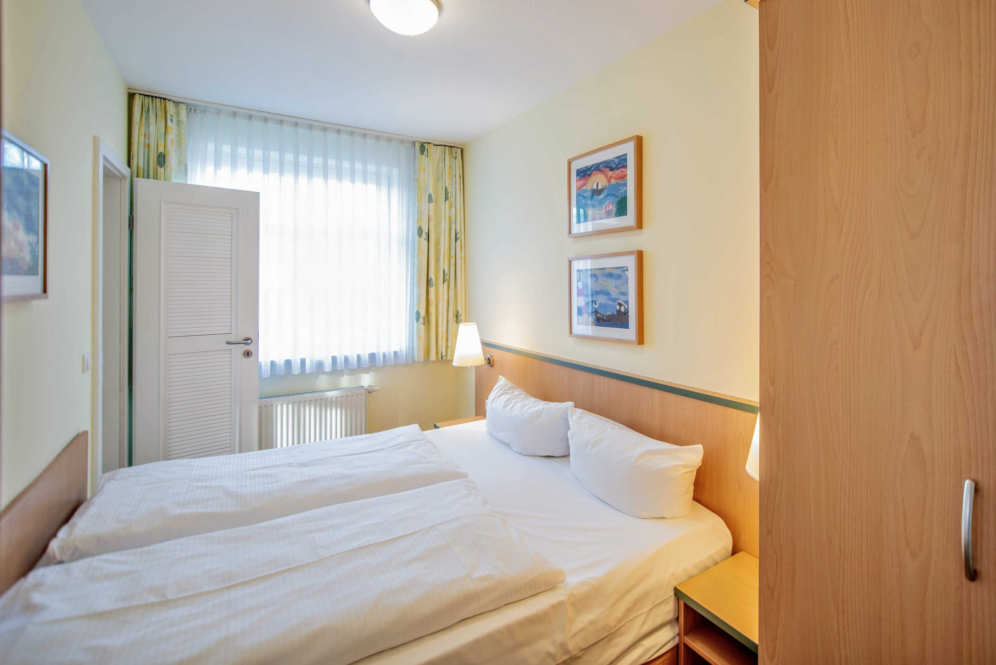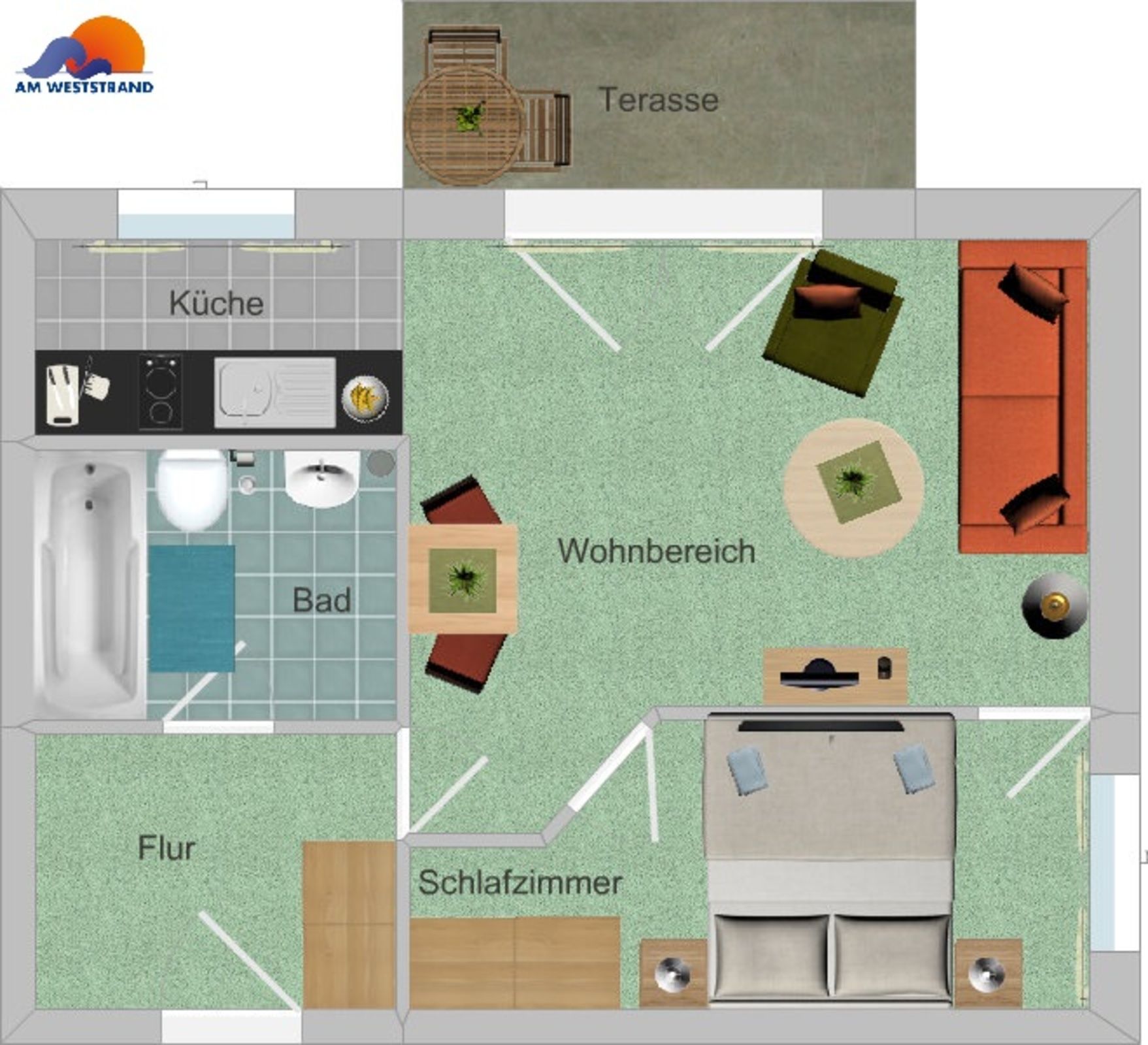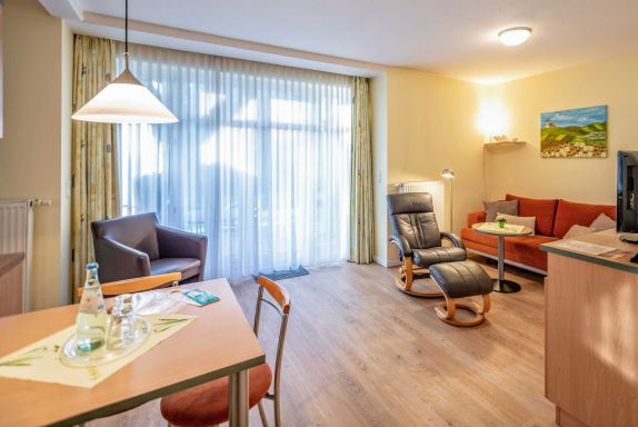 Das 2-Zimmer-Apartment mit Teppichboden befindet sich im Erdgeschoss des Hauses Waldeck. Mit ca. 40 m² Wohnfläche und einer Terrasse mit Strandkorb zur Südseite und Blick zum Stadtwald (sehr ruhige Lage), besteht das Apartment aus einem Wohnzimmer mit Schlafcouch und einer voll ausgestatteten Küchenzeile mit Geschirrspülmaschine, Kühlschrank, Mikrowelle, Zwei-Platten-Cerankochfeld, Kaffeemaschine, Wasserkocher und einem Toaster. Das Schlafzimmer verfügt über ein Doppelbett. Im Badezimmer befindet sich eine Badewanne, ein Fön wird Ihnen zur Verfügung gestellt. Das Apartment ist für maximal 2 Erwachsene und insgesamt 3 Personen geeignet, auch Hunde sind gestattet.