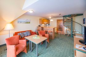 Das 4-Zimmer-Maisonette-Apartment mit Teppichboden befindet sich im 3. Obergeschoss des Apartmenthauses Waldeck. Mit rund 80 m² Wohnfläche und einem Balkon zur Ostseite, besteht das geräumige Apartment aus einem Wohnzimmer mit Schlafcouch, einem Esstresen und einer voll ausgestatteten Küchenzeile mit Geschirrspülmaschine, Kühlschrank, Mikrowelle, Zwei-Platten-Cerankochfeld, Kaffeemaschine, Wasserkocher und einem Toaster. Ein Schlafzimmer mit einem Doppelbett und einem Kinderbett befindet sich in der unteren Etage. Zwei weitere Schlafräume mit jeweils zwei Einzelbetten, befinden sich durch eine Wendeltreppe zugänglich, in der oberen Etage des Apartments. Sowohl im Wohnzimmer als auch in einem der beiden oberen Schlafzimmer, befindet sich ein Flachbildschirm. Das Apartment verfügt über zwei Bäder. Das untere Bad ist mit WC und Badewanne, das obere Bad mit WC und Dusche ausgestattet. Für bis zu sechs Personen ist dieses Apartment geeignet.