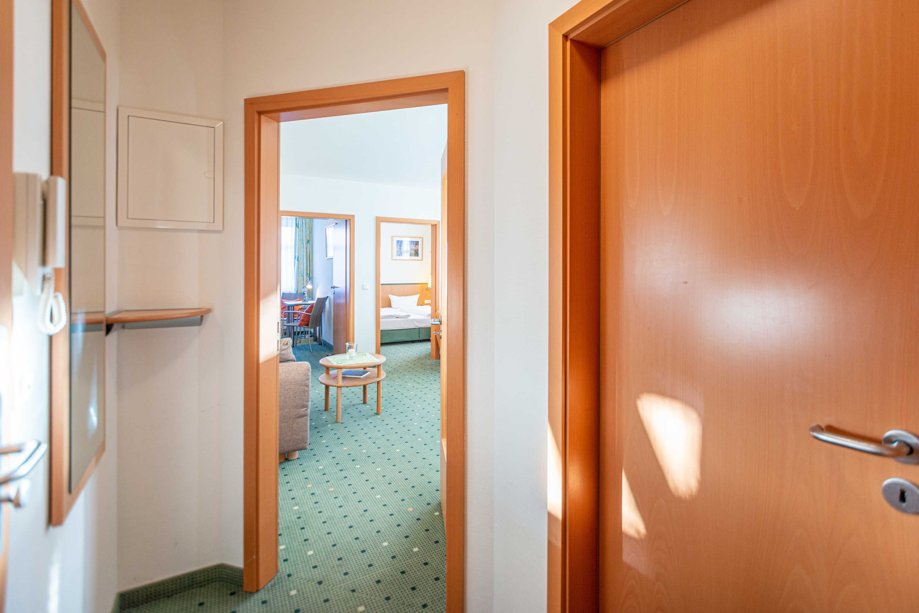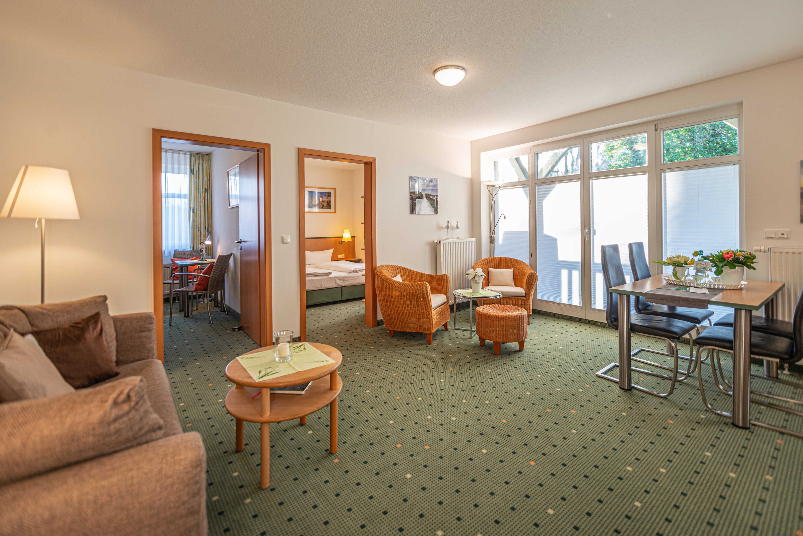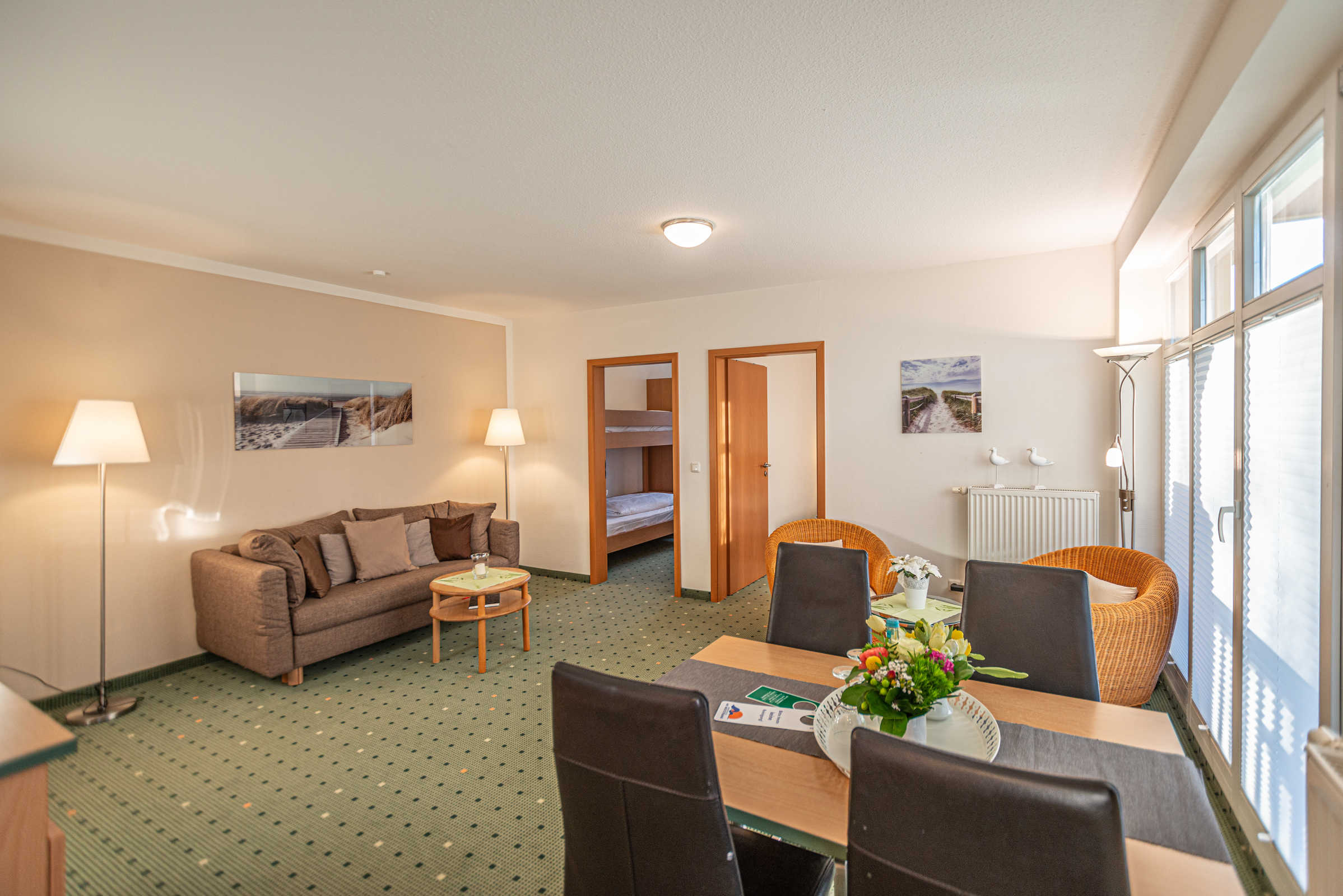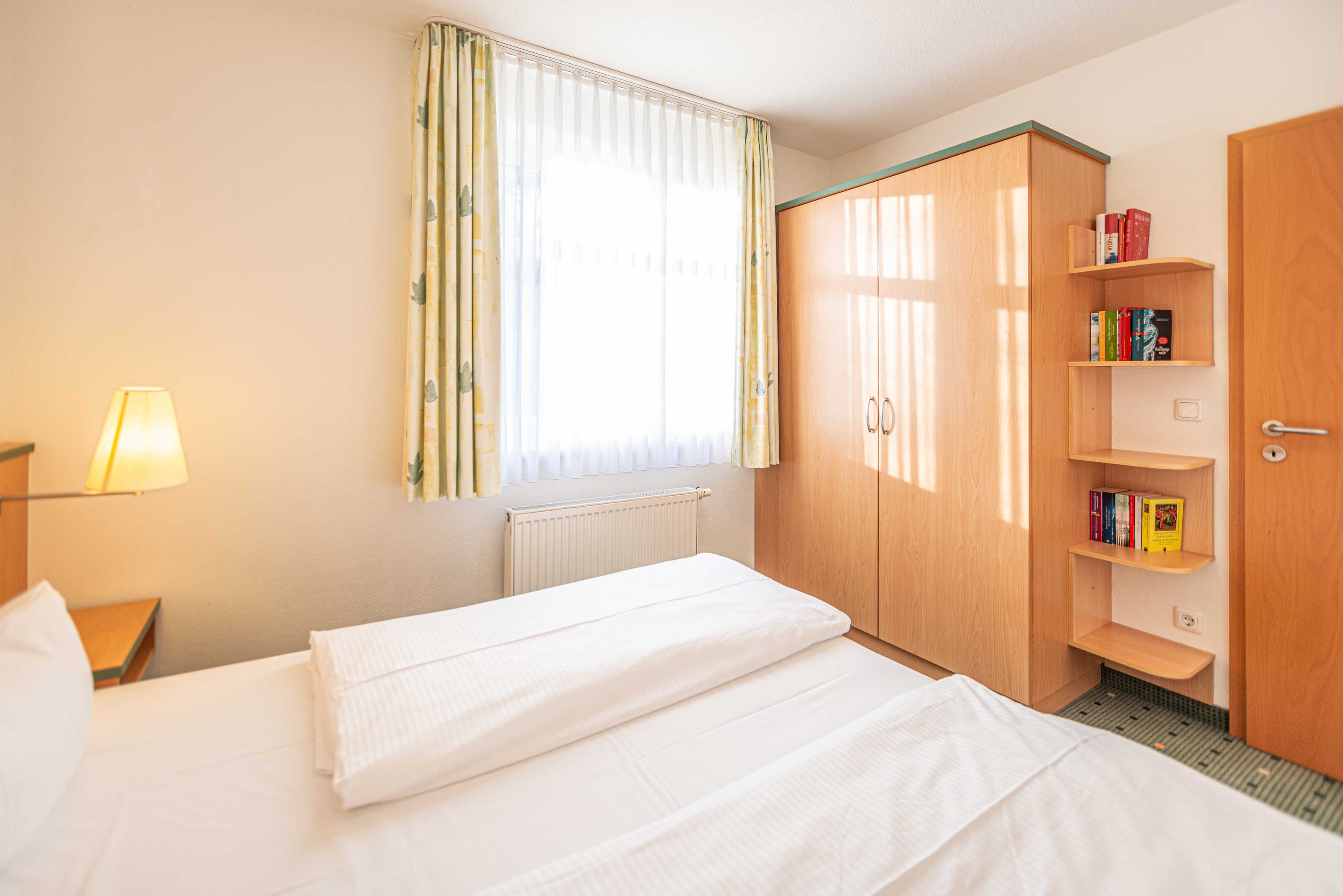 Das 3-Zimmer-Apartment mit Teppichboden befindet sich in der 1.Etage des Apartmenthauses Waldeck. Mit rund 55 m² Wohnfläche und einem Balkon zur Südseite mit Blick zum Stadtwald (sehr ruhige Lage), besteht das geräumige Apartment aus einem Wohnzimmer mit Schlafcouch und einer voll ausgestatteten Küchenzeile mit Geschirrspülmaschine, Kühlschrank, Mikrowelle, Zwei-Platten-Cerankochfeld, Kaffeemaschine, Wasserkocher und einem Toaster. Das Schlafzimmer verfügt über ein Doppelbett sowie ein weiteres Schlafzimmer mit Etagenbett. Im Badezimmer befindet sich eine Badewanne, ein Fön wird Ihnen zur Verfügung gestellt. Das Apartment ist für maximal 4 Personen geeignet.
