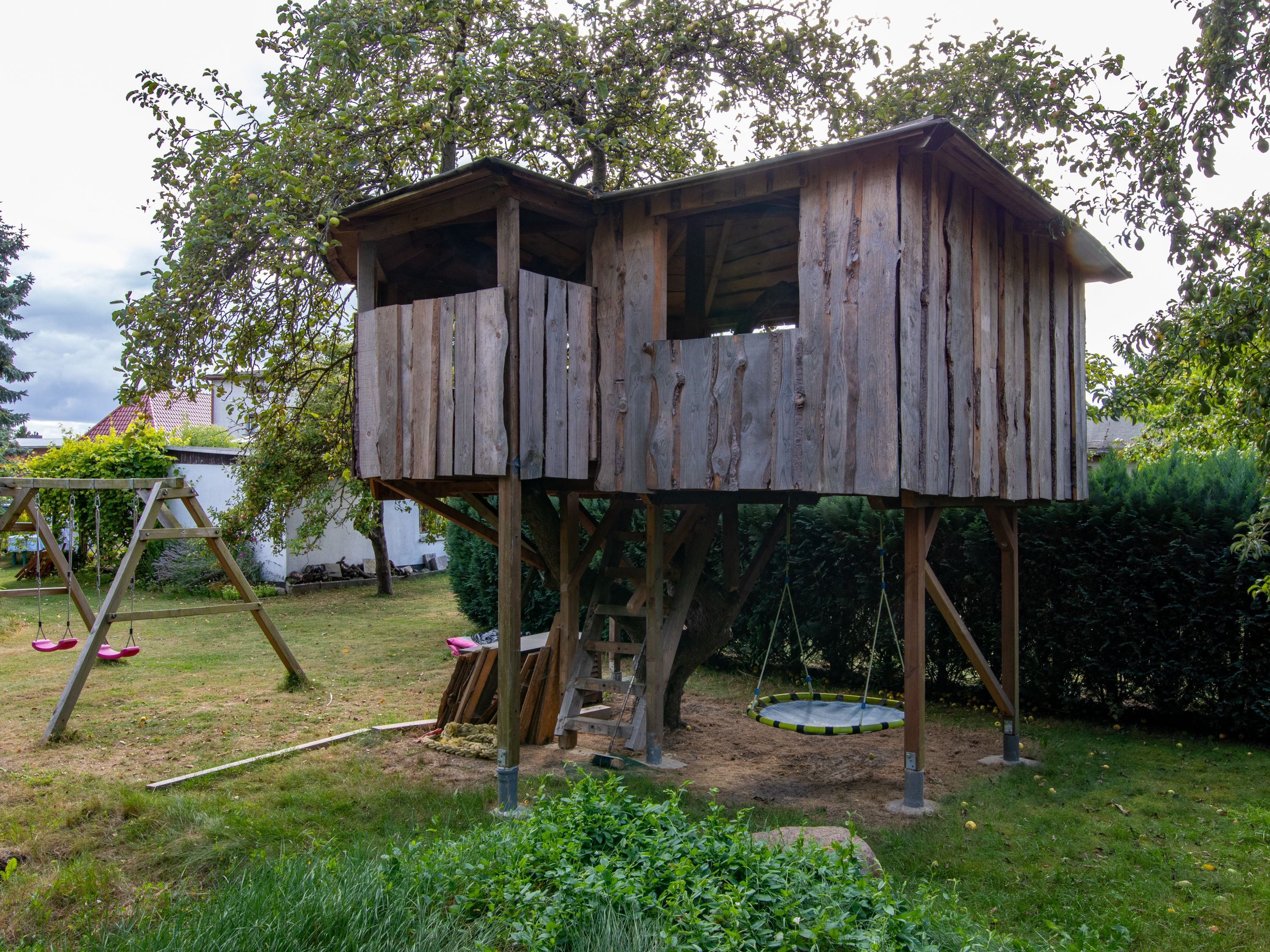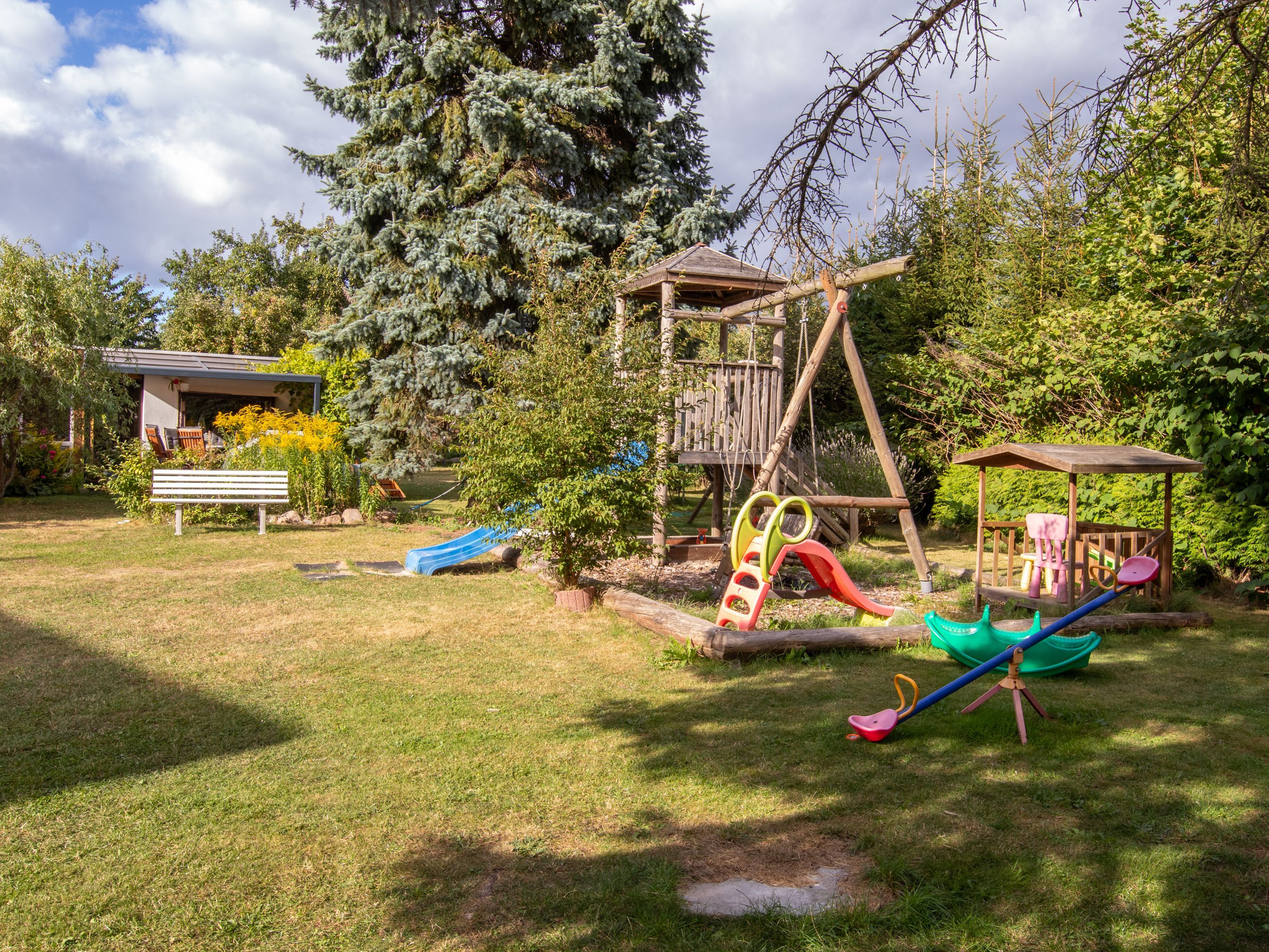 Weiterhin befinden sich im Garten Gartenstühle und Tisch, zwei Sonnenliegen, eine Grillmöglichkeit sowie ein Kinderspielplatz mit Trampolin.