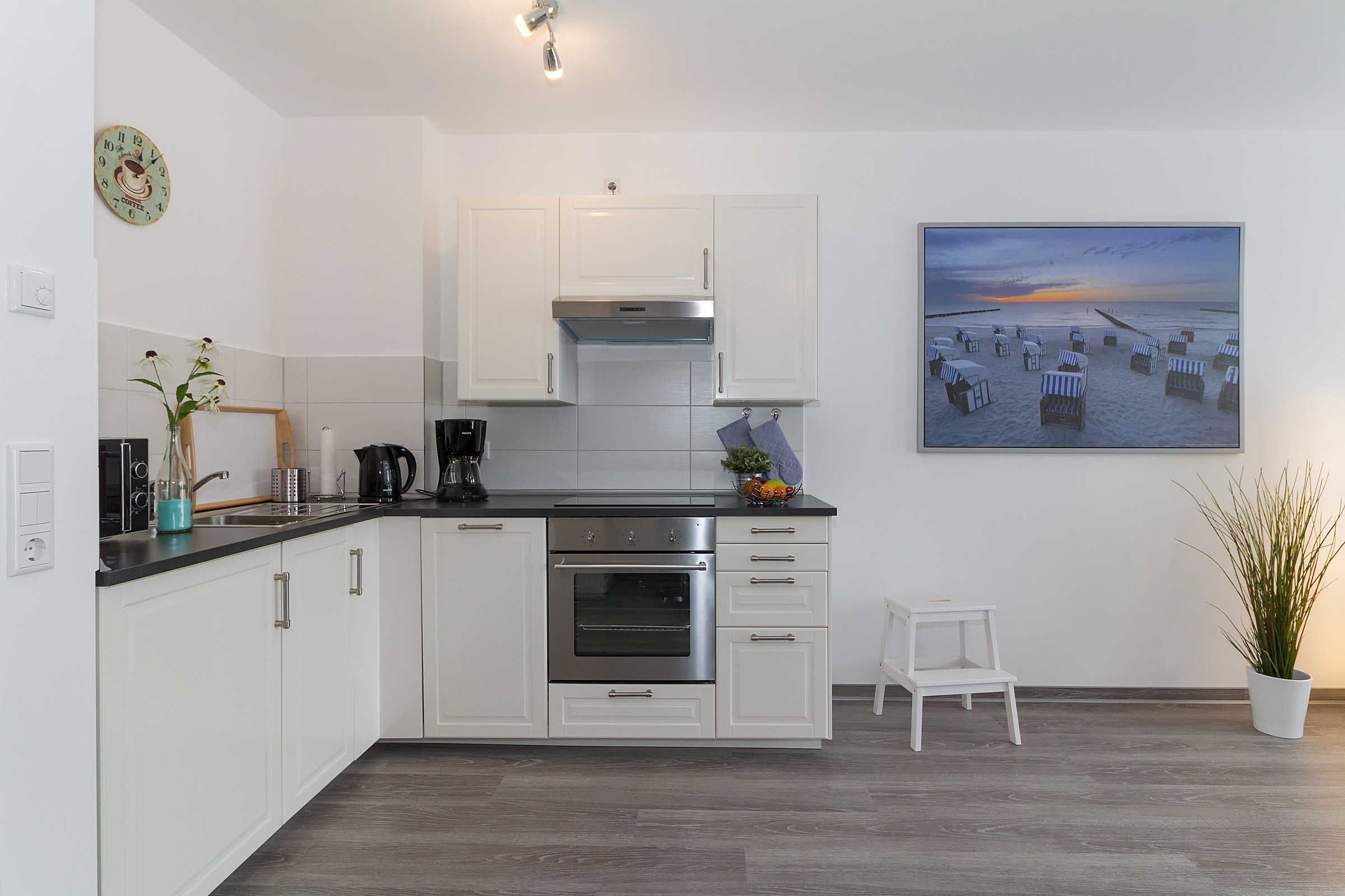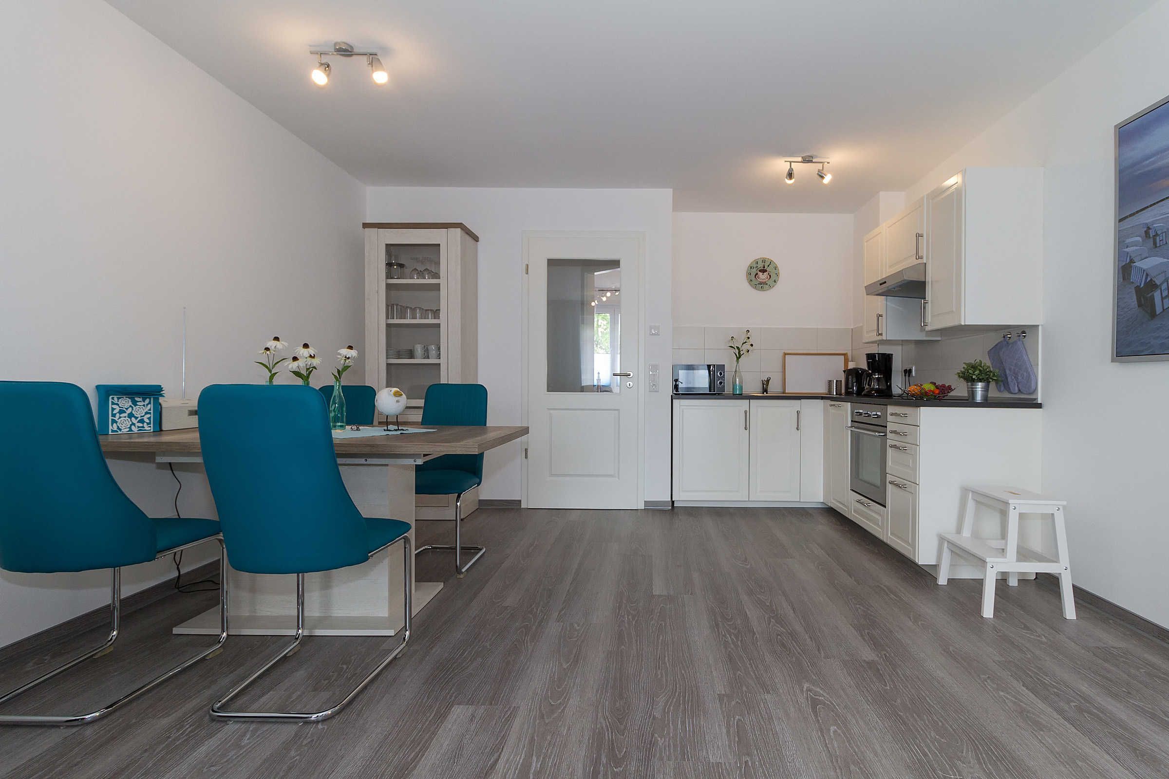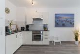 Die offene voll ausgestattete Küche verfügt neben ausreichend Geschirr, 4-Platten-Cerankochfeld, Backofen und Mikrowelle, auch über einen Geschirrspüler, Wasserkocher, Toaster, Kaffeemaschine. Eine Sitzgruppe bietet allen Gästen einen bequemen Platz zum gemeinsamen Speisen.