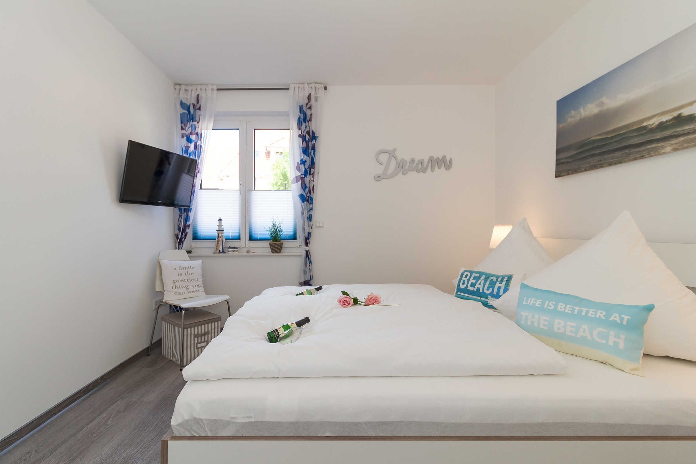 Das größere der beiden Schlafzimmer verfügt über ein Doppelbett (1,80 x 2,00m), einen Kleiderschrank, einen zweiten TV, sowie Verdunklungsmöglichkeiten durch Außenrollos. Ein Babybett für den kleinsten Besucher ist hier zustellbar.