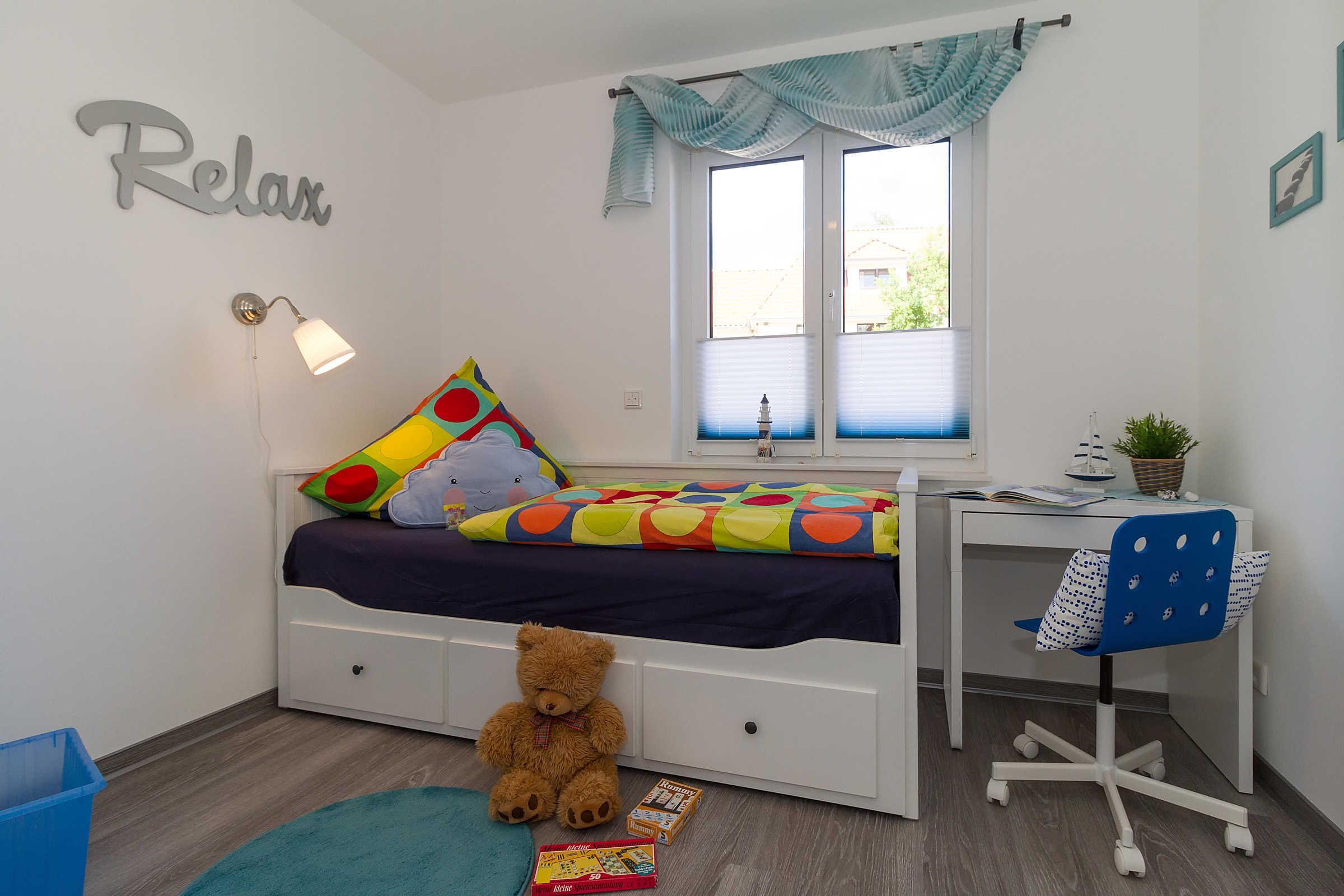 Das zweite Schlafzimmer verfügt über ein Einzellbett (0,80 x 2,00m) welches bei Bedarf auf die doppelte Größe ausziehbar ist (dann 1,60 x 2,00). Auch hier ist neben einem Tisch ein Kleiderschrank vorhanden.