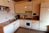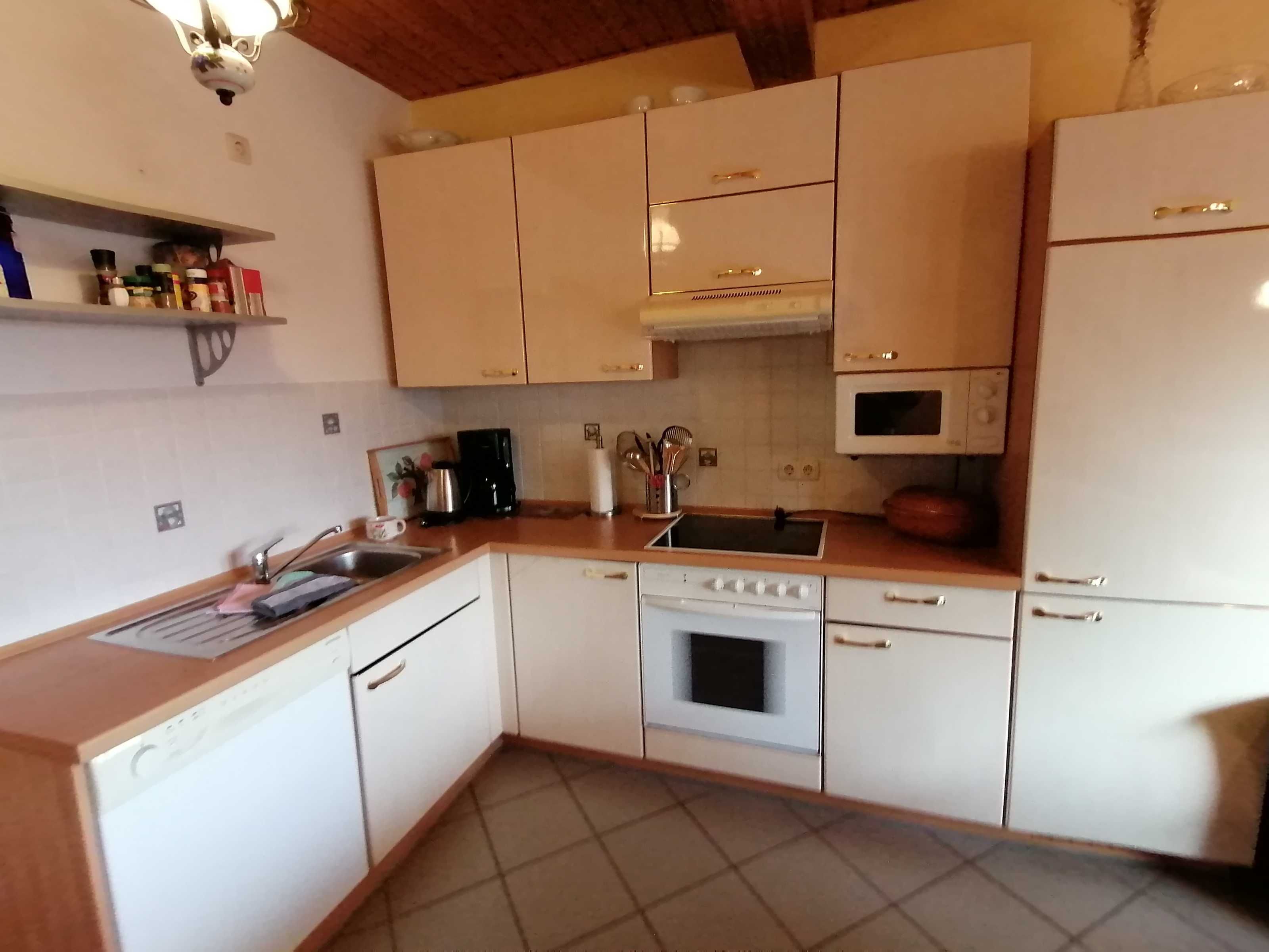 Der Küchenbereich ist mit einer modernen Küchenzeile (Kühl-/Gefrierkombi, Backofen, Spüler, Mikrowelle und Herd mit Backofen) und einem großen Esstisch ausgestattet. Von einer gemütlichen Sitzecke aus im Wohnbereich blicken Sie auf die Terrasse bzw. in den Garten.