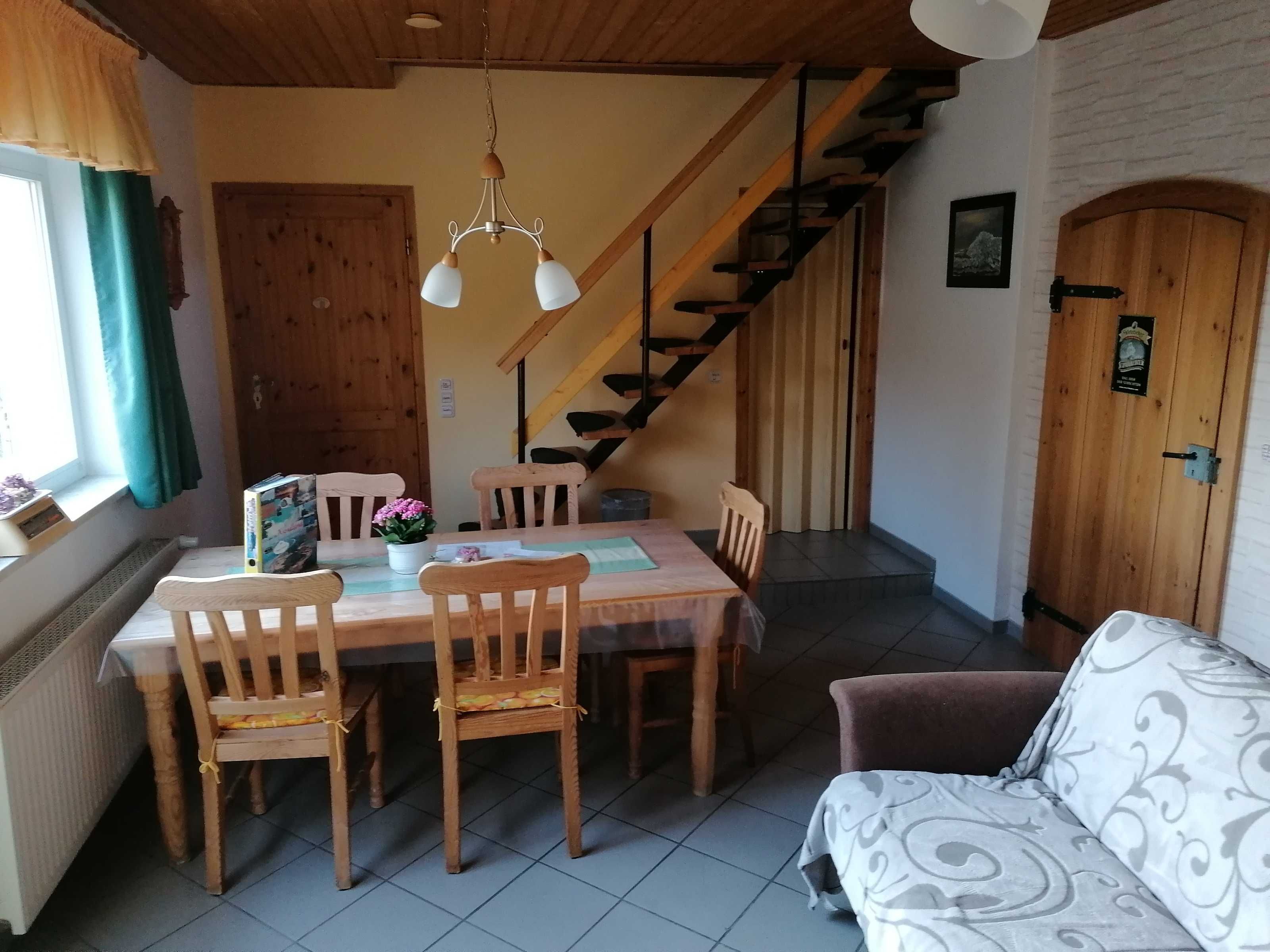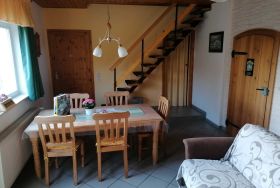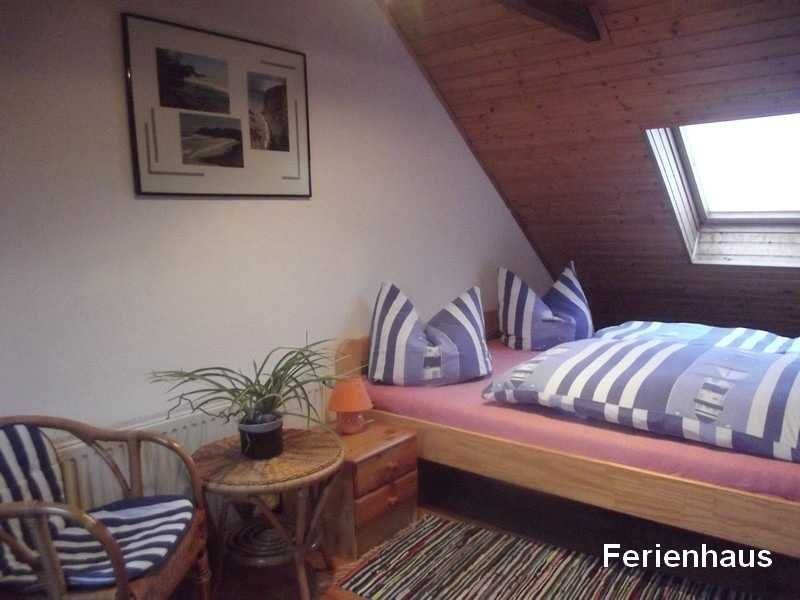 Das Ferienhaus besteht aus der zweiten Haushälfte des Vermieterhauses und ist ca. 83 qm groß und für 2-6 Personen (+1 Kind bis 2 Jahre) geeignet. Ausstattung: Parterre: Fußbodenheizung, große Wohnküche mit Spülmaschine, Backherd, Mikrowelle, TV, Radio, Ausziehcouch, Eßtisch, Bad und seperates WC und seperate Dusche, Waschmaschine (Münzer) 1. Etage: 1 Doppelzimmer, zwei 2-Bettzimmer, (Dachschräge, Kinderbett auf Wunsch vorhanden. Ein 300 qm großer Garten lädt zu gemütlichen Stunden im Freien ein. Bettwäsche und Handtücher vor Ort sind gegen Gebühr mietbar.