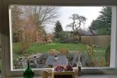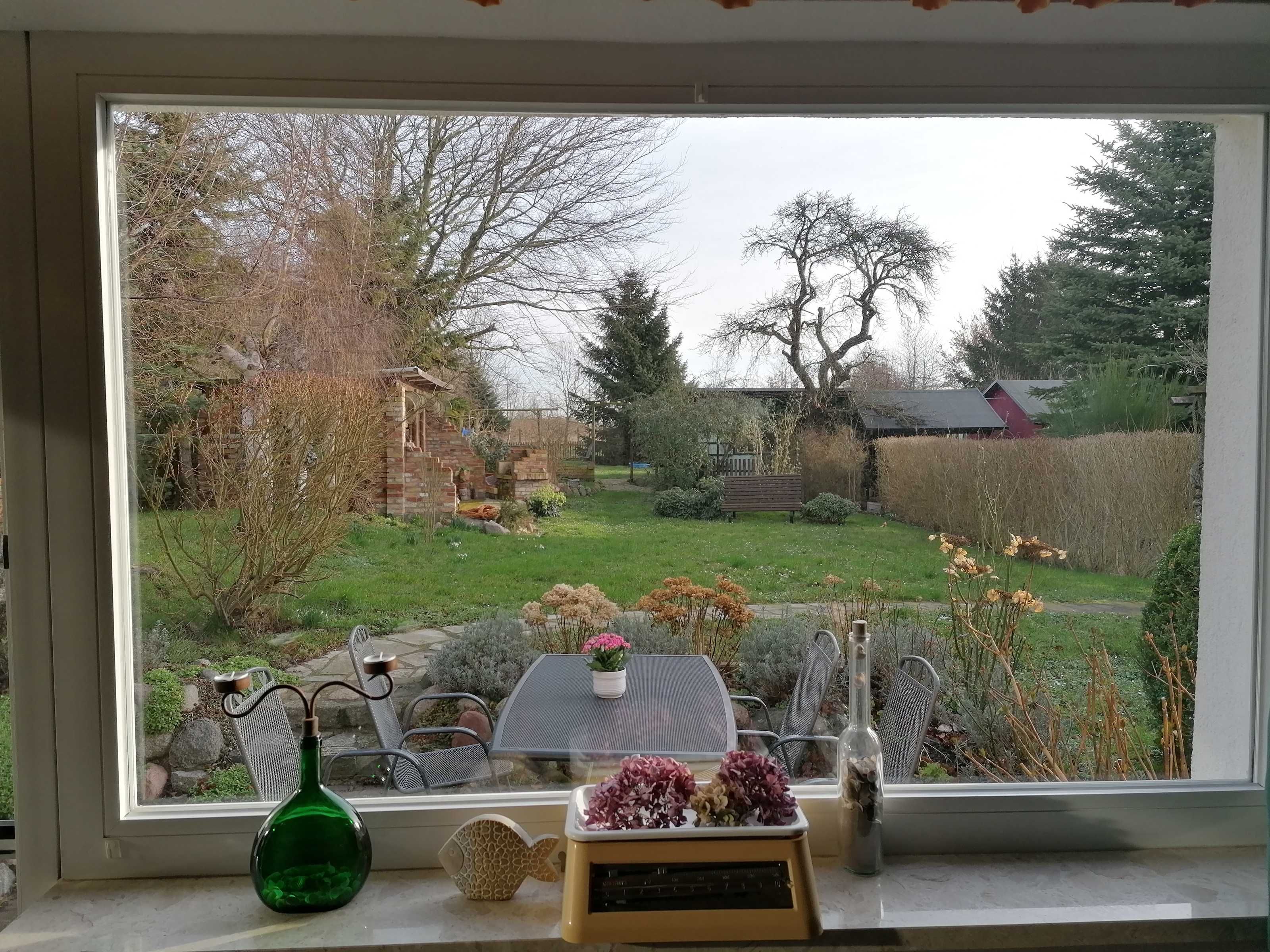 Von der Küche blicken Sie in einen gepflegten Garten.