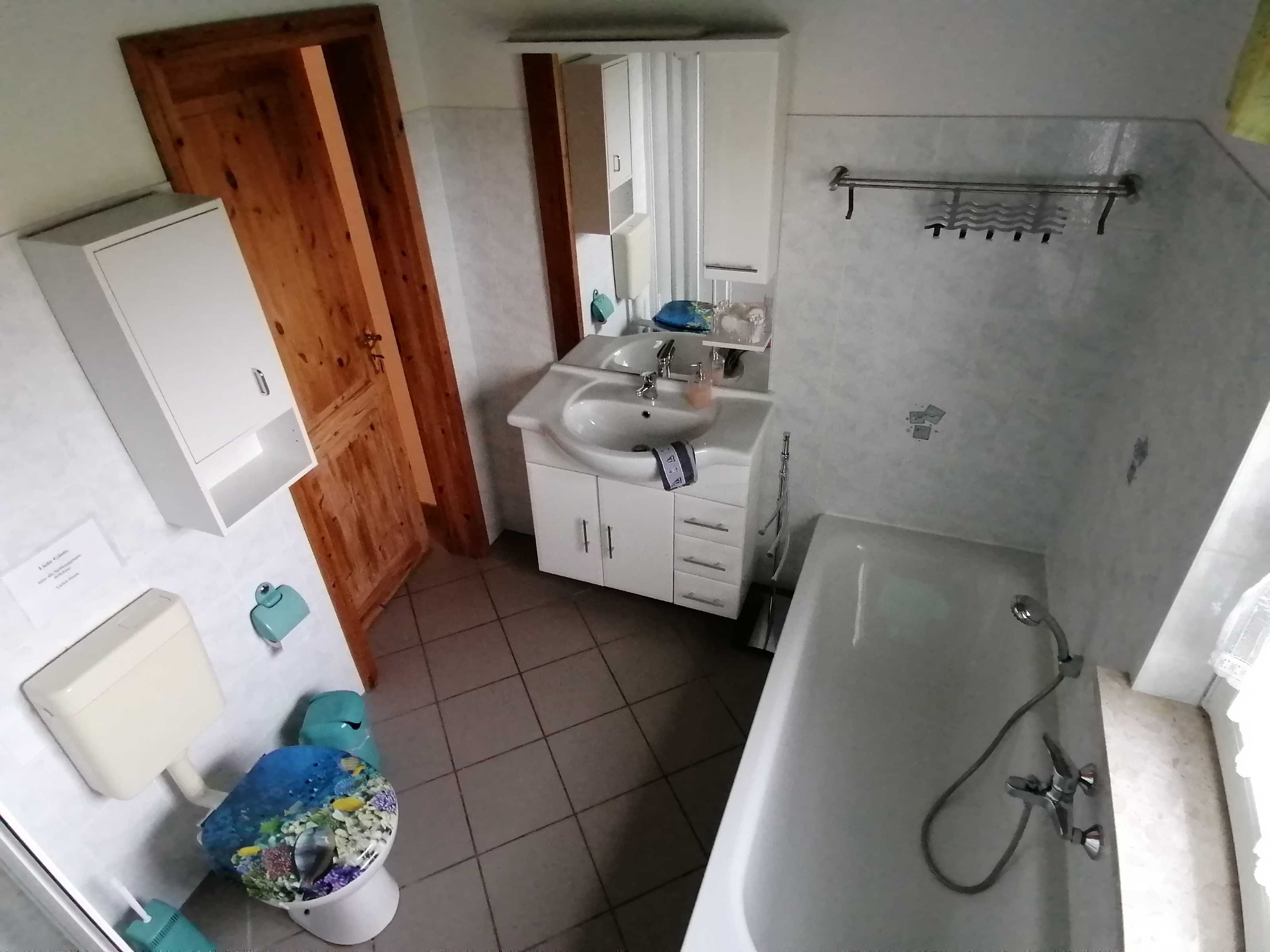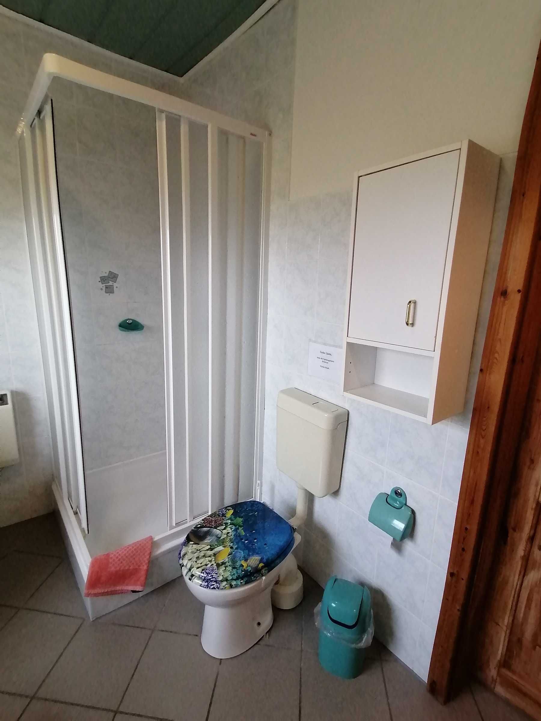 Im Erdgeschoss befinden sich ein Bad (mit Dusche, WC, Badewanne und Münzwaschmaschine) als auch eine weitere Toilette und Dusche.
