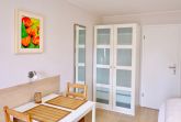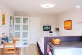 Wohn-/Schlafraum mit hochwertigem Hotelboxspringbett mit Bandscheiben-Federkernmatratze (1,60 m x 2 m), Kleiderschrank, Kommode, Spiegel, Essecke, LCD-Fernseher (SAT-TV/Radio), komplett ausgestattete Küchenzeile mit 2-Plattenkochfeld, Mikrowelle mit Grill- und Heißluftfunktion, Geschirrspülmaschine und Kühlschrank mit Eisfach, Bad mit Dusche, WC, Handtuchheizung, Haartrockner und Kosmetikspiegel, Ost-Terrasse mit modernem Mobiliar