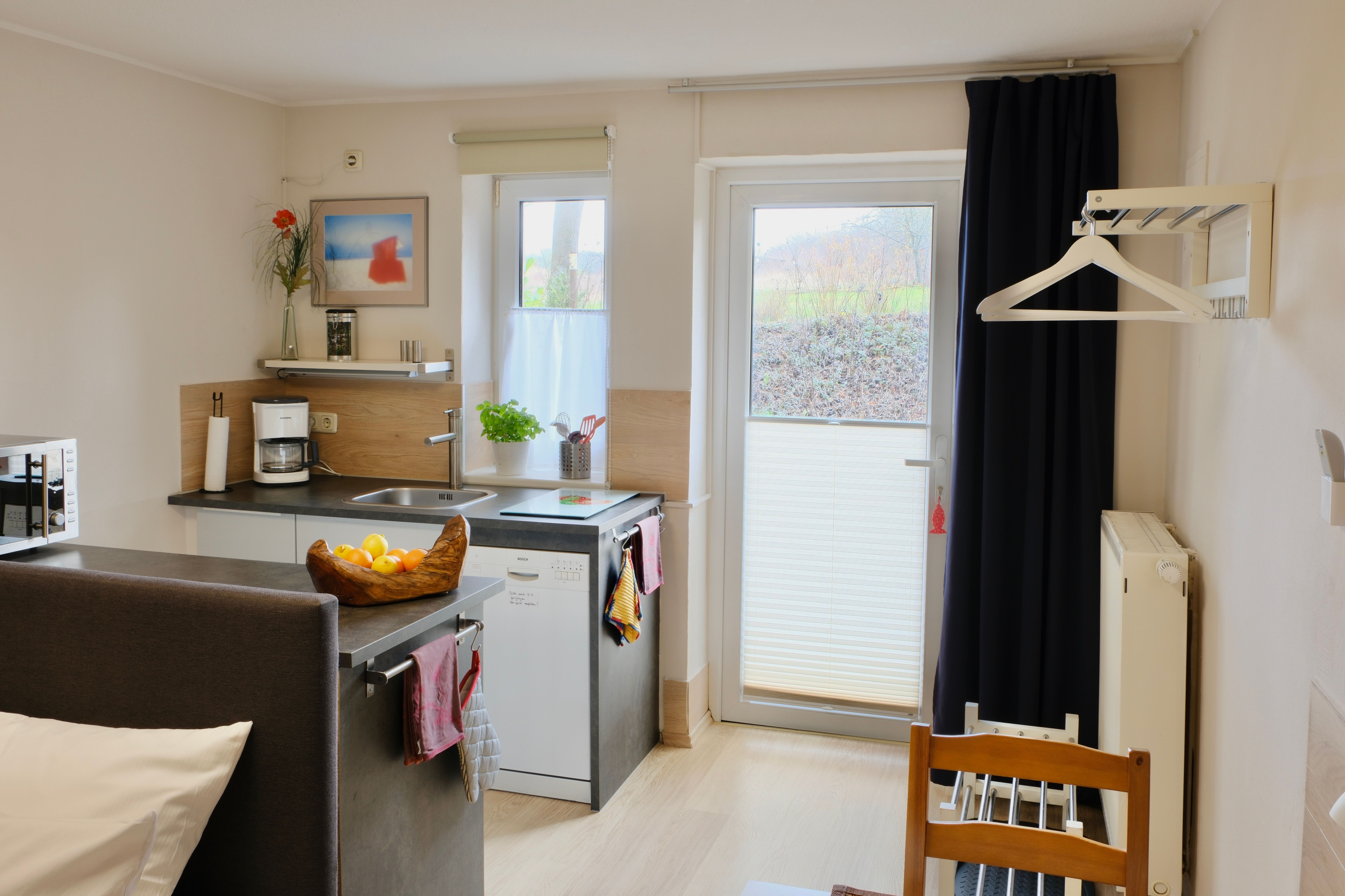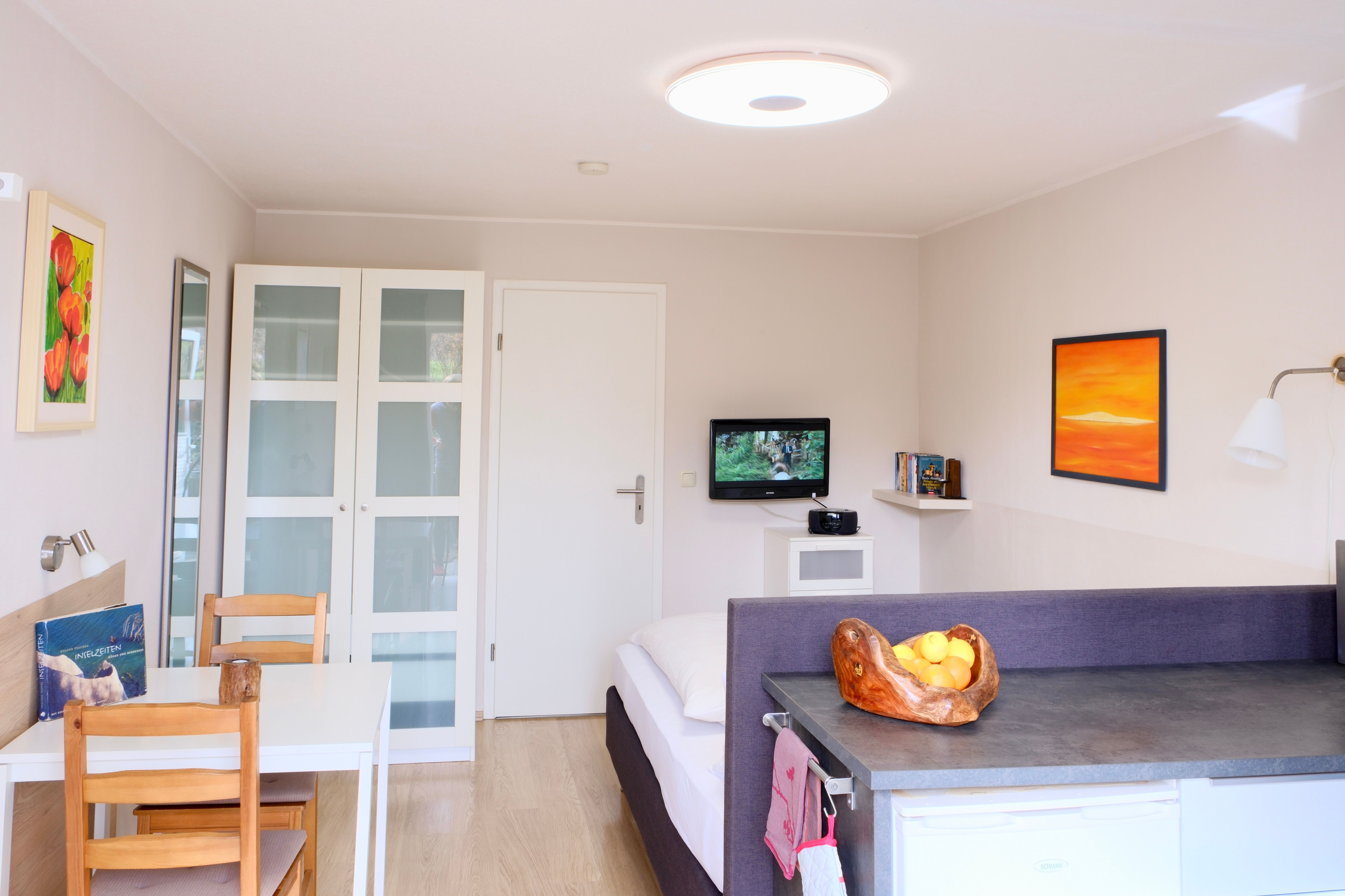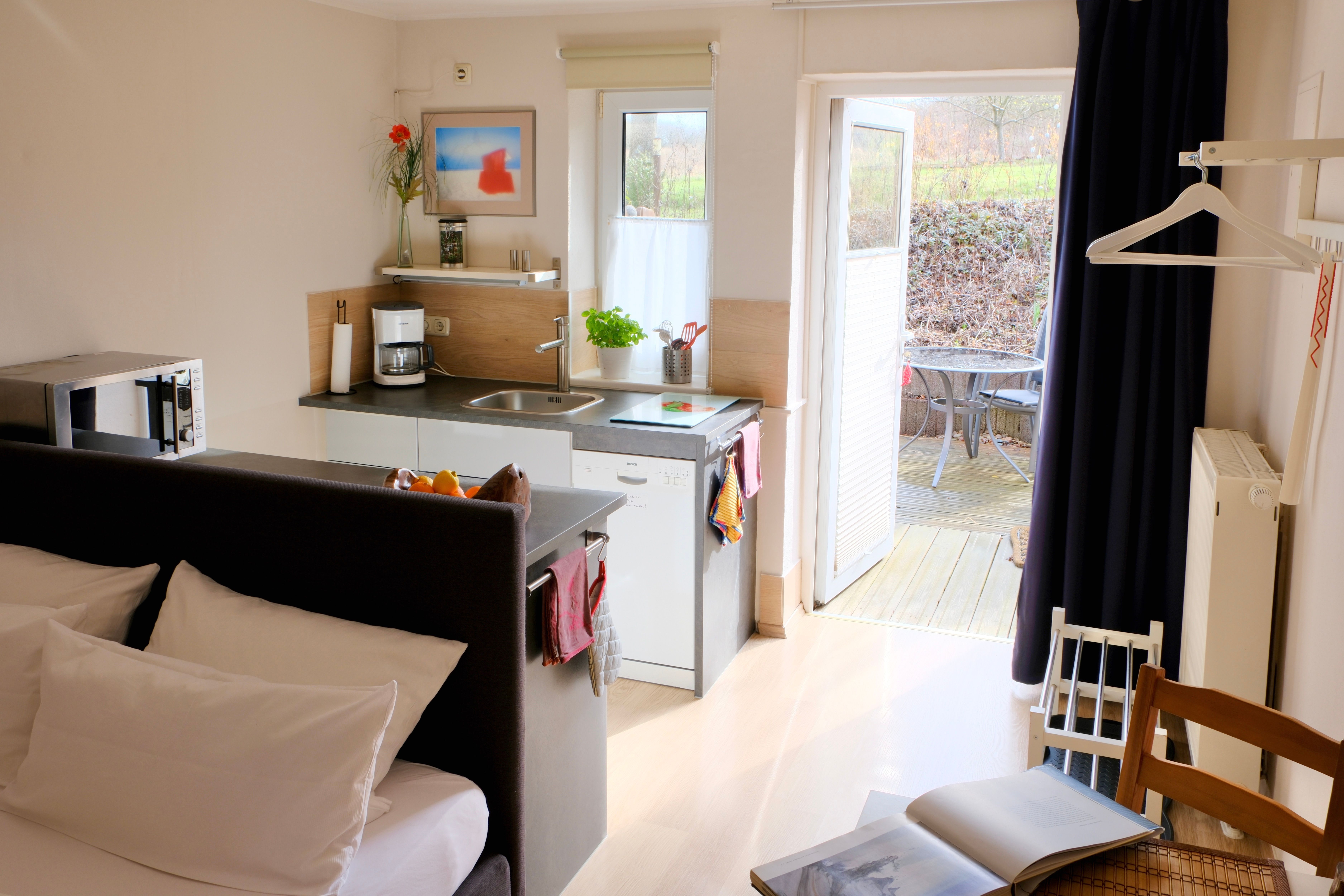 Das Studio Klatschmohn ist eine 20 qm große 1-Raum-Wohnung für 1 - 2 Personen und besteht aus einem kombinierten Wohn-/Schlafraum mit integrierter Küchenzeile, Bad, Terrasse (8 qm).