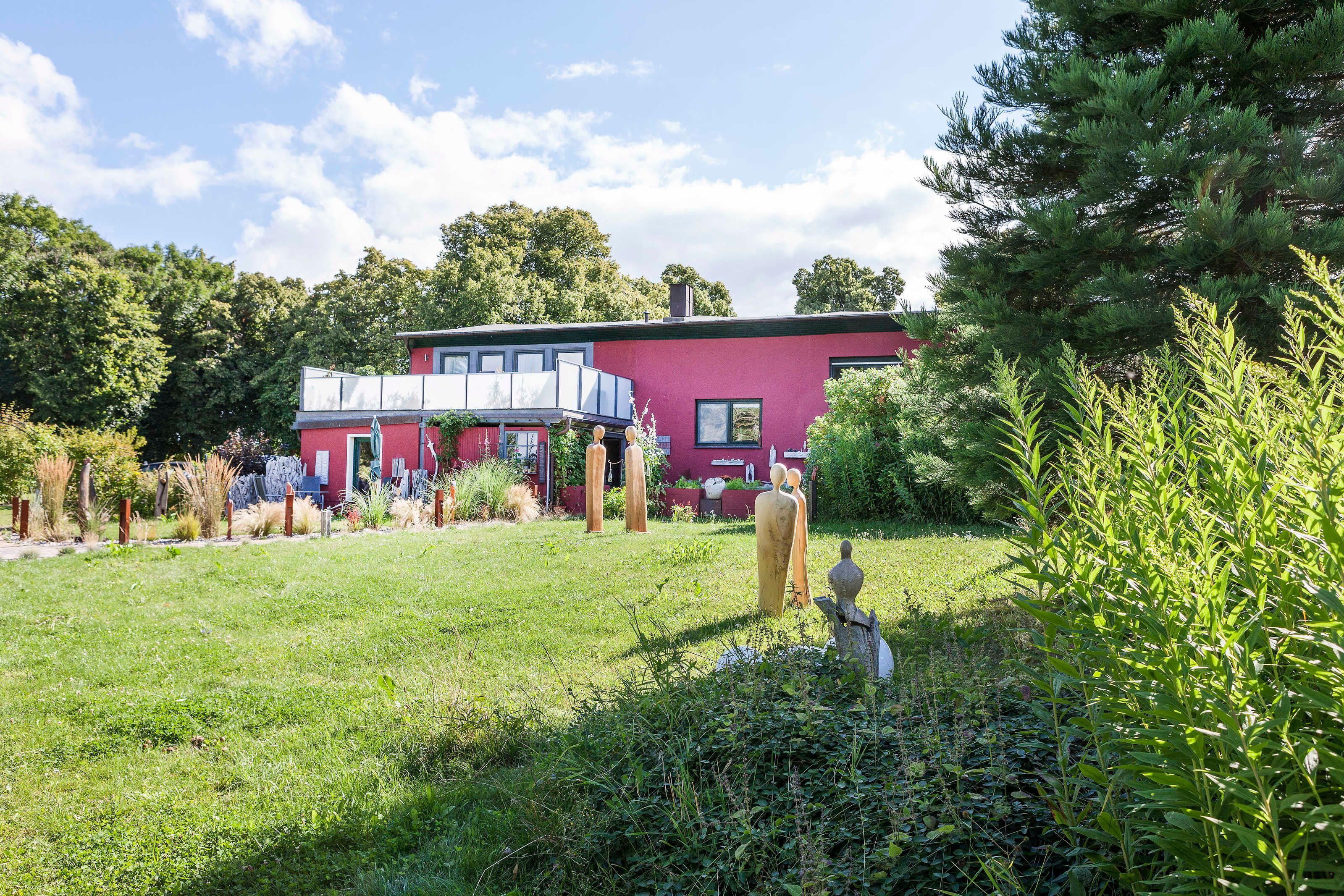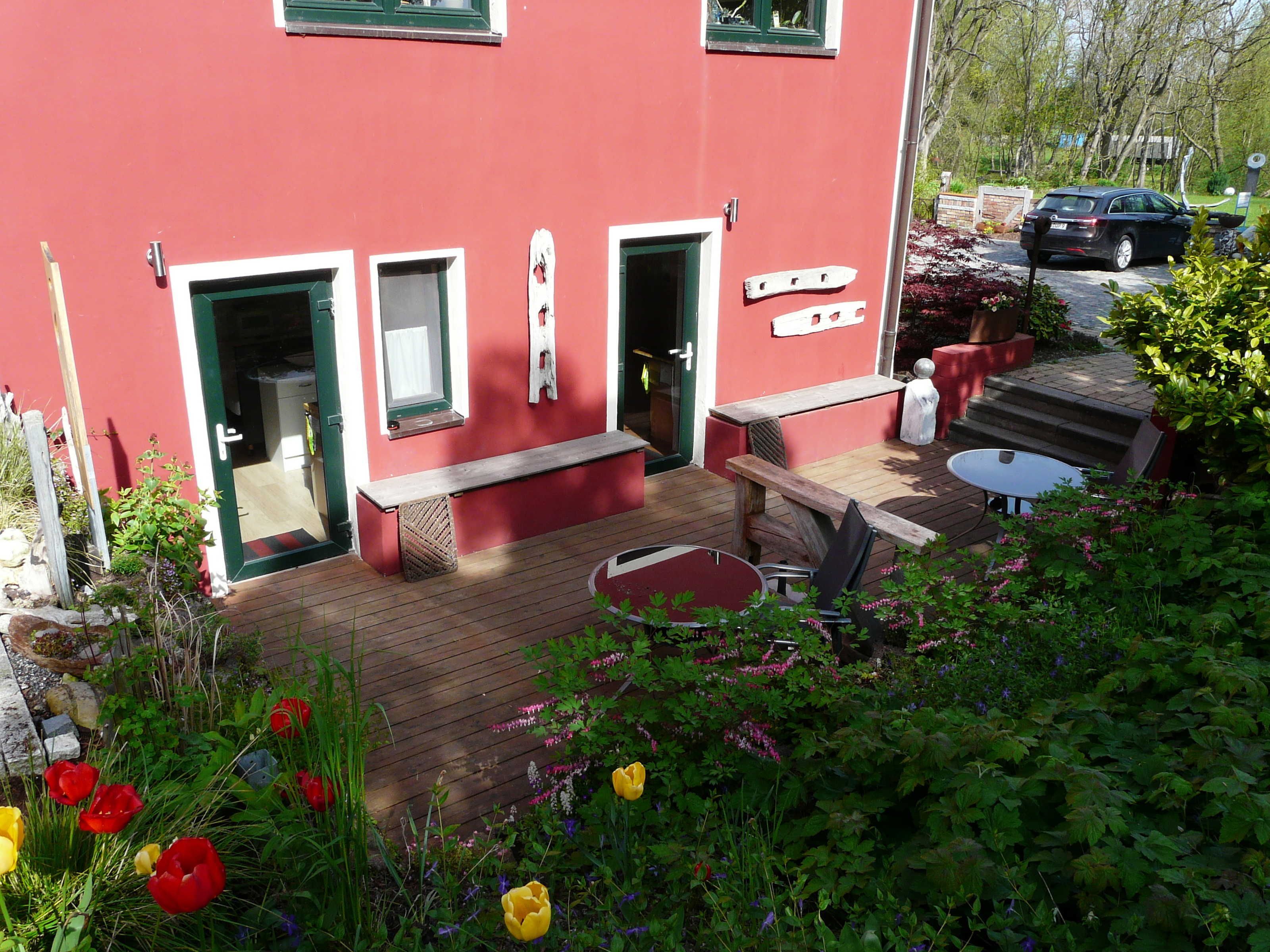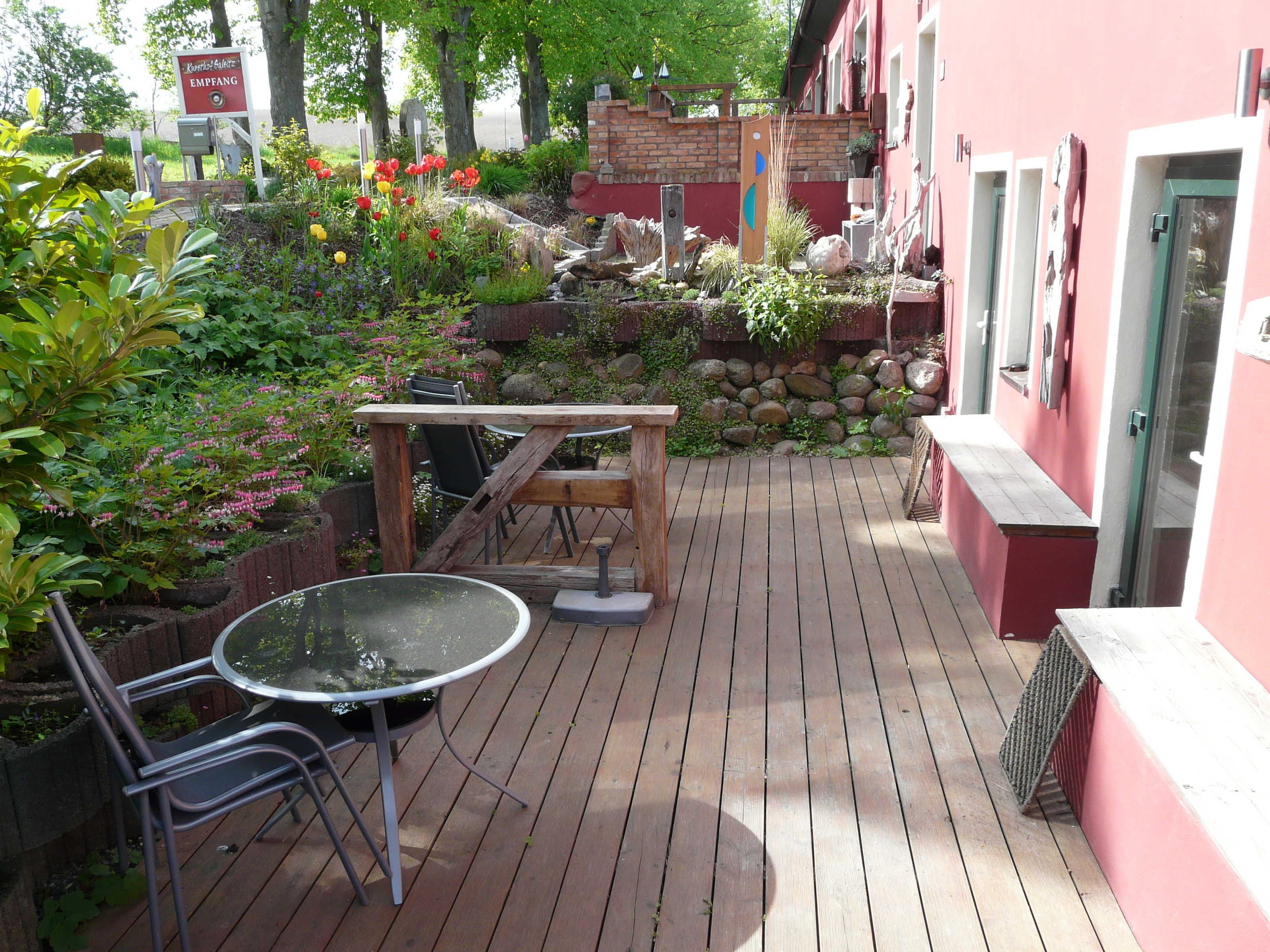 Zu jeder Wohnung gehört eine Außenterrasse mit Gartenmöbeln, Sonnenschirm und Grillmöglichkeit. Darüber hinaus finden Sie bei uns einen großen Natur- und Nutzgarten, in dem Sie neben vielfältig angelegten Beeten auch noch Wegrandblumen und Heilpflanzen sowie verschiedene Ruhezonen mit Sitzgruppen und Liegen zum Entspannen finden. Manchmal ganz offensichtlich, bisweilen recht versteckt können Sie im Garten Kunstobjekte des Hausherren entdecken und bei Gefallen käuflich erwerben.