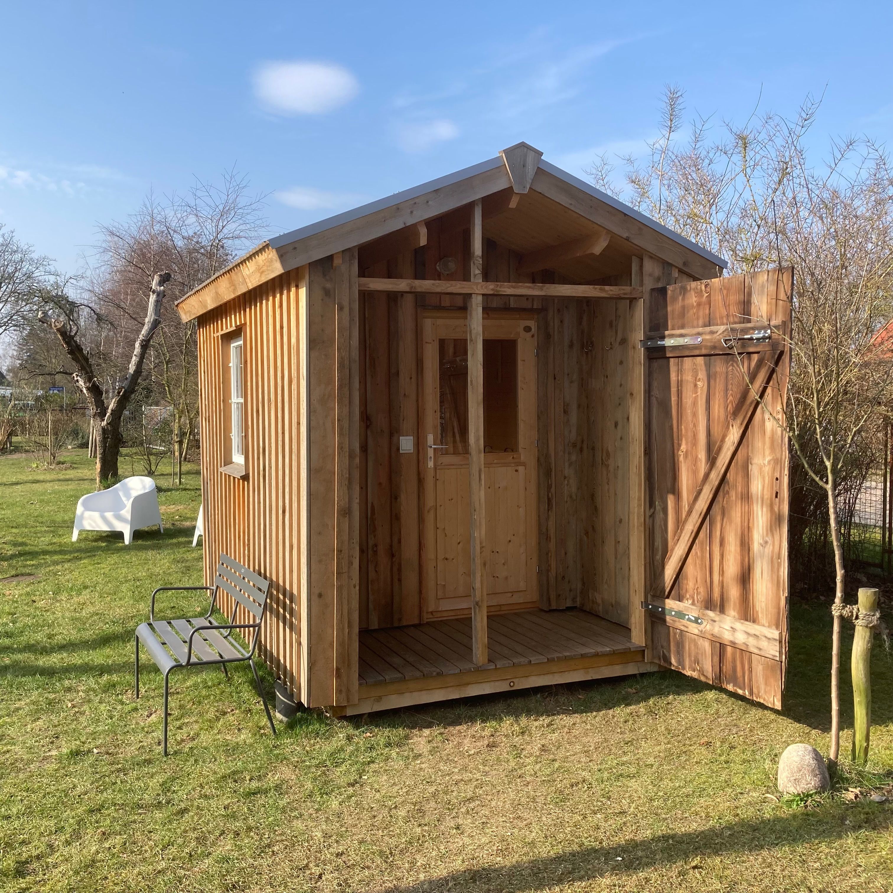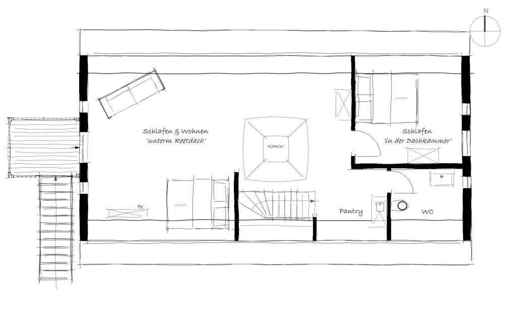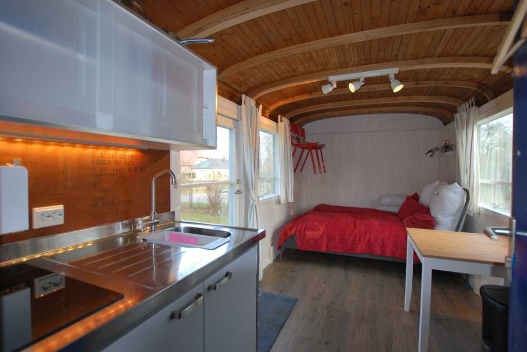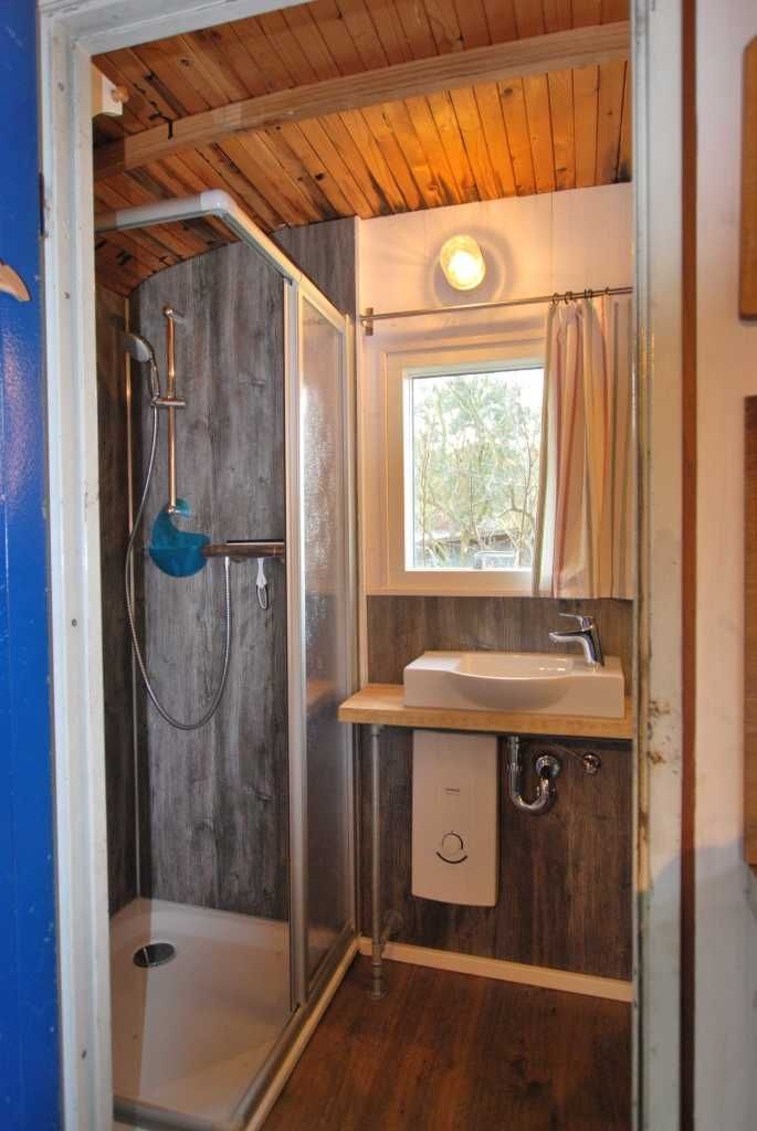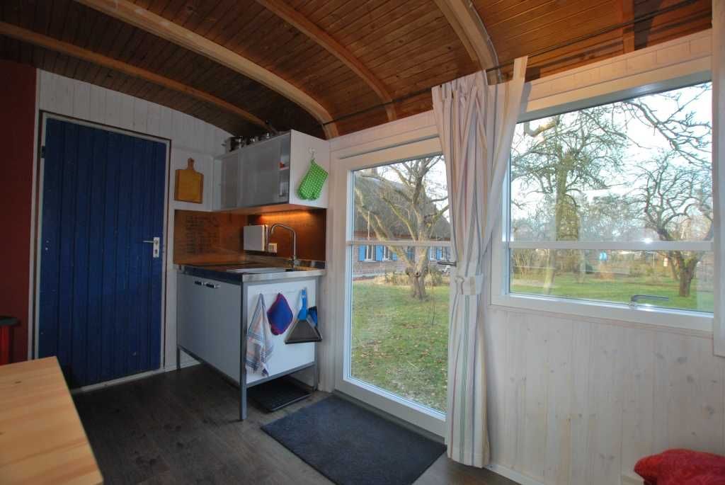 Auf 14 qm finden sie allen Komfort: ein Doppelbett (160x200), eine Küchenzeile mit Kühlschrank,Wasserkocher, Doppelherdplatte, sowie ein kleines Bad mit Dusche und WC. Ab einer Buchung von 7 Personen stellen wir ihnen den Bauwagen zur Verfügung.