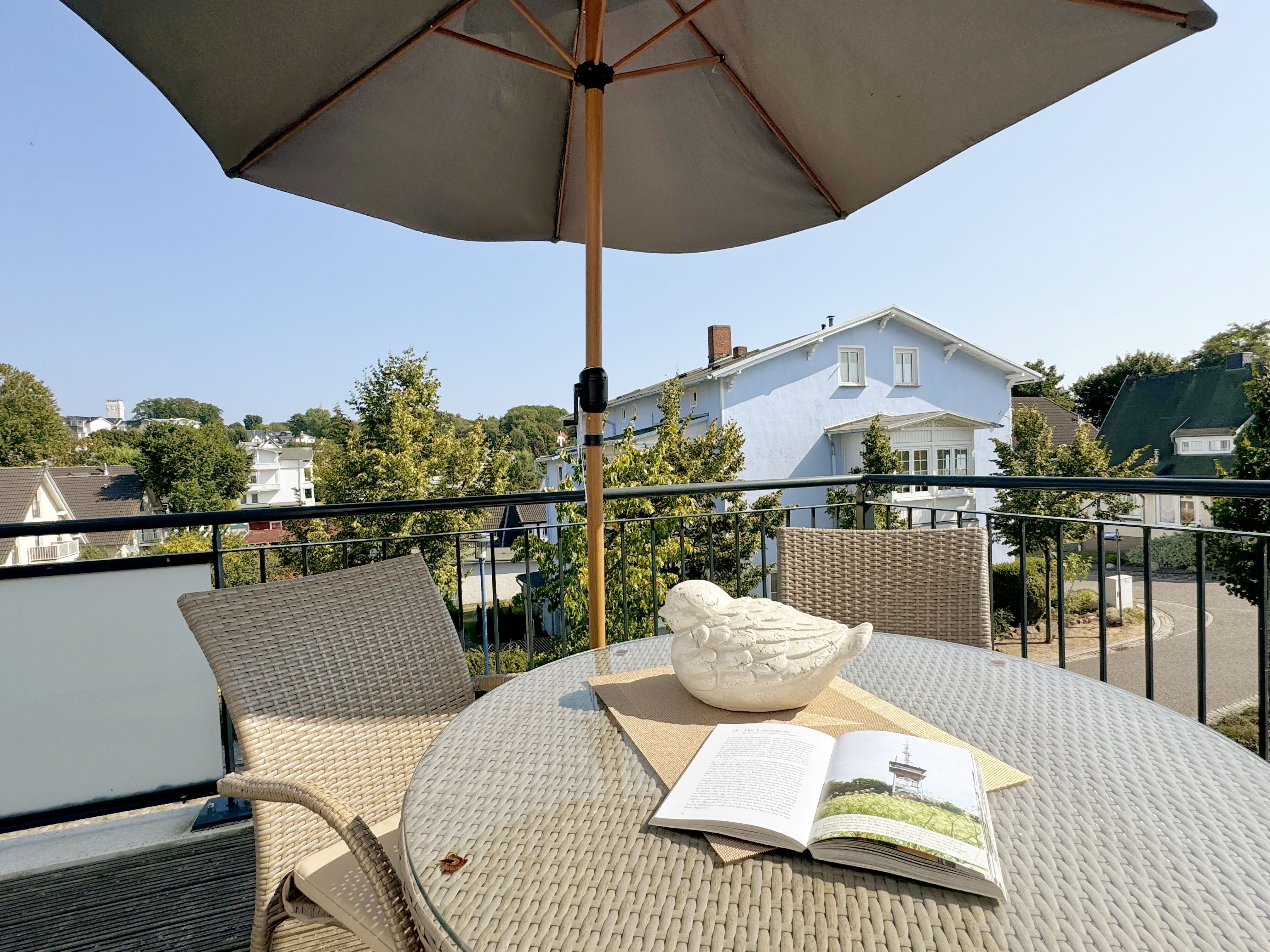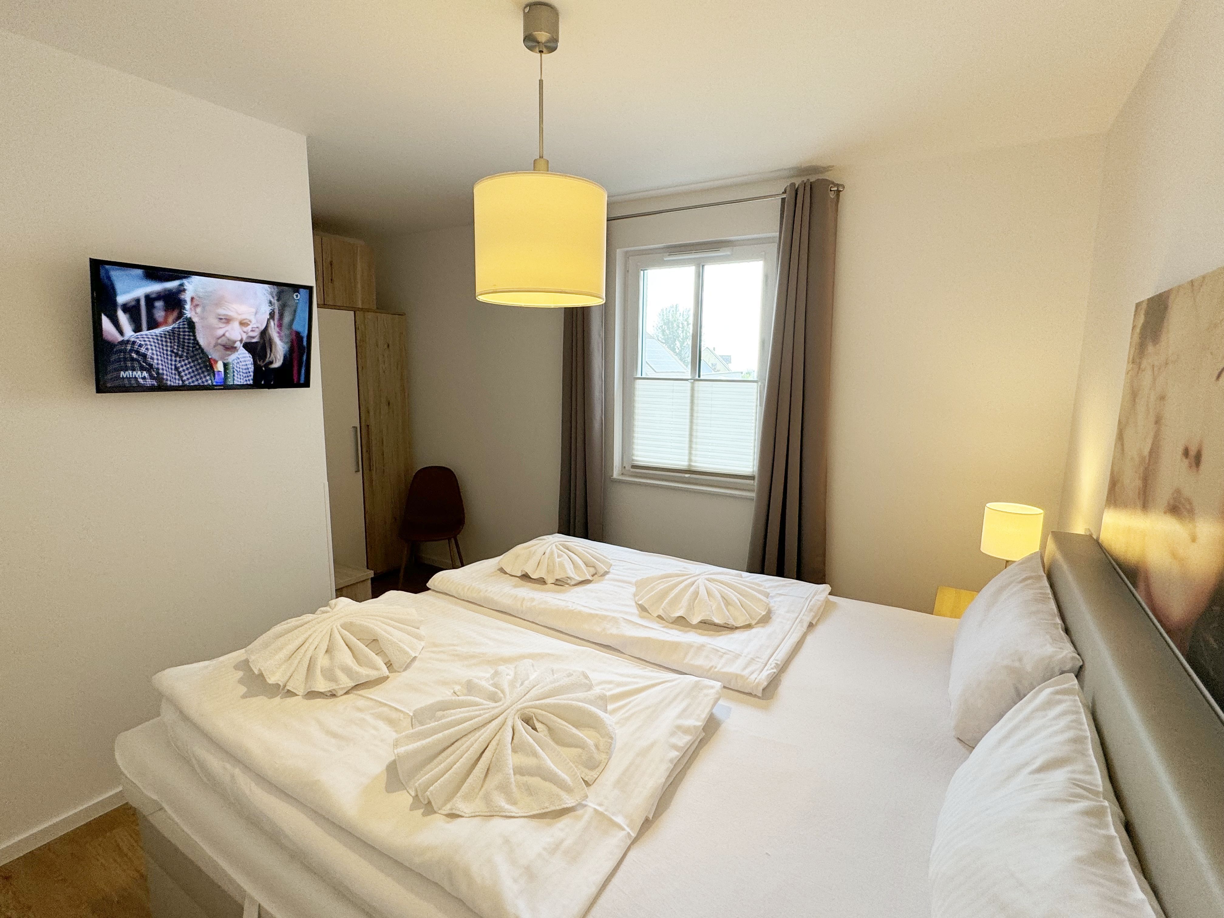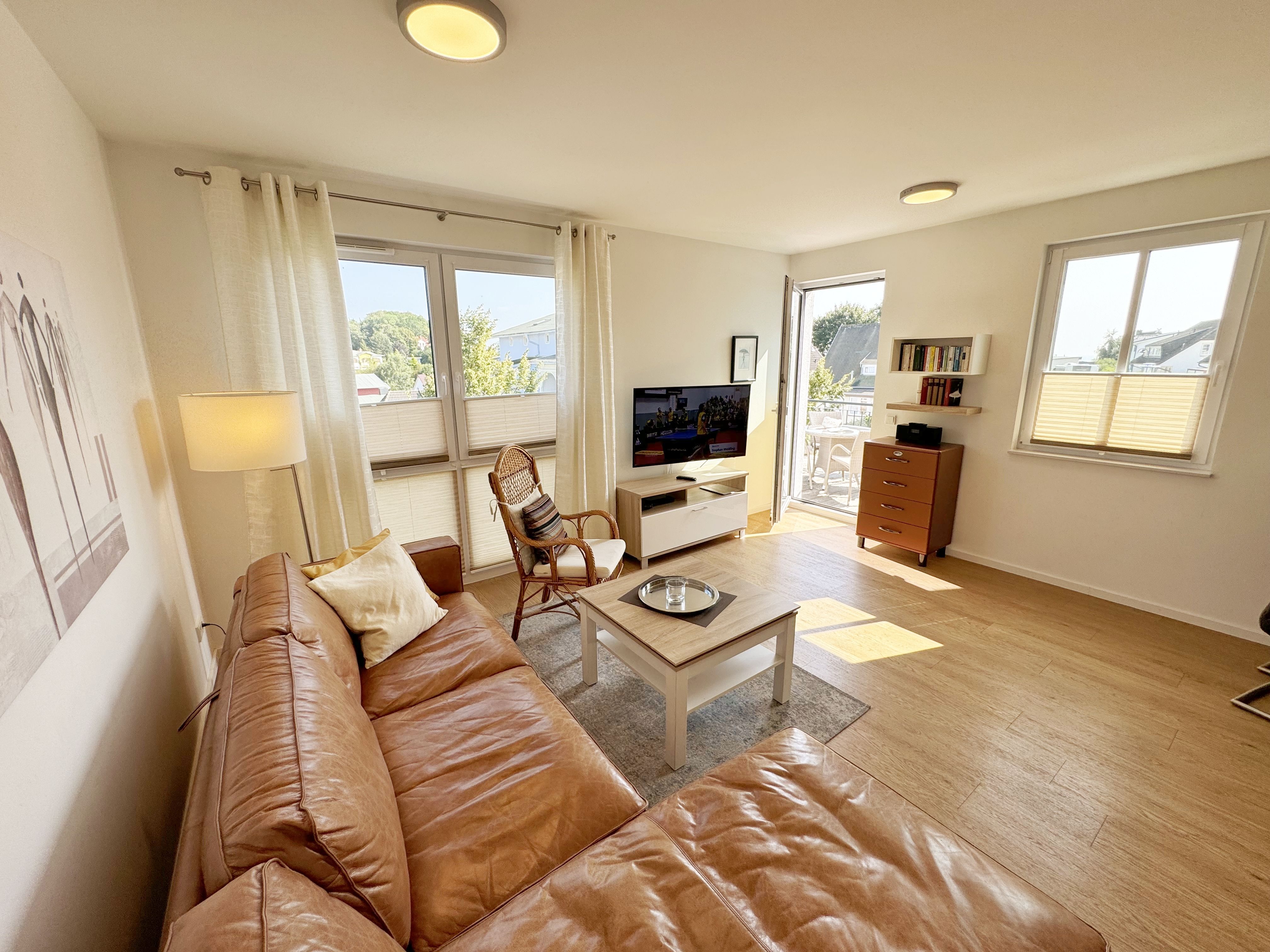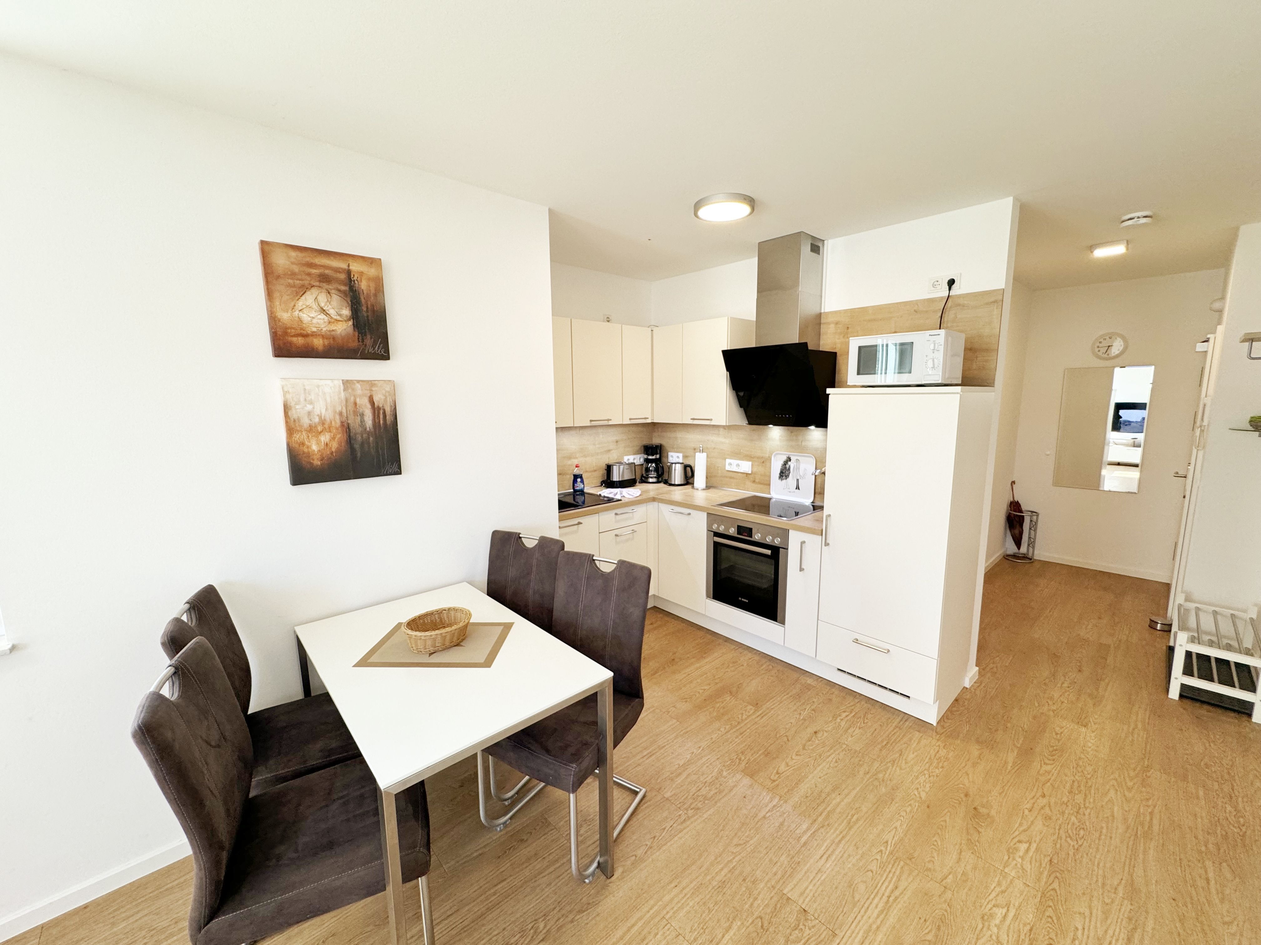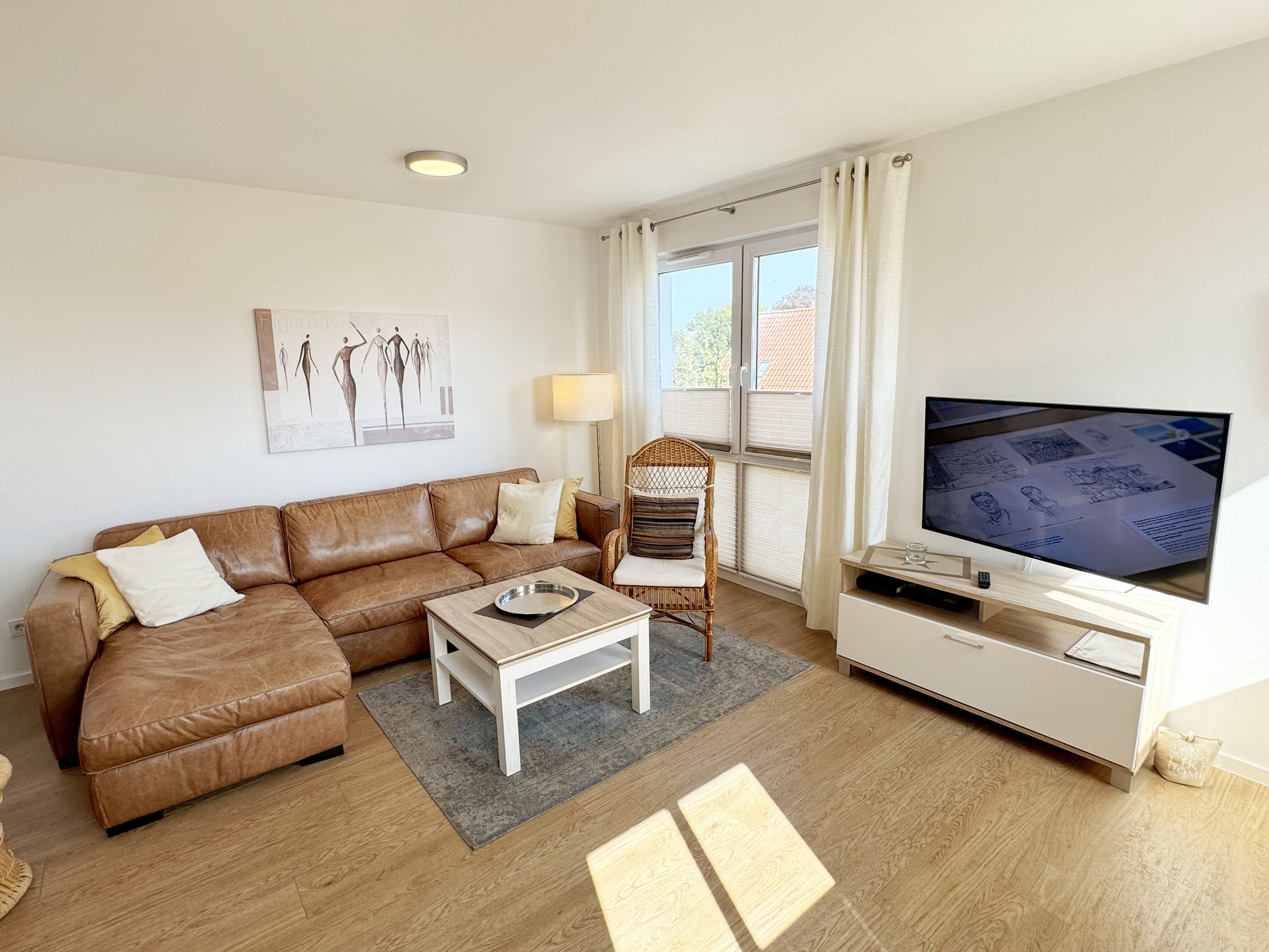 Die Wohnung Nr. 4 der Villa Anni ist eine komfortable, ca. 57 m² große und stilvoll eingerichtete Nichtraucherferienwohnung im ersten Obergeschoss. Sie bietet Ihnen ausreichend Platz für 2 bis 3 Personen. Der kombinierte Wohn-/Koch- und Essbereich mit der modernen und integrierten Küchenzeile lässt mit Ceranfeld, Backofen, Geschirrspüler, Mikrowelle, Kühlschrank mit Gefrierfach, Kaffeemaschine, Wasserkocher, Toaster und diversen Küchenutensilien keine Wünsche offen. Der Essbereich fügt sich der Küchenzeile an. Der offene Wohnbereich verfügt über eine gemütliche Sitzecke (Liegefläche 1,50m x 2,00m) mit Couchtisch, eine Leselampe, ein TV mit CD-Player, DAB-Radio und einen Blu-Ray Player. Auch auf einen Internetanschluss (WLAN) müssen Sie in Ihrem Urlaub nicht verzichten. Dieser ist für Sie inklusive! Eine Auswahl an Gesellschaftsspielen und Urlaubslektüre sorgt für eine gelungene Abwechslung. Der nach Nord/Osten mit Blick Richtung Meer ausgerichtete, und bestuhlte Balkon mit Sonnenschirm ist direkt vom Wohnbereich aus zu erreichen. Das Schlafzimmer verfügt über ein Boxspringbett mit Tonnentaschenfederkernmatratzen (1,80m x 2,00m), Nachttischablagen, Flachbild-TV und einen Kleiderschrank. Für einen ruhigen Schlaf sorgt eine Verdunklungsmöglichkeit sowie ein Insektenschutzgitter. Das Bad ist mit einer ebenerdigen Dusche, Waschplatz, Kosmetikspiegel, WC, Handtuchheizkörper und Fön ausgestattet. Im Schlafzimmer ist ein Insektenschutzgitter vorhanden. Alle Räumlichkeiten sind mit einer Fußbodenheizung versehen und sorgen für eine angenehme Wärme. Ein eigener PKW-Stellplatz (Nr. 4) befindet sich in der Tiefgarage (Einfahrtshöhe: 2,00 m) des Hauses. 1 kleiner Hund ist gegen eine Gebühr in der Wohnung erlaubt! Die Erstausstattung eines Wäschepaketes (komplette Bettwäsche, 1 Duschhandtuch, 2 kleine Handtücher) können Sie bis 14 Tage vor Anreise gegen einen Aufpreis dazu buchen oder durch eigene ergänzen. Ab 2 gebuchten Paketen erhalten Sie einmalig 1 Geschirrhandtuch und 1 Duschvorleger hinzu.