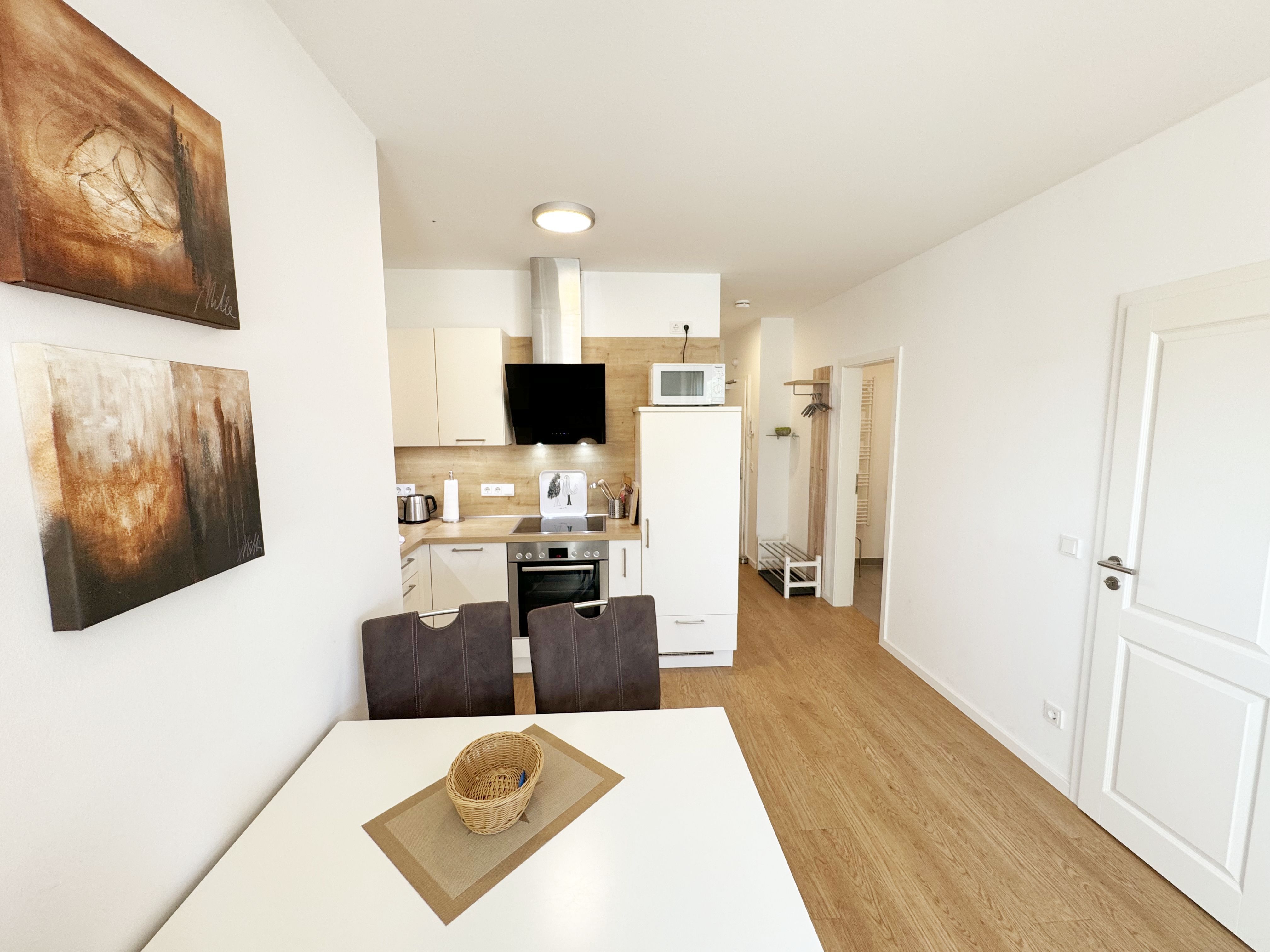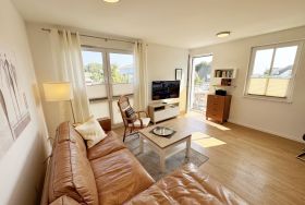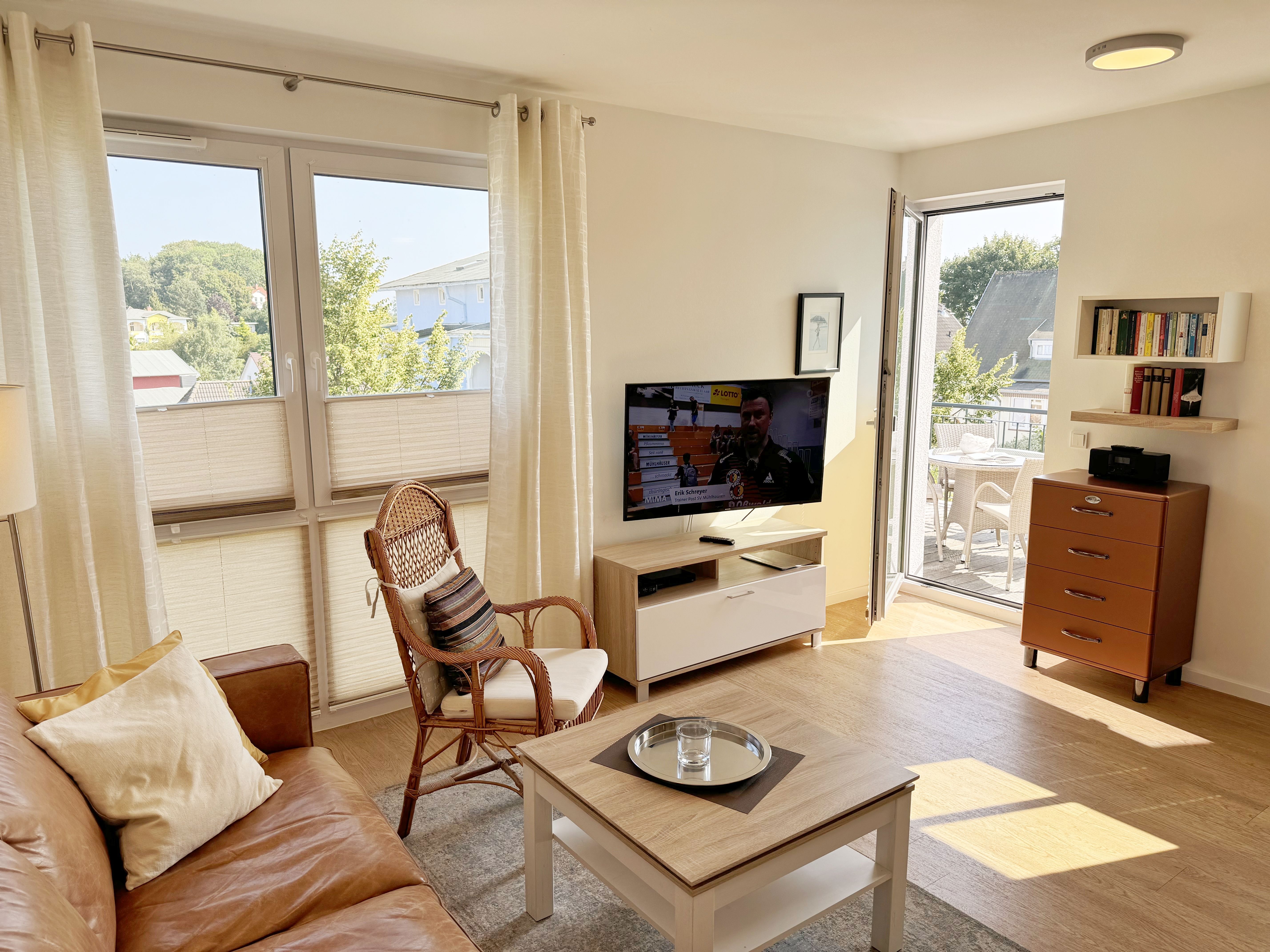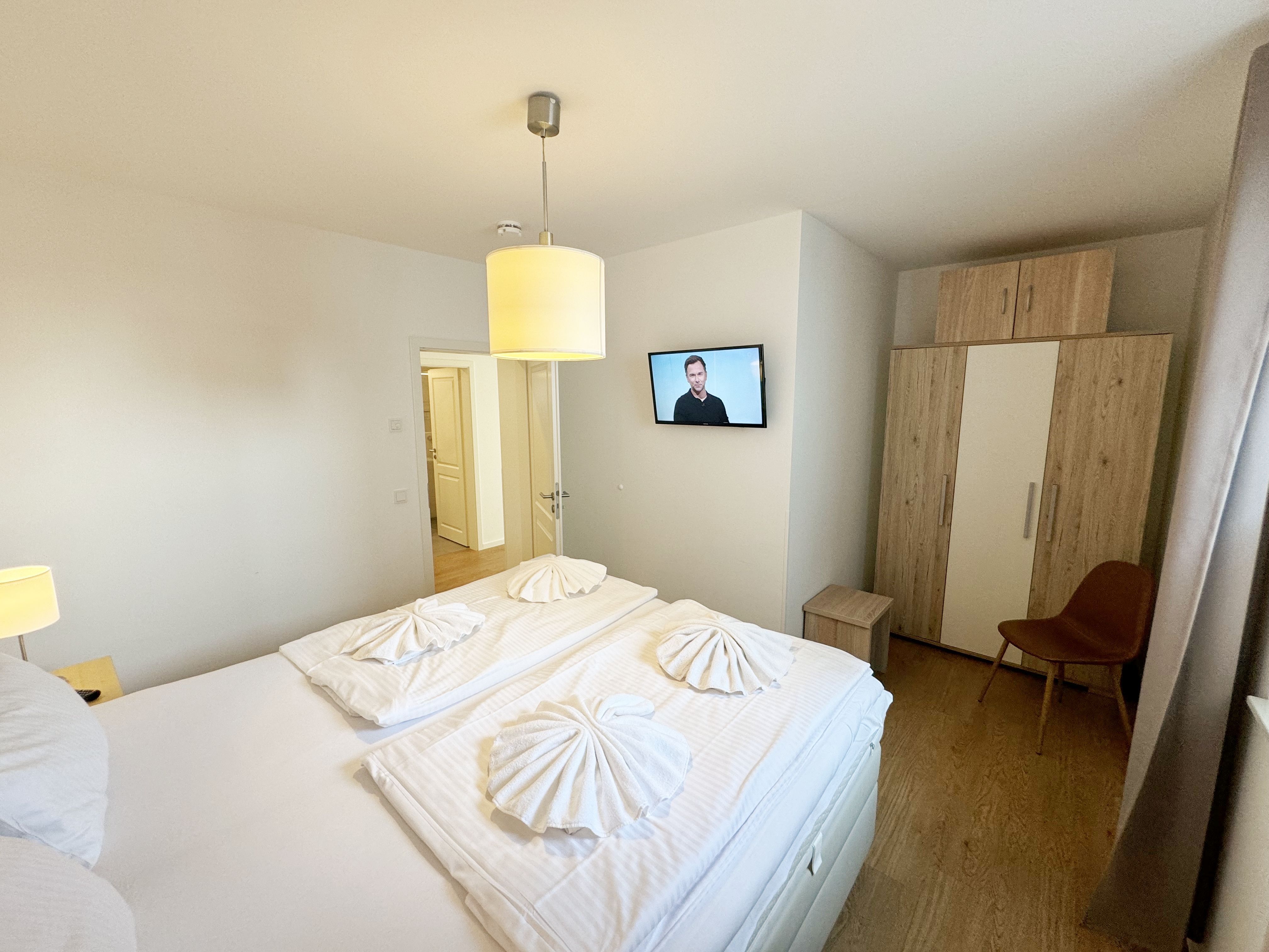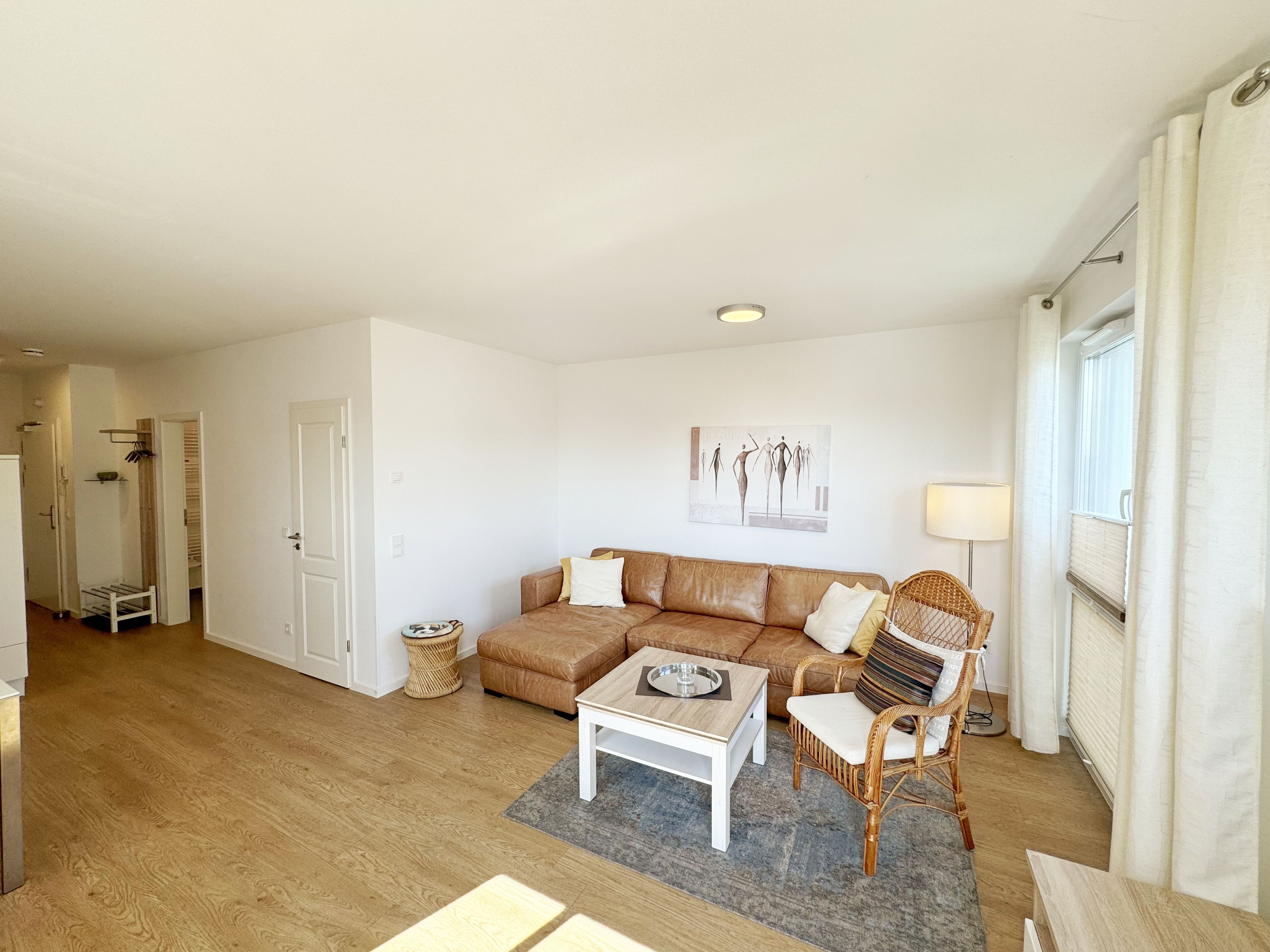 Die Wohnung Nr. 4 der Villa Anni ist eine komfortable, ca. 57 m² große und stilvoll eingerichtete Nichtraucherferienwohnung im ersten Obergeschoss. Sie bietet Ihnen ausreichend Platz für 2 bis 3 Personen. Der kombinierte Wohn-/Koch- und Essbereich mit der modernen und integrierten Küchenzeile lässt mit Ceranfeld, Backofen, Geschirrspüler, Mikrowelle, Kühlschrank mit Gefrierfach, Kaffeemaschine, Wasserkocher, Toaster und diversen Küchenutensilien keine Wünsche offen. Der Essbereich fügt sich der Küchenzeile an. Der offene Wohnbereich verfügt über eine gemütliche Sitzecke (Liegefläche 1,50m x 2,00m) mit Couchtisch, eine Leselampe, ein TV mit CD-Player, DAB-Radio und einen Blu-Ray Player. Auch auf einen Internetanschluss (WLAN) müssen Sie in Ihrem Urlaub nicht verzichten. Dieser ist für Sie inklusive! Eine Auswahl an Gesellschaftsspielen und Urlaubslektüre sorgt für eine gelungene Abwechslung. Der nach Nord/Osten mit Blick Richtung Meer ausgerichtete, und bestuhlte Balkon mit Sonnenschirm ist direkt vom Wohnbereich aus zu erreichen. Das Schlafzimmer verfügt über ein Boxspringbett mit Tonnentaschenfederkernmatratzen (1,80m x 2,00m), Nachttischablagen, Flachbild-TV und einen Kleiderschrank. Für einen ruhigen Schlaf sorgt eine Verdunklungsmöglichkeit sowie ein Insektenschutzgitter. Das Bad ist mit einer ebenerdigen Dusche, Waschplatz, Kosmetikspiegel, WC, Handtuchheizkörper und Fön ausgestattet. Im Schlafzimmer ist ein Insektenschutzgitter vorhanden. Alle Räumlichkeiten sind mit einer Fußbodenheizung versehen und sorgen für eine angenehme Wärme. Ein eigener PKW-Stellplatz (Nr. 4) befindet sich in der Tiefgarage (Einfahrtshöhe: 2,00 m) des Hauses. 1 kleiner Hund ist gegen eine Gebühr in der Wohnung erlaubt! Die Erstausstattung eines Wäschepaketes (komplette Bettwäsche, 1 Duschhandtuch, 2 kleine Handtücher) können Sie bis 14 Tage vor Anreise gegen einen Aufpreis dazu buchen oder durch eigene ergänzen. Ab 2 gebuchten Paketen erhalten Sie einmalig 1 Geschirrhandtuch und 1 Duschvorleger hinzu.
