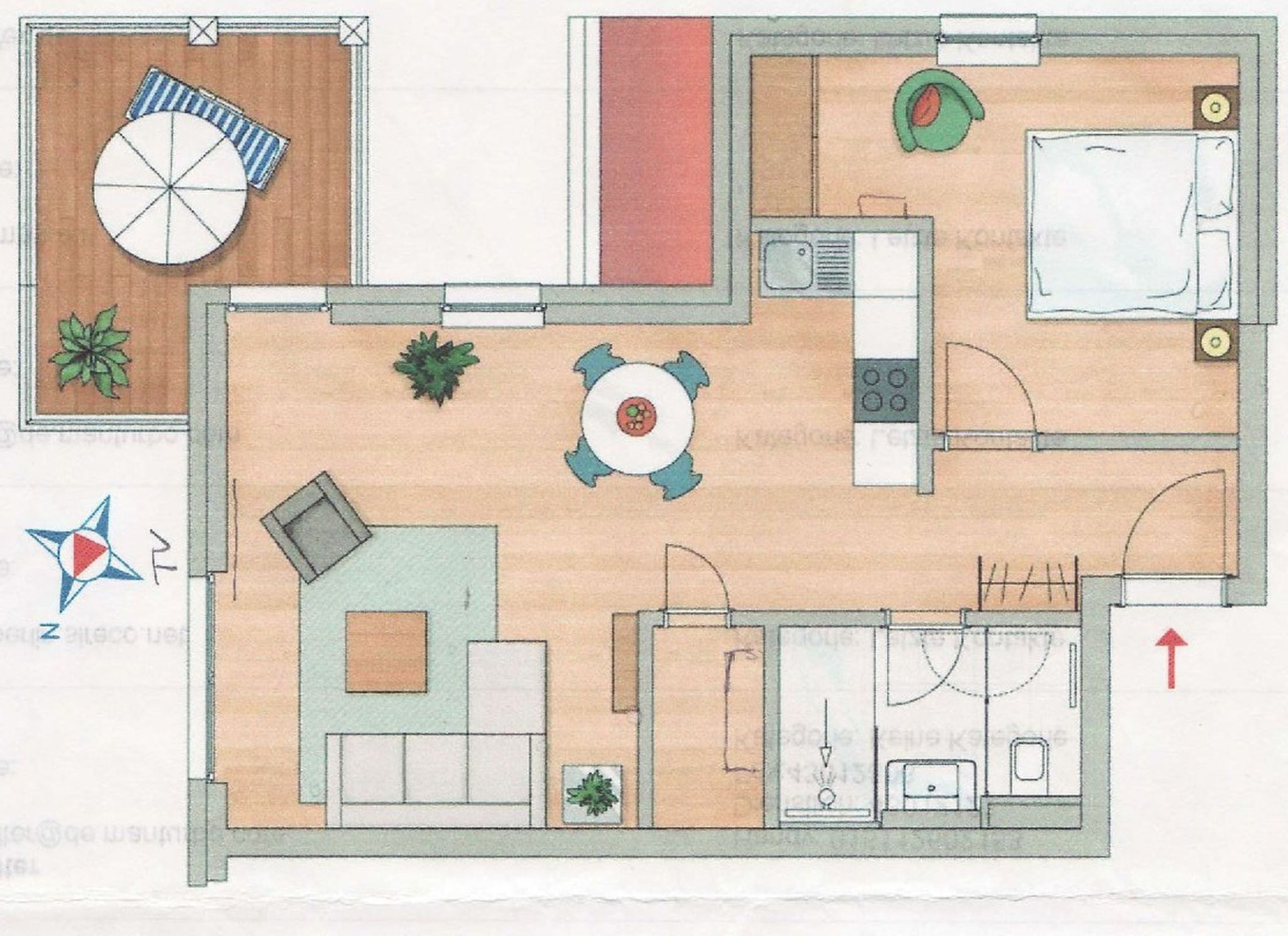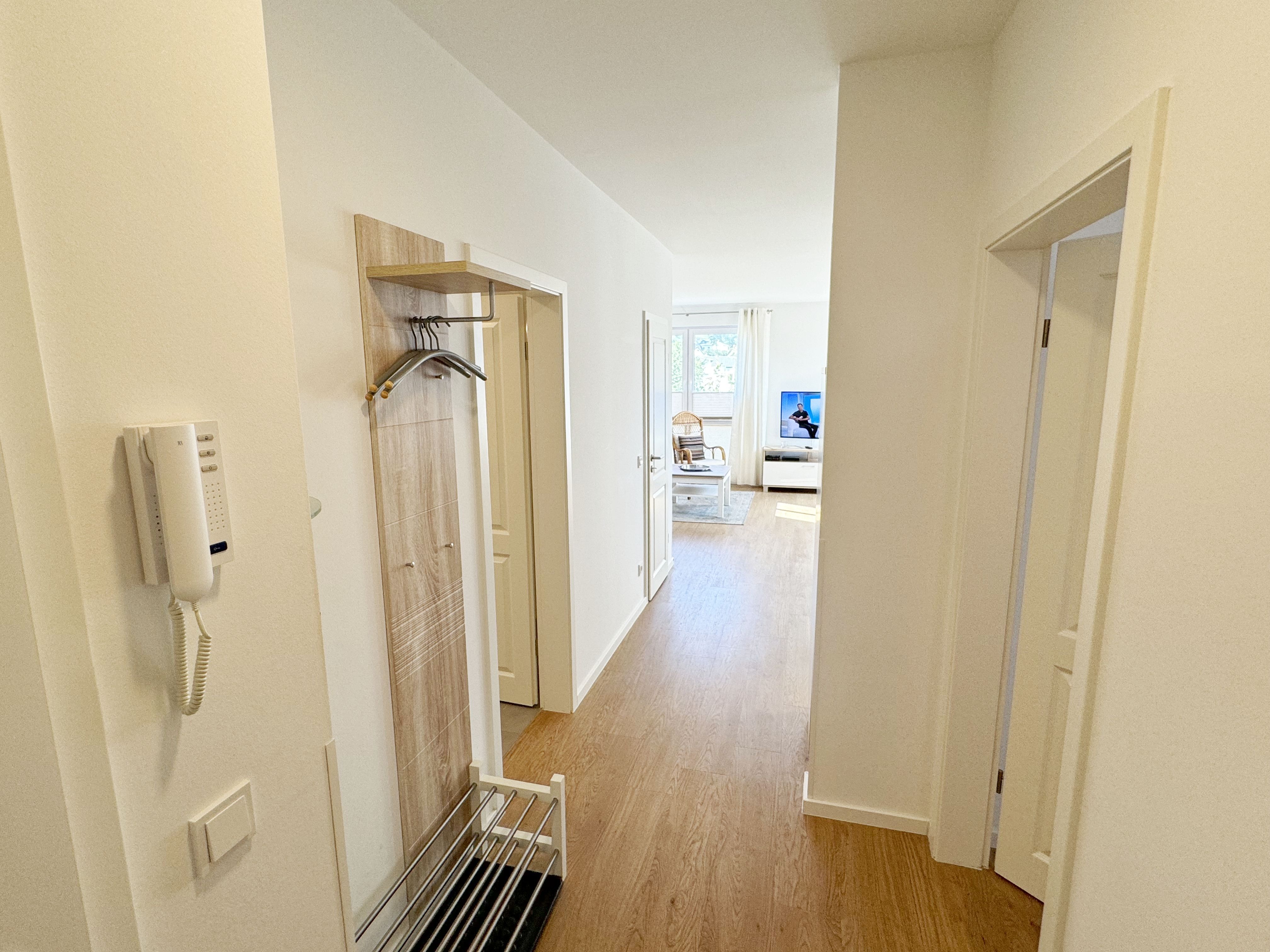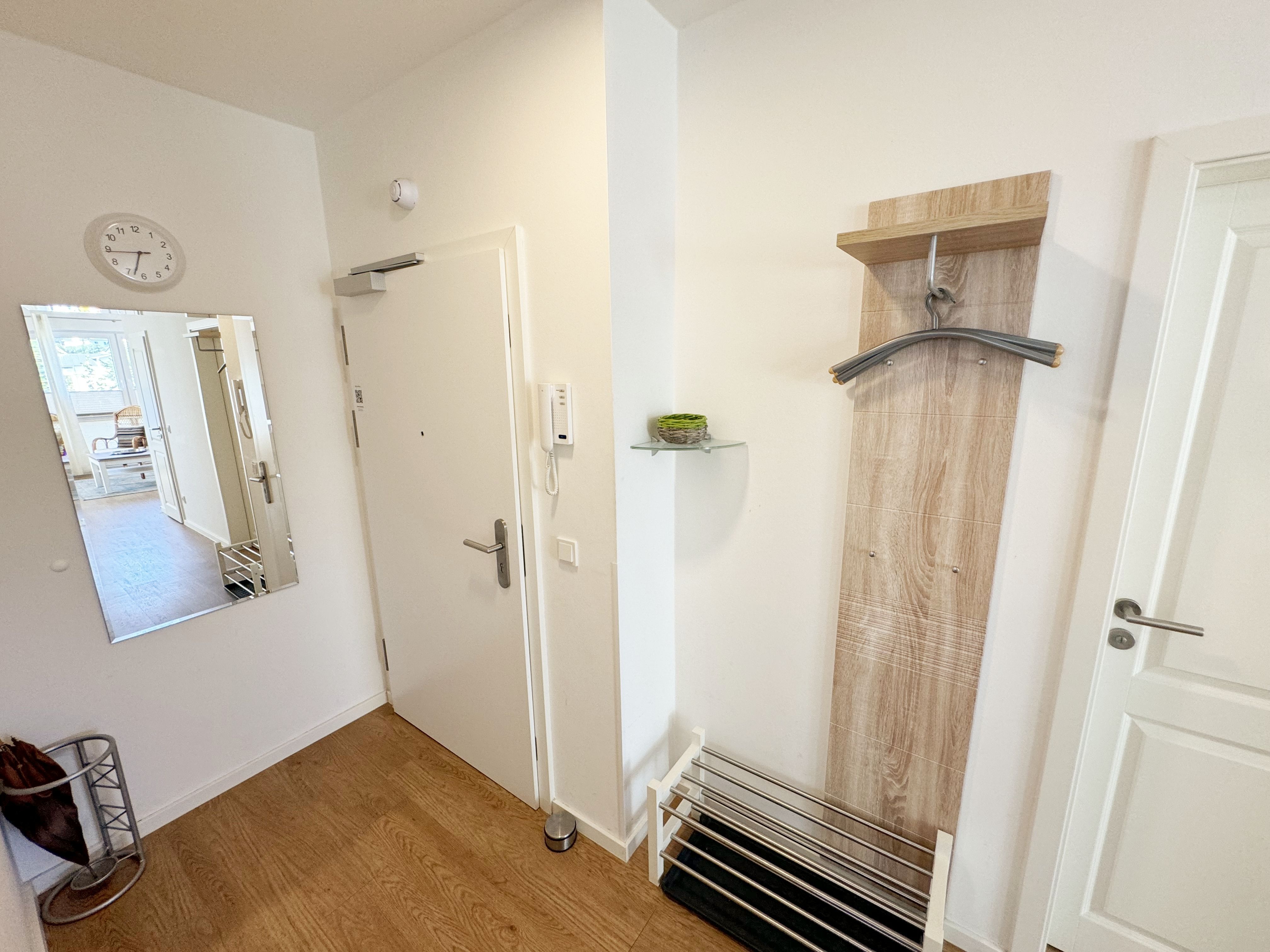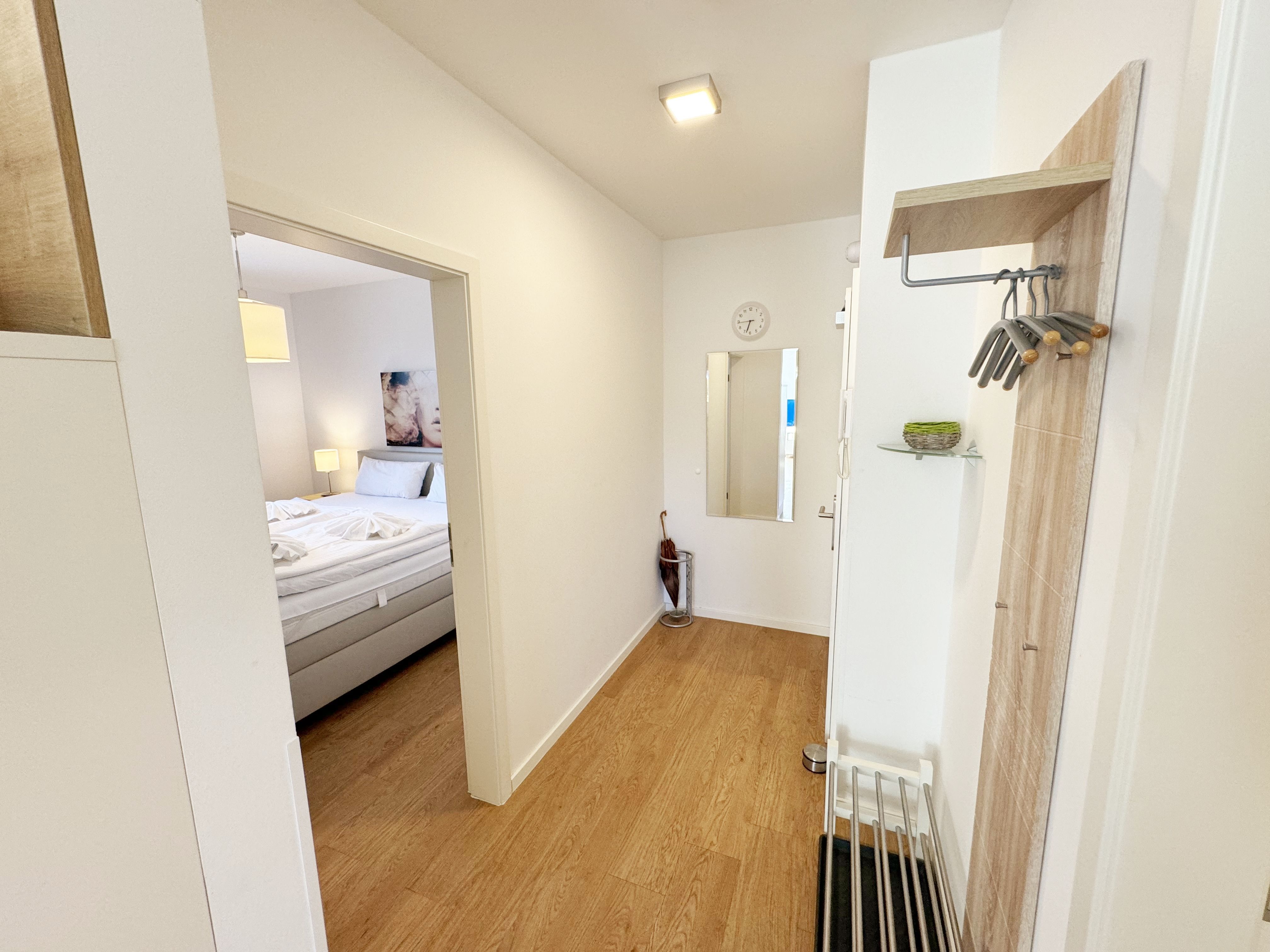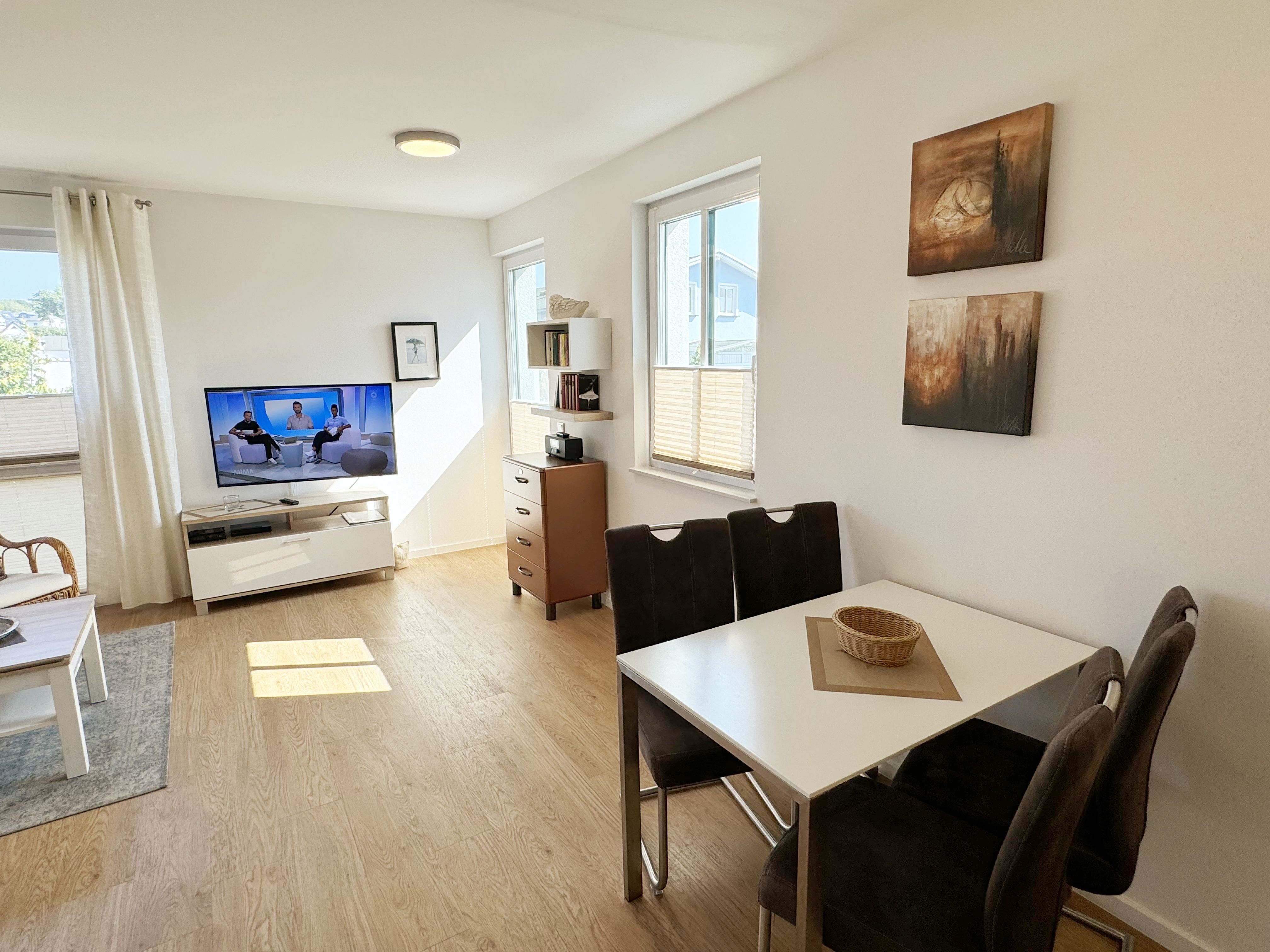 Die Wohnung Nr. 4 der Villa Anni ist eine komfortable, ca. 57 m² große und stilvoll eingerichtete Nichtraucherferienwohnung im ersten Obergeschoss. Sie bietet Ihnen ausreichend Platz für 2 bis 3 Personen. Der kombinierte Wohn-/Koch- und Essbereich mit der modernen und integrierten Küchenzeile lässt mit Ceranfeld, Backofen, Geschirrspüler, Mikrowelle, Kühlschrank mit Gefrierfach, Kaffeemaschine, Wasserkocher, Toaster und diversen Küchenutensilien keine Wünsche offen. Der Essbereich fügt sich der Küchenzeile an. Der offene Wohnbereich verfügt über eine gemütliche Sitzecke (Liegefläche 1,50m x 2,00m) mit Couchtisch, eine Leselampe, ein TV mit CD-Player, DAB-Radio und einen Blu-Ray Player. Auch auf einen Internetanschluss (WLAN) müssen Sie in Ihrem Urlaub nicht verzichten. Dieser ist für Sie inklusive! Eine Auswahl an Gesellschaftsspielen und Urlaubslektüre sorgt für eine gelungene Abwechslung. Der nach Nord/Osten mit Blick Richtung Meer ausgerichtete, und bestuhlte Balkon mit Sonnenschirm ist direkt vom Wohnbereich aus zu erreichen. Das Schlafzimmer verfügt über ein Boxspringbett mit Tonnentaschenfederkernmatratzen (1,80m x 2,00m), Nachttischablagen, Flachbild-TV und einen Kleiderschrank. Für einen ruhigen Schlaf sorgt eine Verdunklungsmöglichkeit sowie ein Insektenschutzgitter. Das Bad ist mit einer ebenerdigen Dusche, Waschplatz, Kosmetikspiegel, WC, Handtuchheizkörper und Fön ausgestattet. Im Schlafzimmer ist ein Insektenschutzgitter vorhanden. Alle Räumlichkeiten sind mit einer Fußbodenheizung versehen und sorgen für eine angenehme Wärme. Ein eigener PKW-Stellplatz (Nr. 4) befindet sich in der Tiefgarage (Einfahrtshöhe: 2,00 m) des Hauses. 1 kleiner Hund ist gegen eine Gebühr in der Wohnung erlaubt! Die Erstausstattung eines Wäschepaketes (komplette Bettwäsche, 1 Duschhandtuch, 2 kleine Handtücher) können Sie bis 14 Tage vor Anreise gegen einen Aufpreis dazu buchen oder durch eigene ergänzen. Ab 2 gebuchten Paketen erhalten Sie einmalig 1 Geschirrhandtuch und 1 Duschvorleger hinzu.
