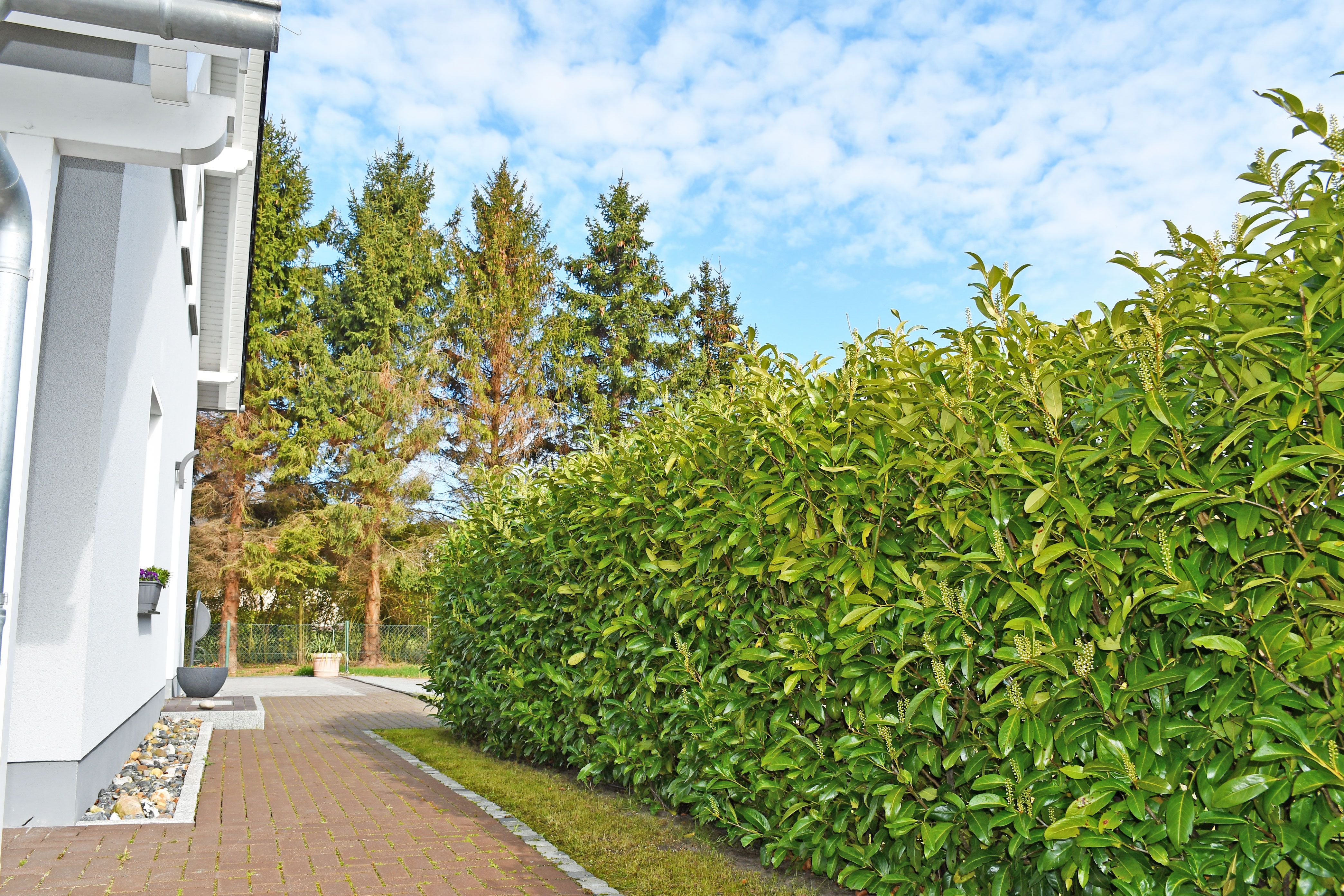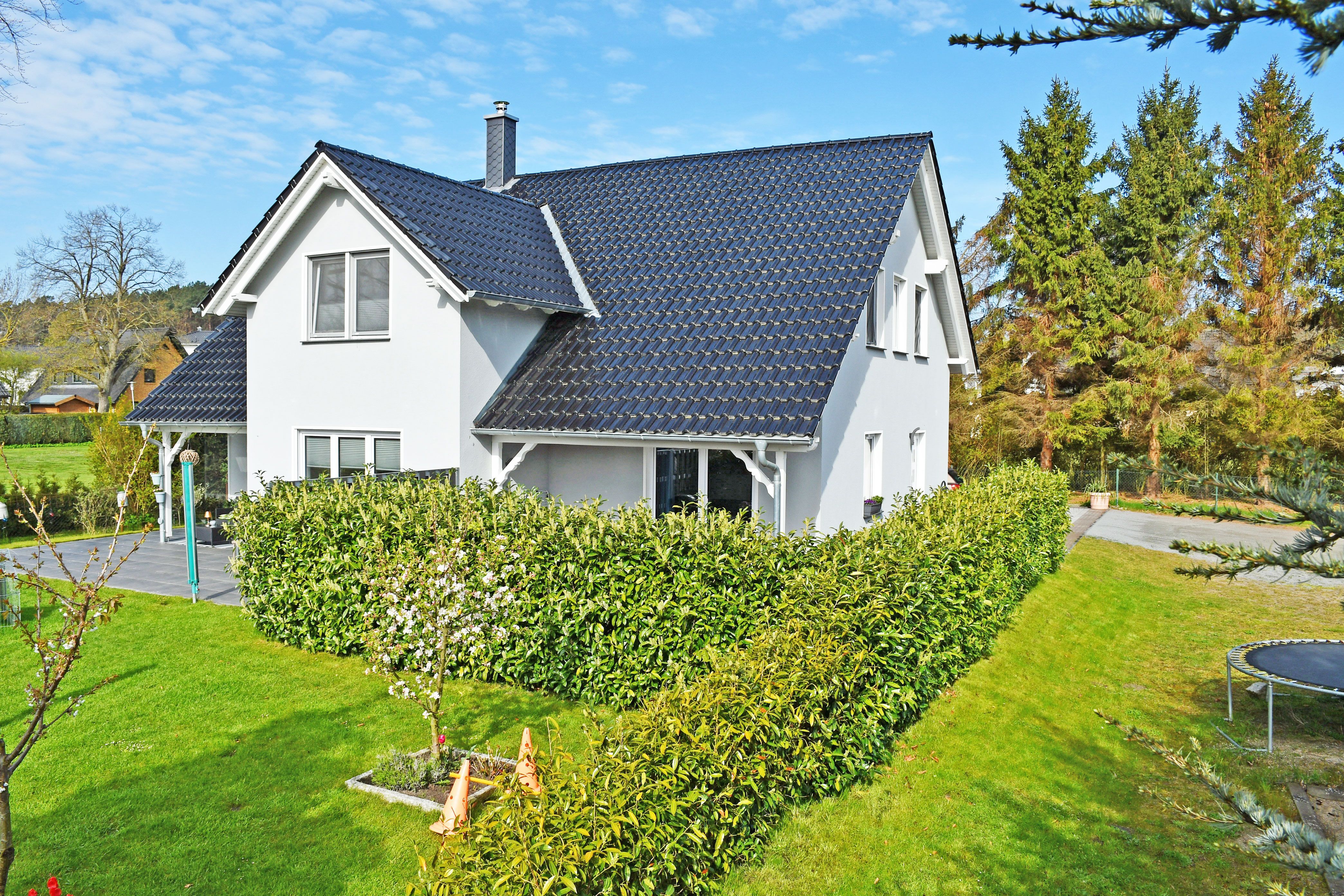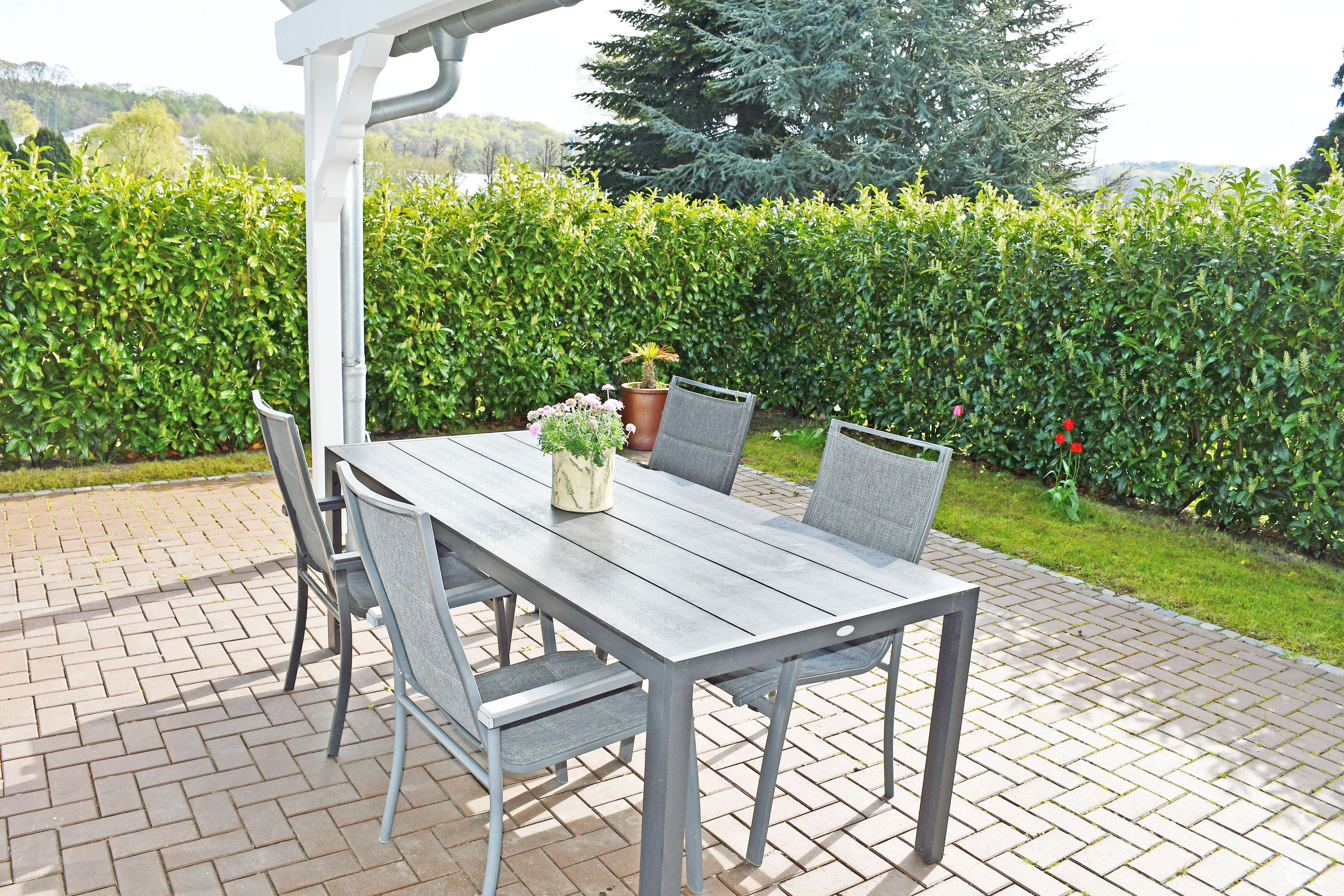 Vor dem Wohnzimmer im Erdgeschoss liegt eine schöne Sonnenterrasse mit Gartenmöbeln. Davor gibt es eine schöne Liegewiese.
