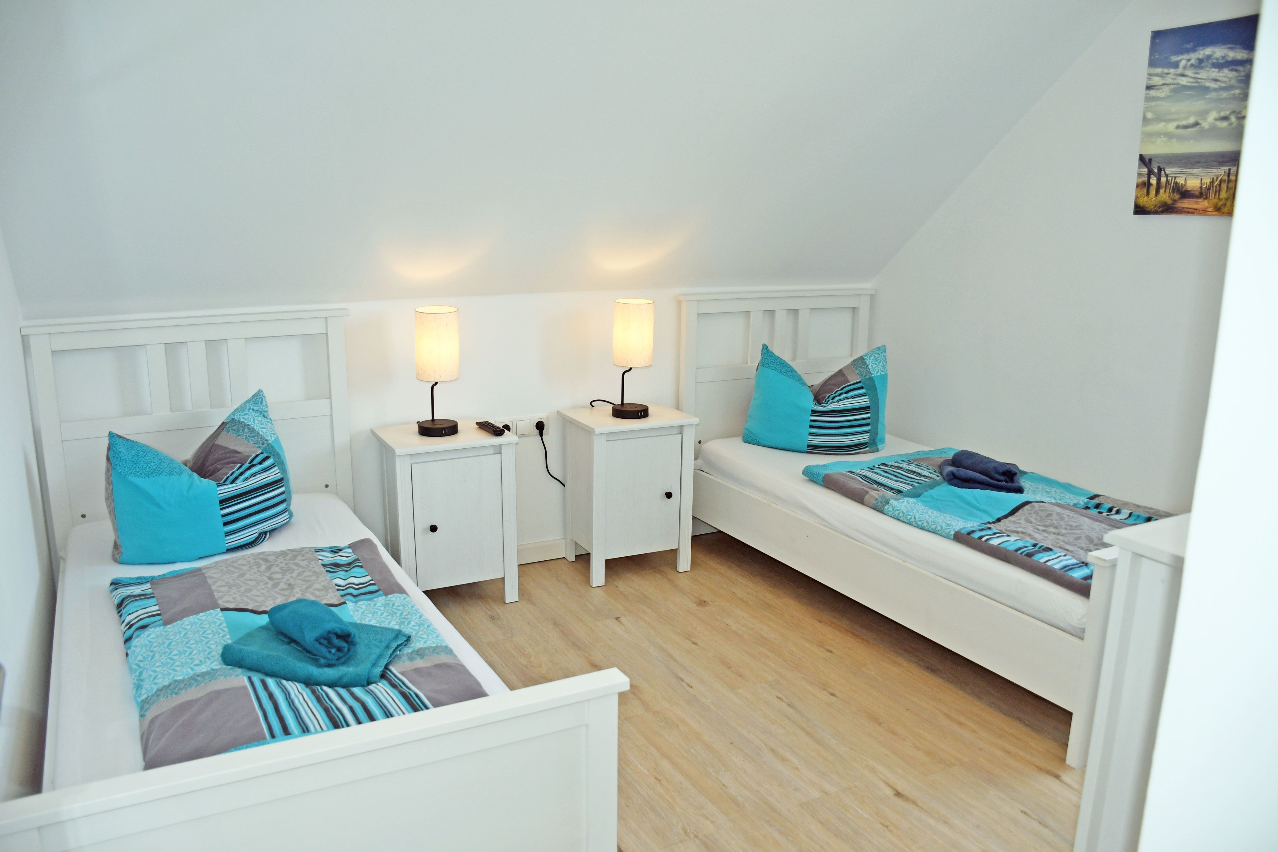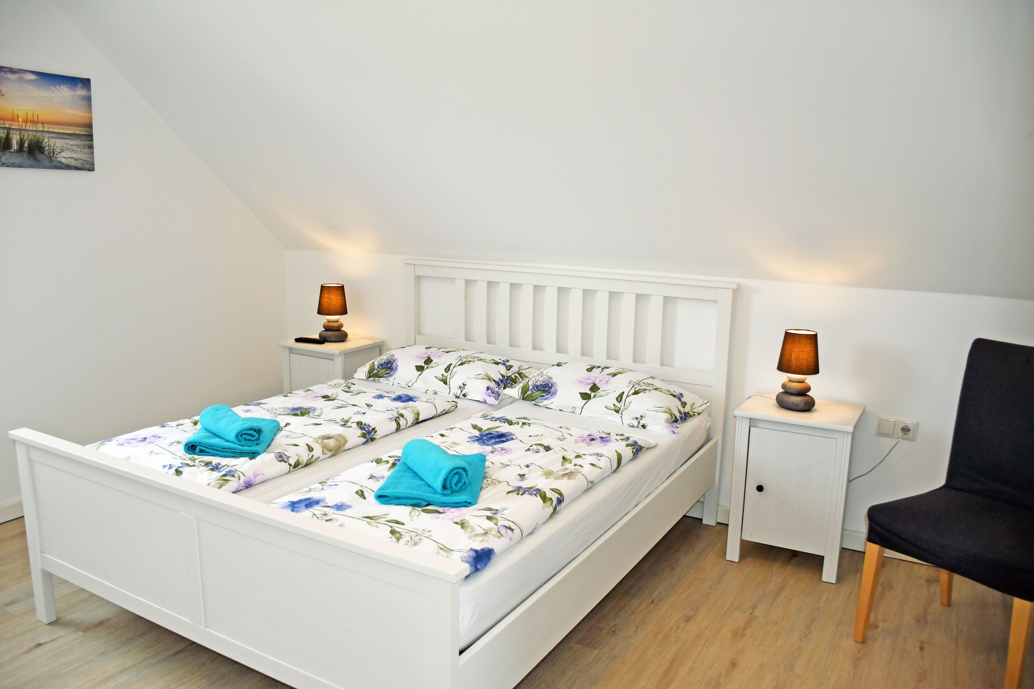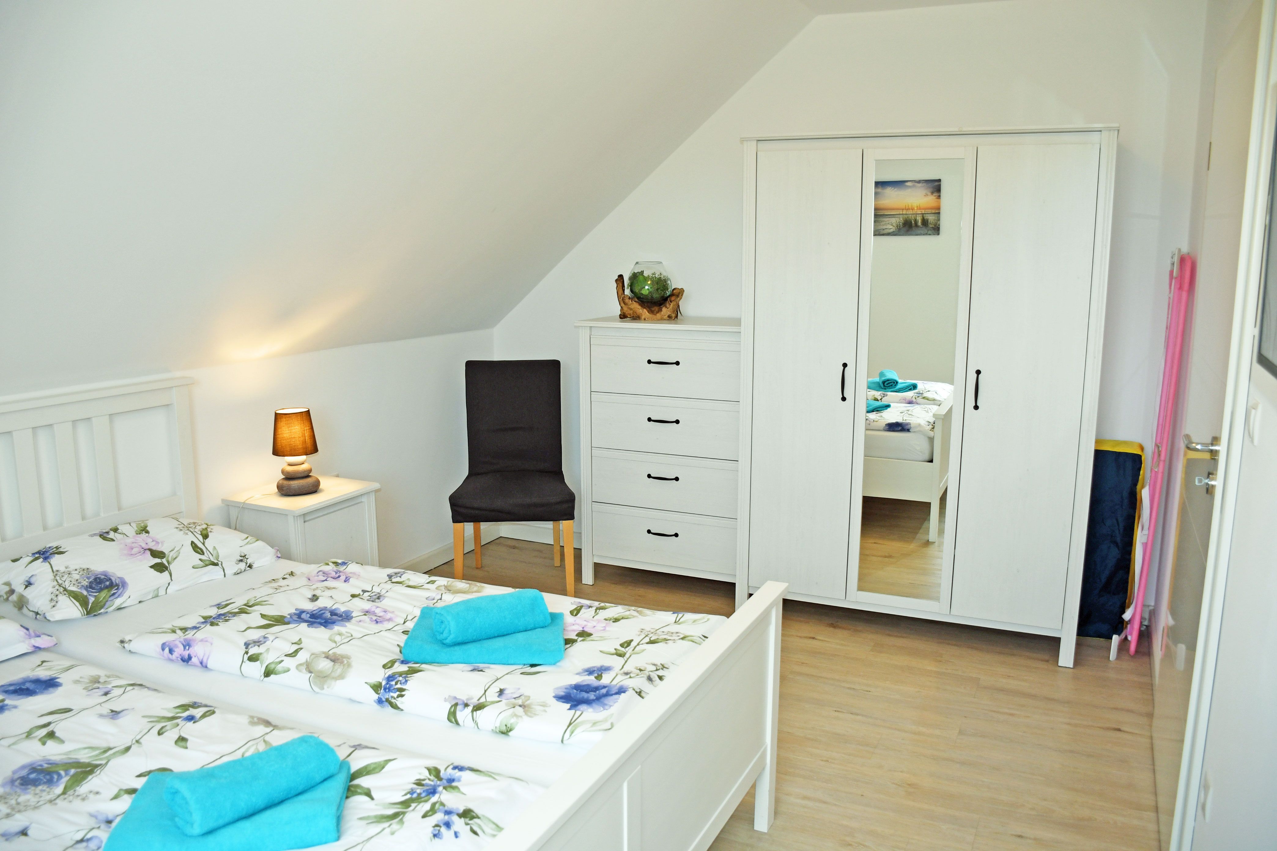Über eine Holztreppe erreicht man das Obergeschoss. Hier befinden sich die zwei großen Schlafzimmer mit jeweils großem Doppelbett bzw. 2 Einzelbetten mit Nachtkästen, Weckradio und geräumigen Spiegelschrank. Im Obergeschoss liegt auch das zweite Bad mit Dusche, WC und Waschtisch, es verfügt über Tageslicht.