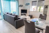 Die 48 m² große Ferienwohnung besteht aus einen Wohnzimmer mit Kamin, Flat Screen-TV, Stereoanlage und Schlafcouch (150x200) für 2 Personen. Weiterhin befindet sich im Wohnraum ein integrierter Küchenbereich mit vollausgestatteter Küche (Herd mit Backofen, Geschirrspüler, Kühlschrank mit Gefrierfach, Kühlschrank, Kaffeemaschine) und einer Essecke mit 4 Stühlen. Im Schlafzimmer befinden sich ein Doppelbett (180x200, getrennte Matratzen), ein großer Schrank für Ihre Garderobe und ein Flachbild-TV. Das Badezimmer ist mit Dusche und WC ausgestattet. Auf dem Flur befinden sich die Garderobe und ein kleiner Schuhschrank.