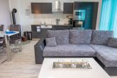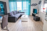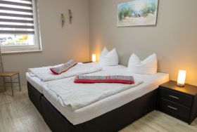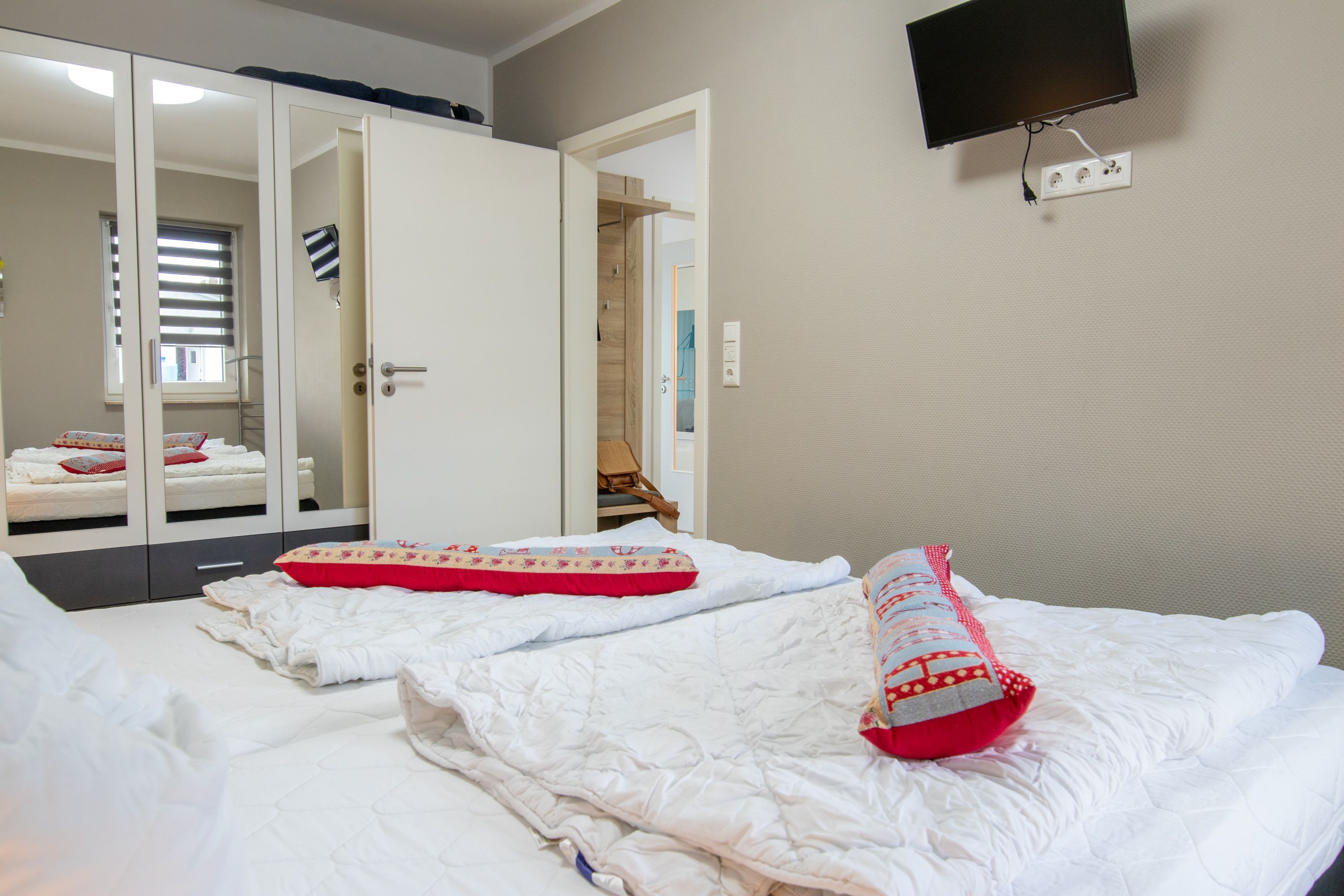 Im Schlafzimmer befinden sich ein Doppelbett und ein großer Schrank für Ihre Garderobe. Auch hier ist ein Flat-TV installiert. Das Badezimmer ist mit Dusche und WC ausgestattet. Auf dem Flur befinden sich die Garderobe und ein kleiner Schuhschrank.
