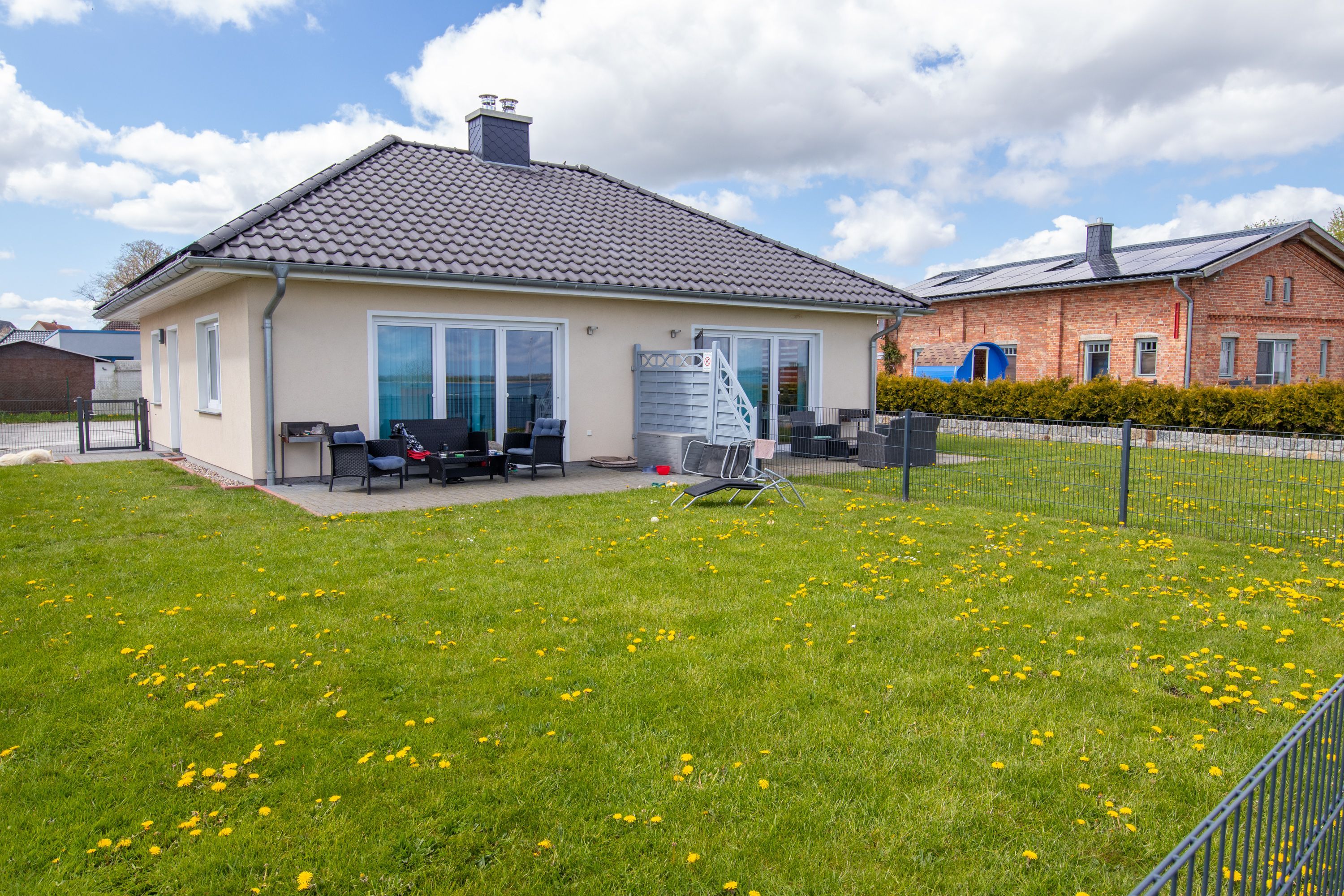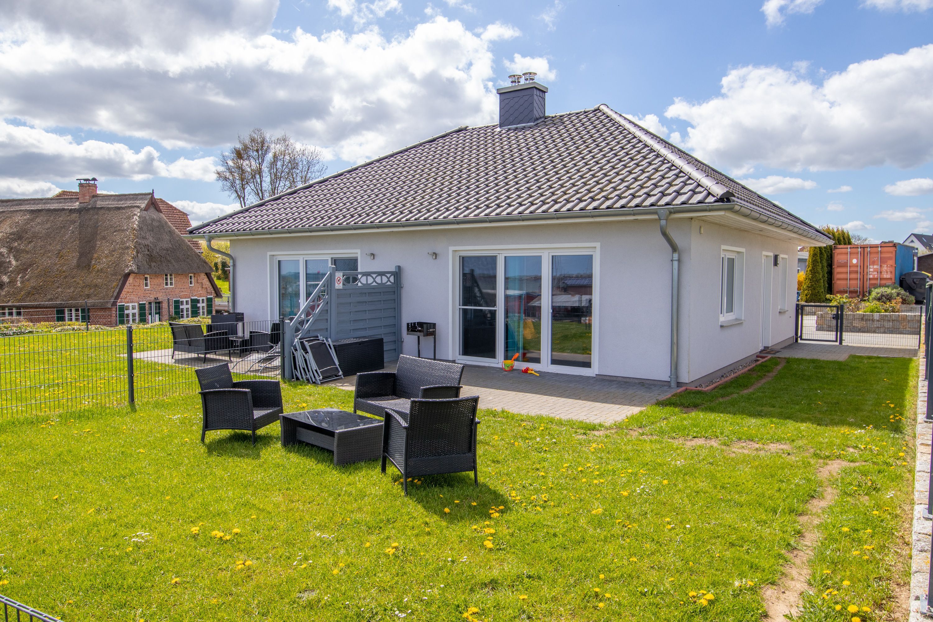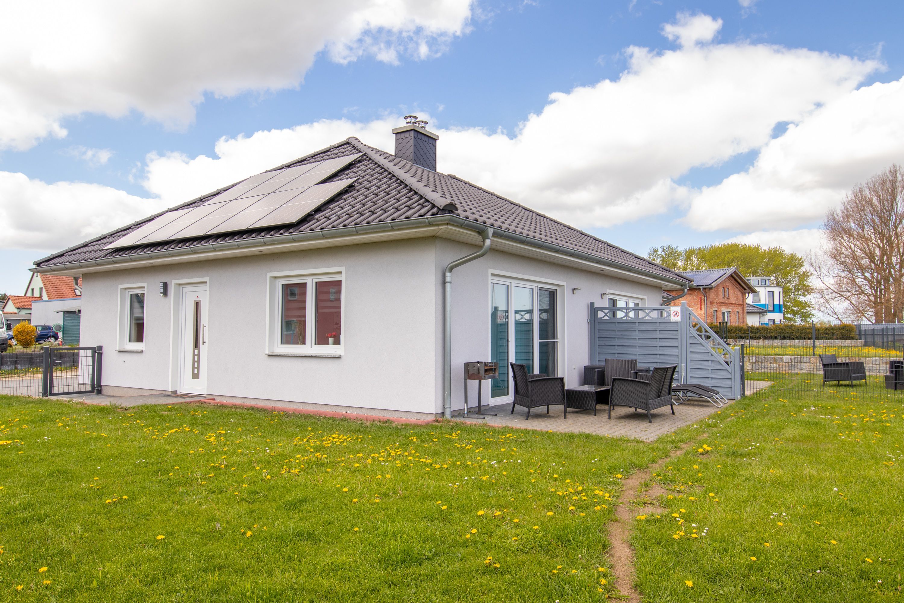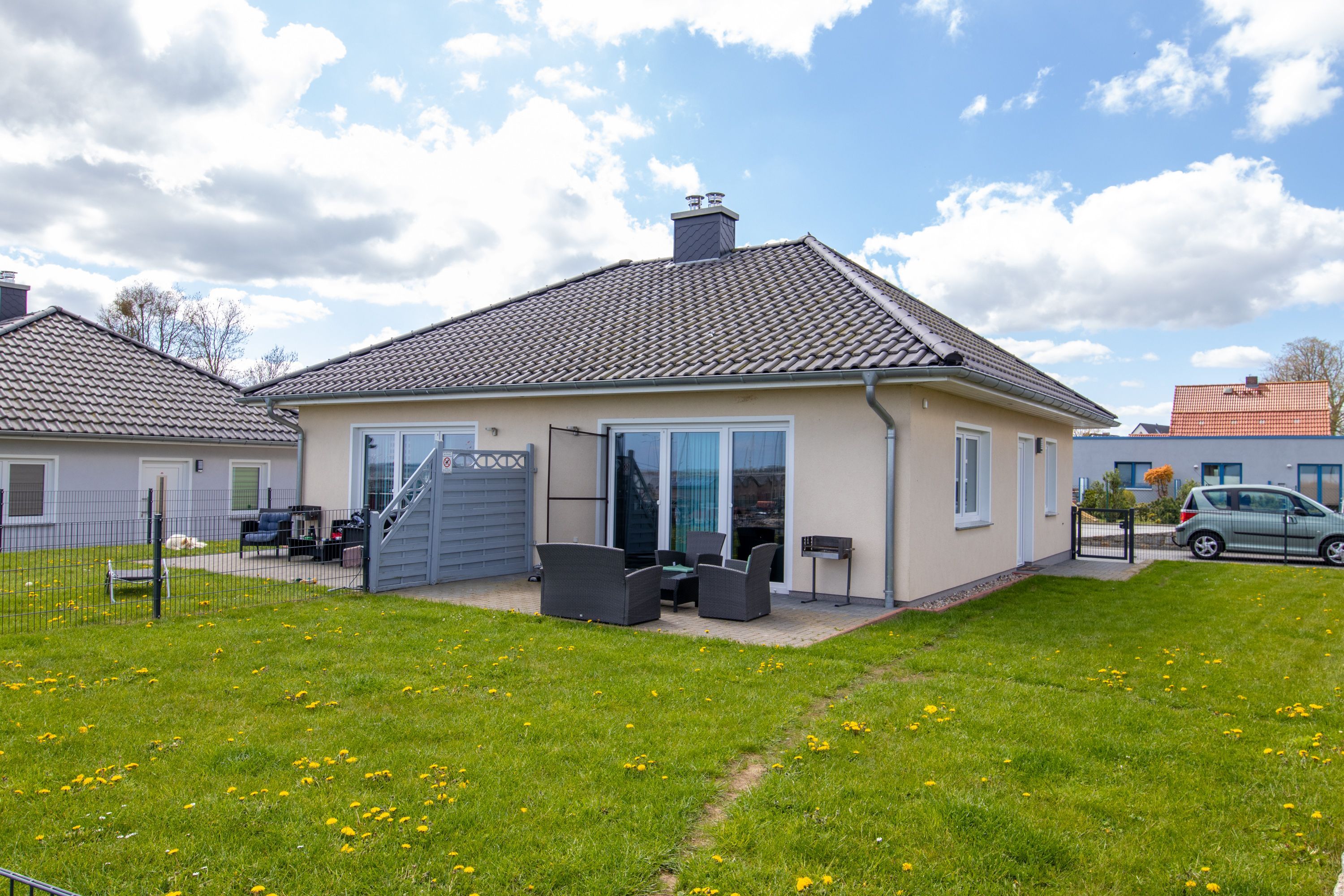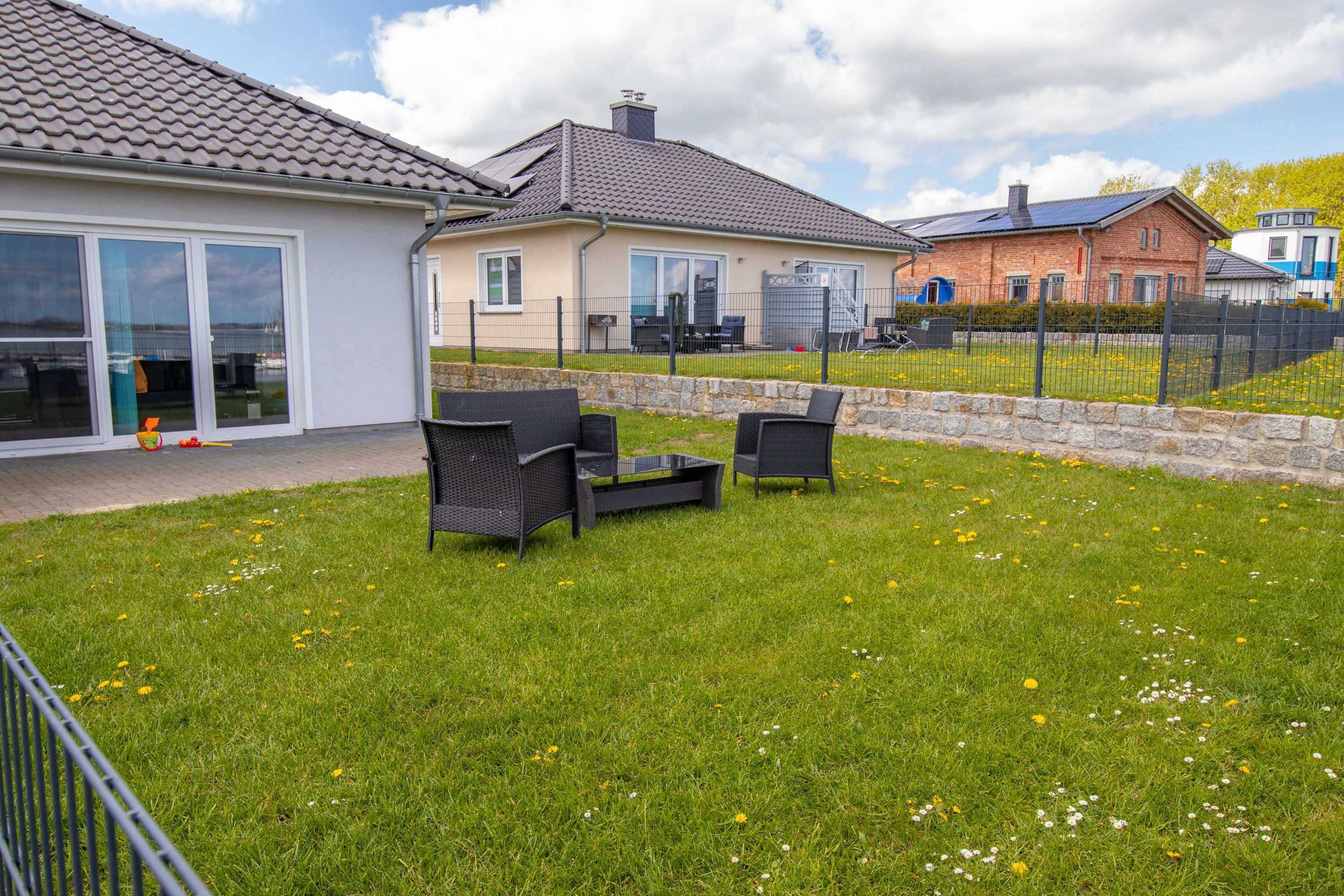 Die Terrasse ist mit Gartenmöbeln, Grill und zwei Gartenliegen ausgestattet. Das Grundstück ist umzäunt und somit auch für Kinder und Hunde bestens geeignet.