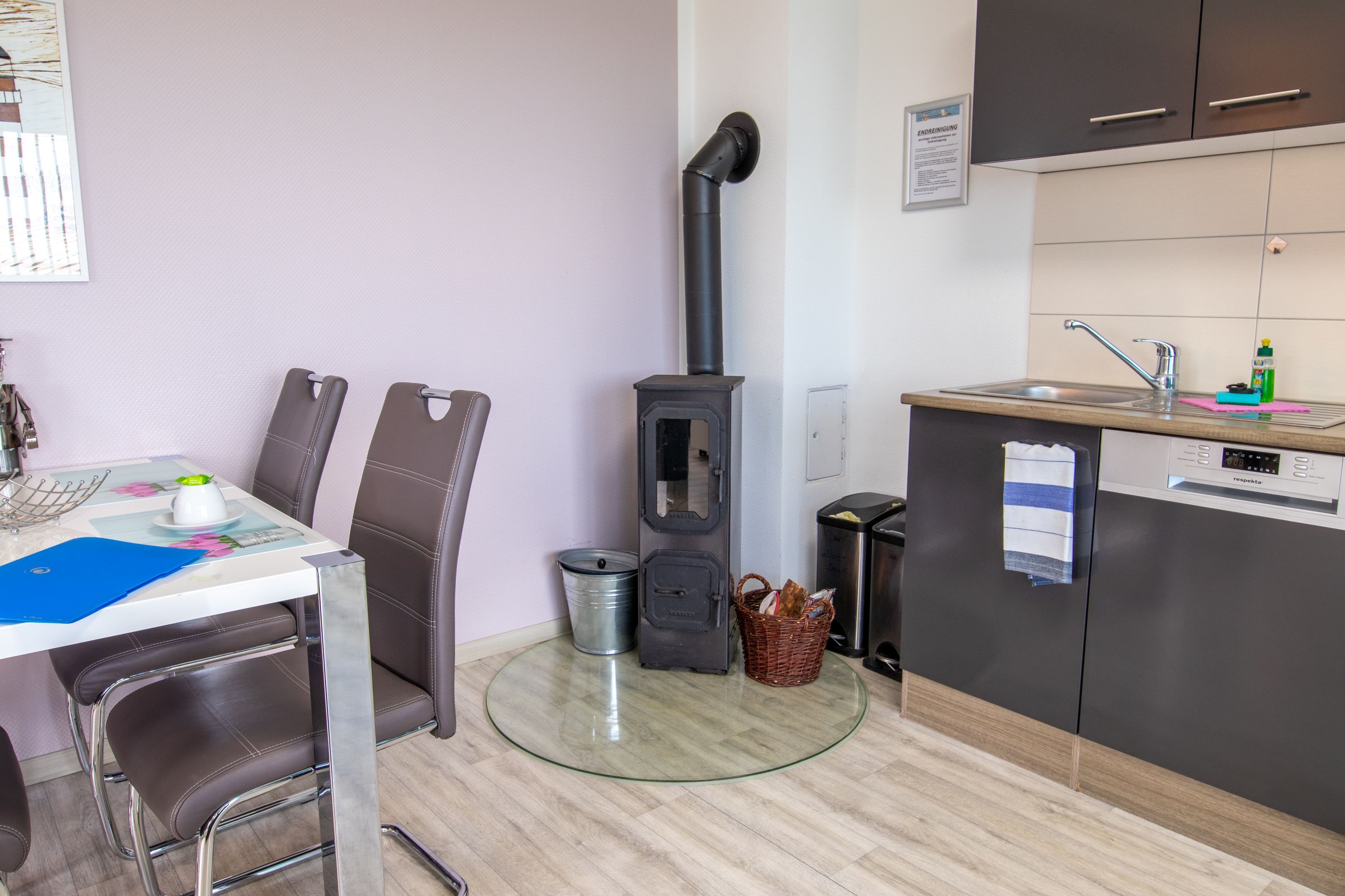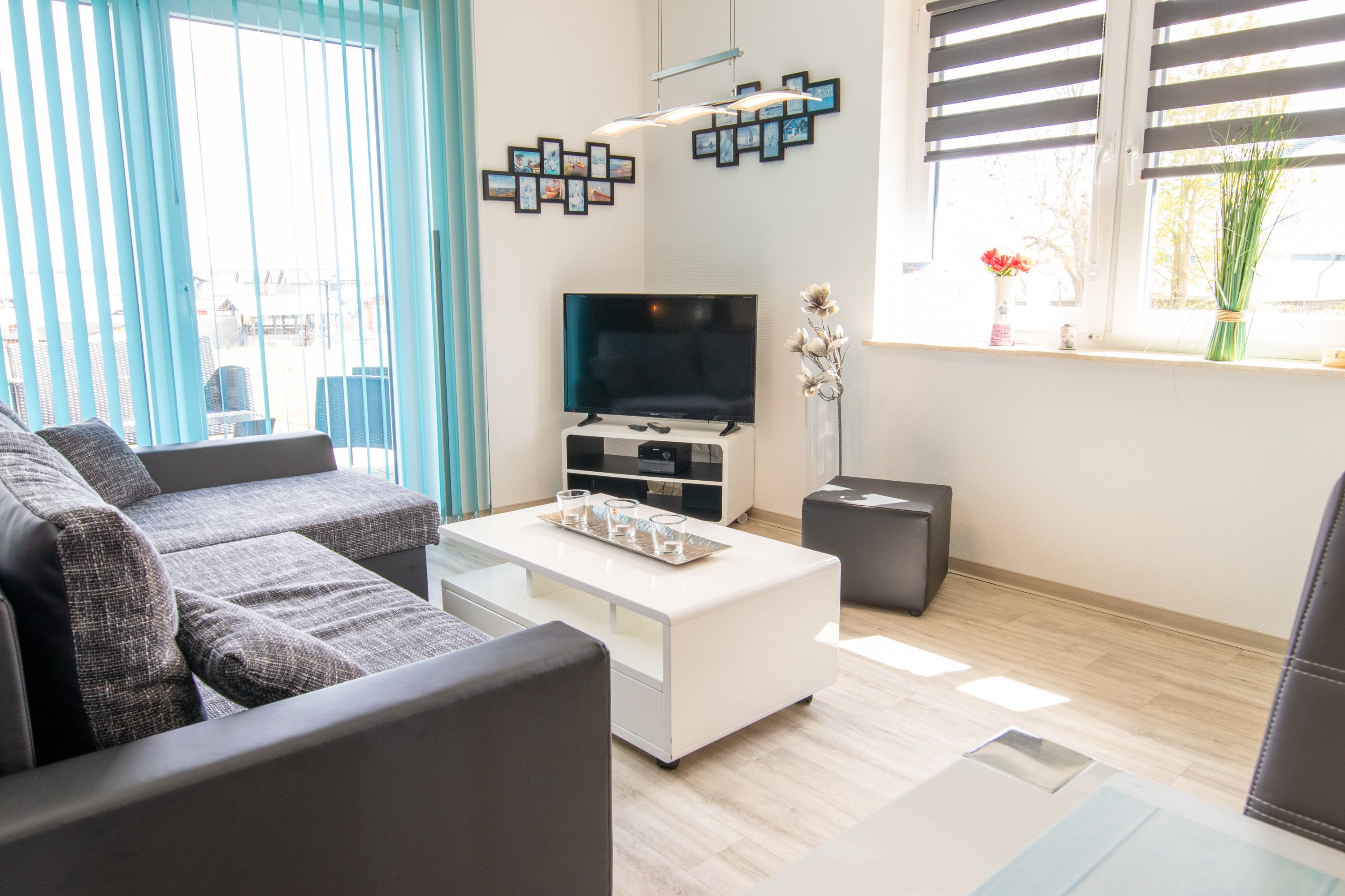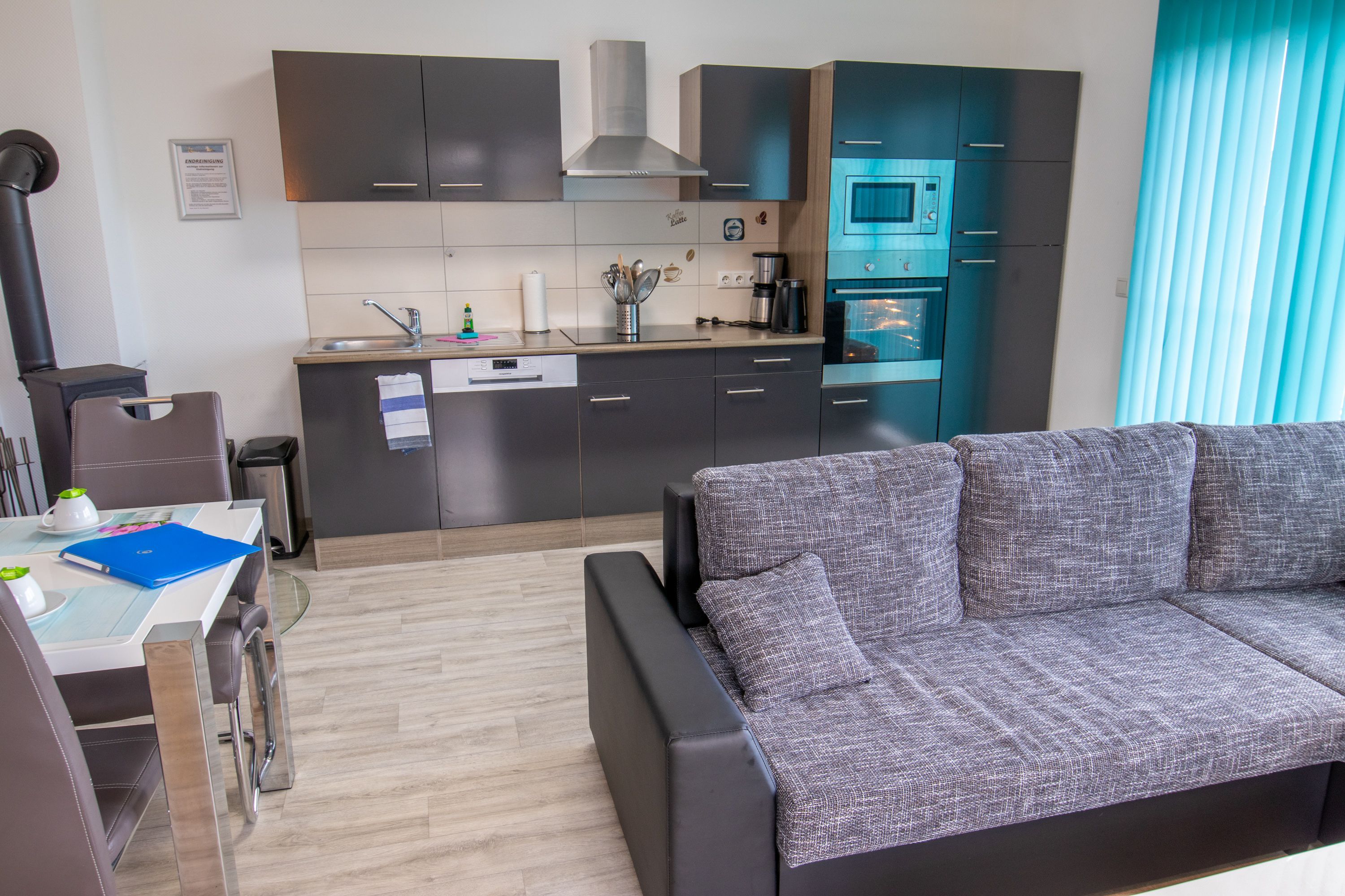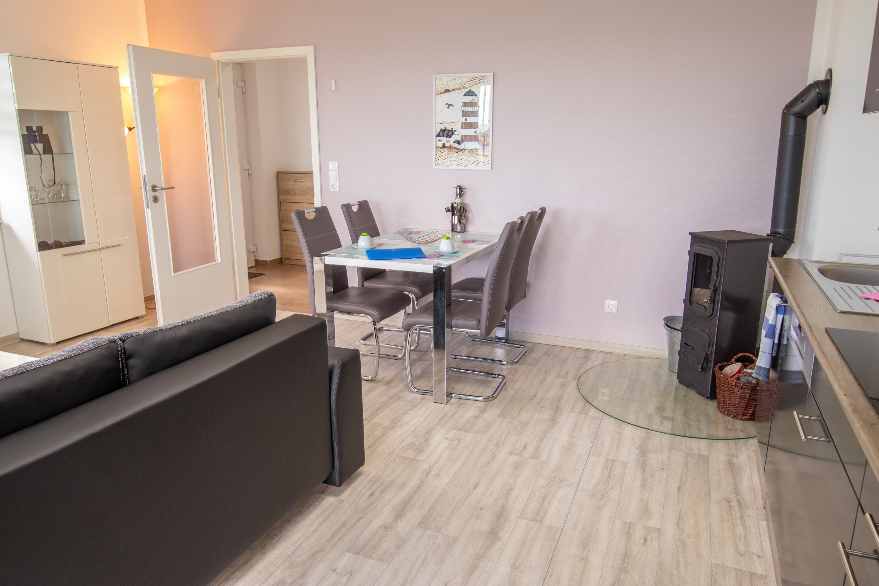 Die 48 m² große Ferienwohnung besteht aus einen Wohnzimmer mit Kamin, Flat Screen-TV, Stereoanlage und Schlafcouch (150x200) für 2 Personen. Weiterhin befindet sich im Wohnraum ein integrierter Küchenbereich mit vollausgestatteter Küche (Herd mit Backofen, Geschirrspüler, Kühlschrank mit Gefrierfach, Kühlschrank, Kaffeemaschine) und einer Essecke mit 4 Stühlen. Im Schlafzimmer befinden sich ein Doppelbett (180x200, getrennte Matratzen), ein großer Schrank für Ihre Garderobe und ein Flachbild-TV. Das Badezimmer ist mit Dusche und WC ausgestattet. Auf dem Flur befinden sich die Garderobe und ein kleiner Schuhschrank.