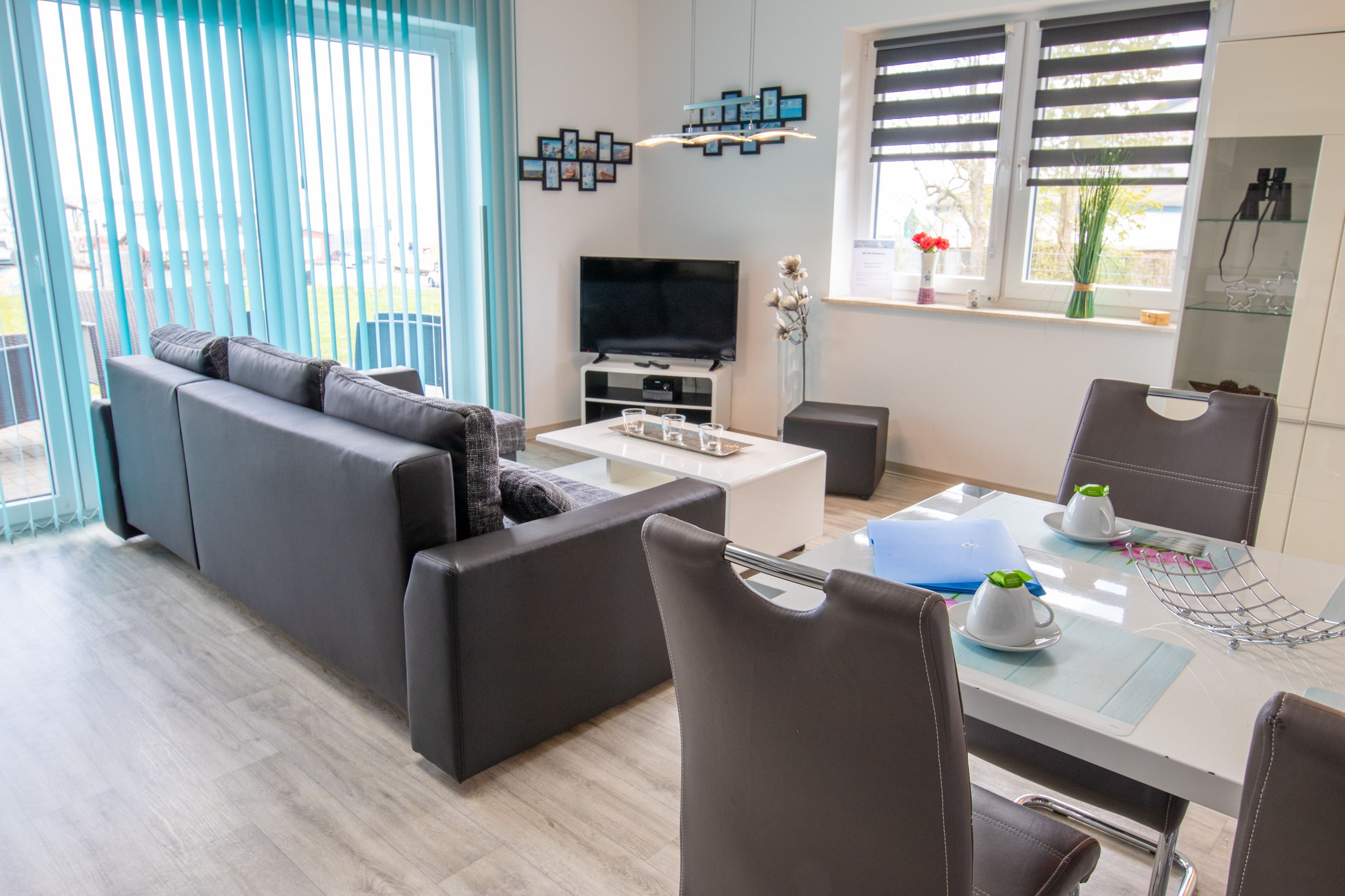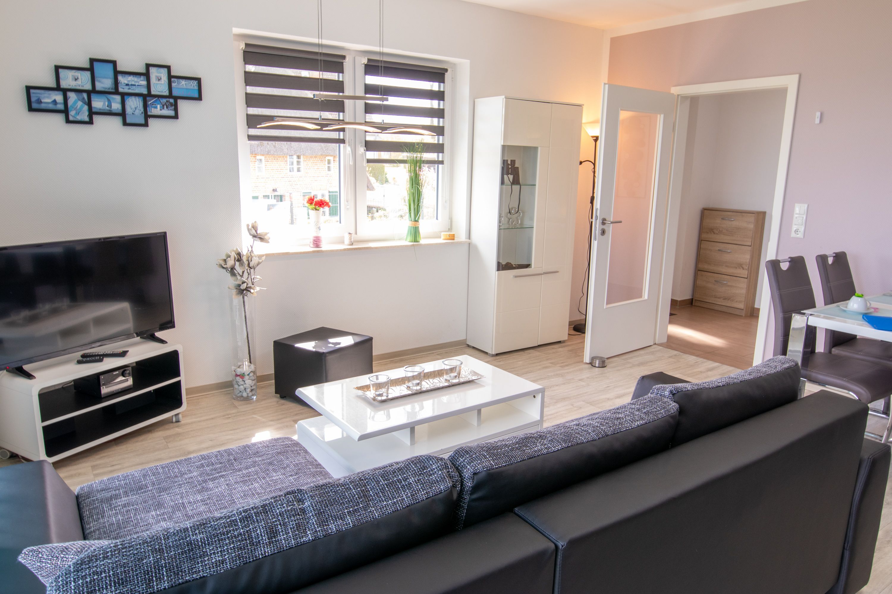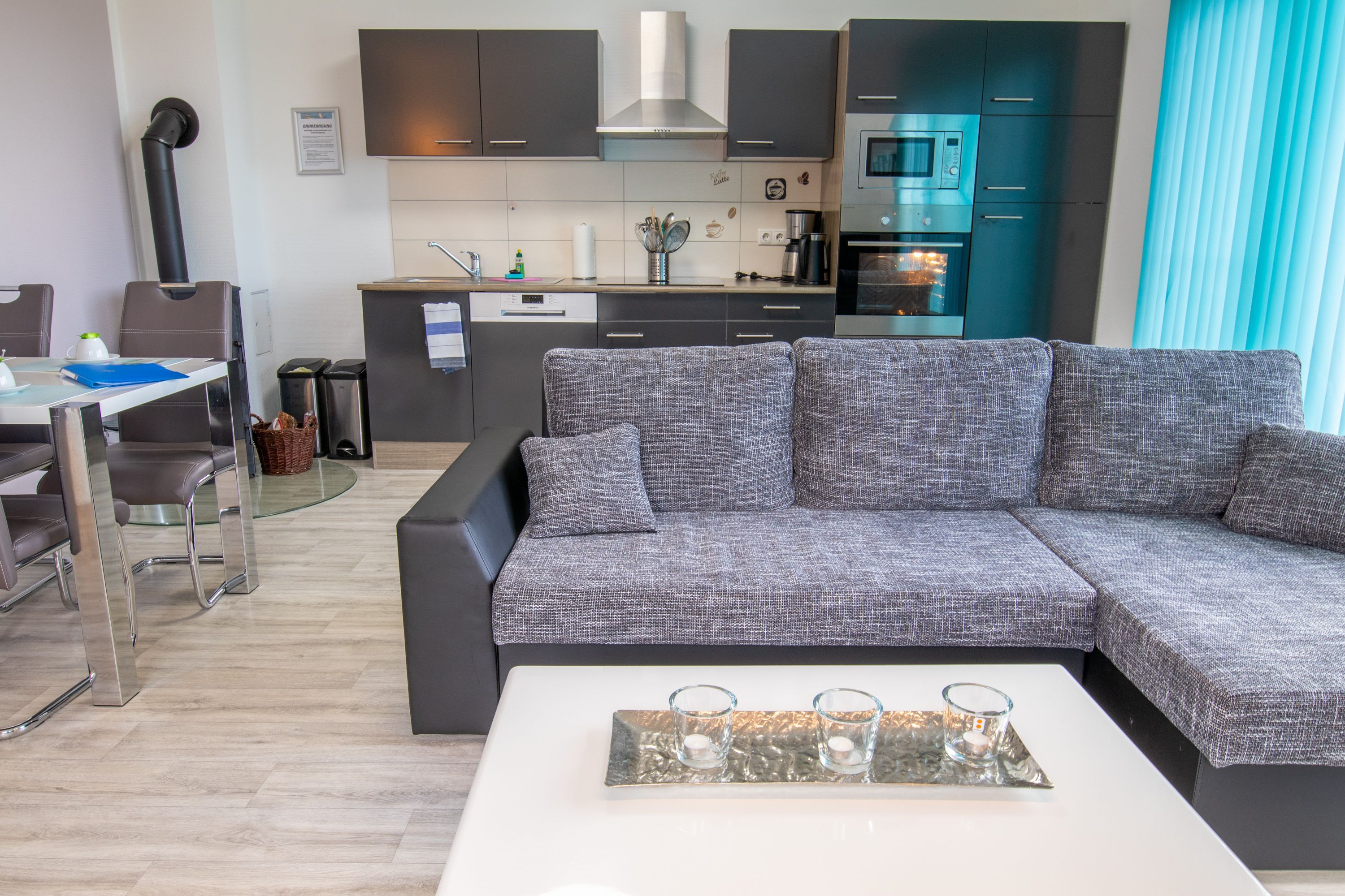 Die 48 m² große Ferienwohnung besteht aus einen Wohnzimmer mit Kamin, Flat Screen-TV, Stereoanlage und Schlafcouch (150x200) für 2 Personen. Weiterhin befindet sich im Wohnraum ein integrierter Küchenbereich mit vollausgestatteter Küche (Herd mit Backofen, Geschirrspüler, Kühlschrank mit Gefrierfach, Kühlschrank, Kaffeemaschine) und einer Essecke mit 4 Stühlen. Im Schlafzimmer befinden sich ein Doppelbett (180x200, getrennte Matratzen), ein großer Schrank für Ihre Garderobe und ein Flachbild-TV. Das Badezimmer ist mit Dusche und WC ausgestattet. Auf dem Flur befinden sich die Garderobe und ein kleiner Schuhschrank.