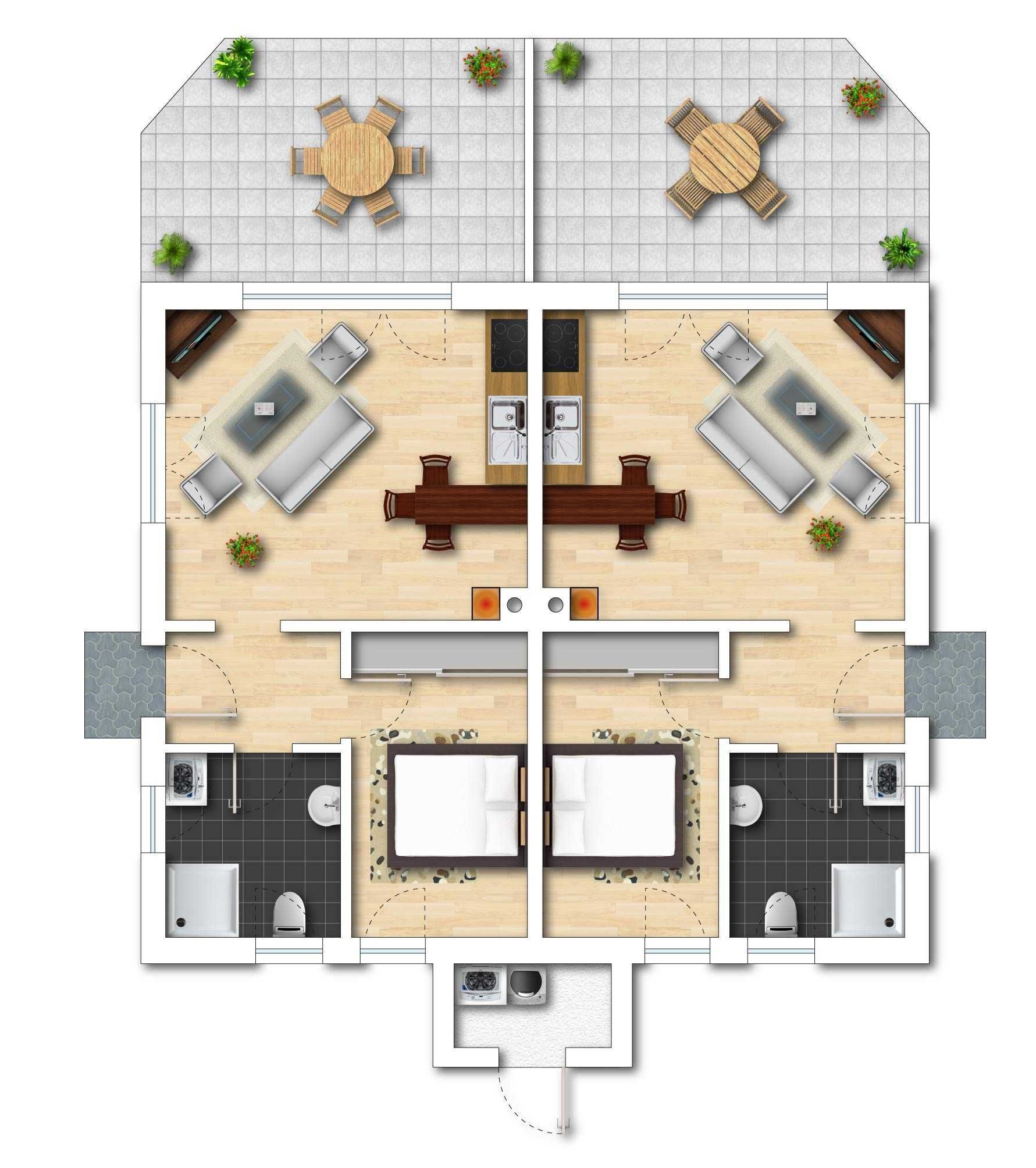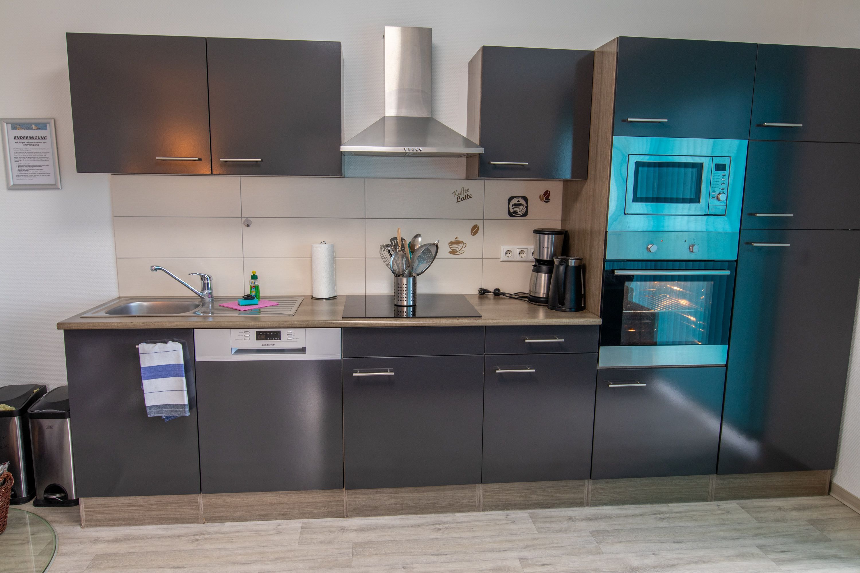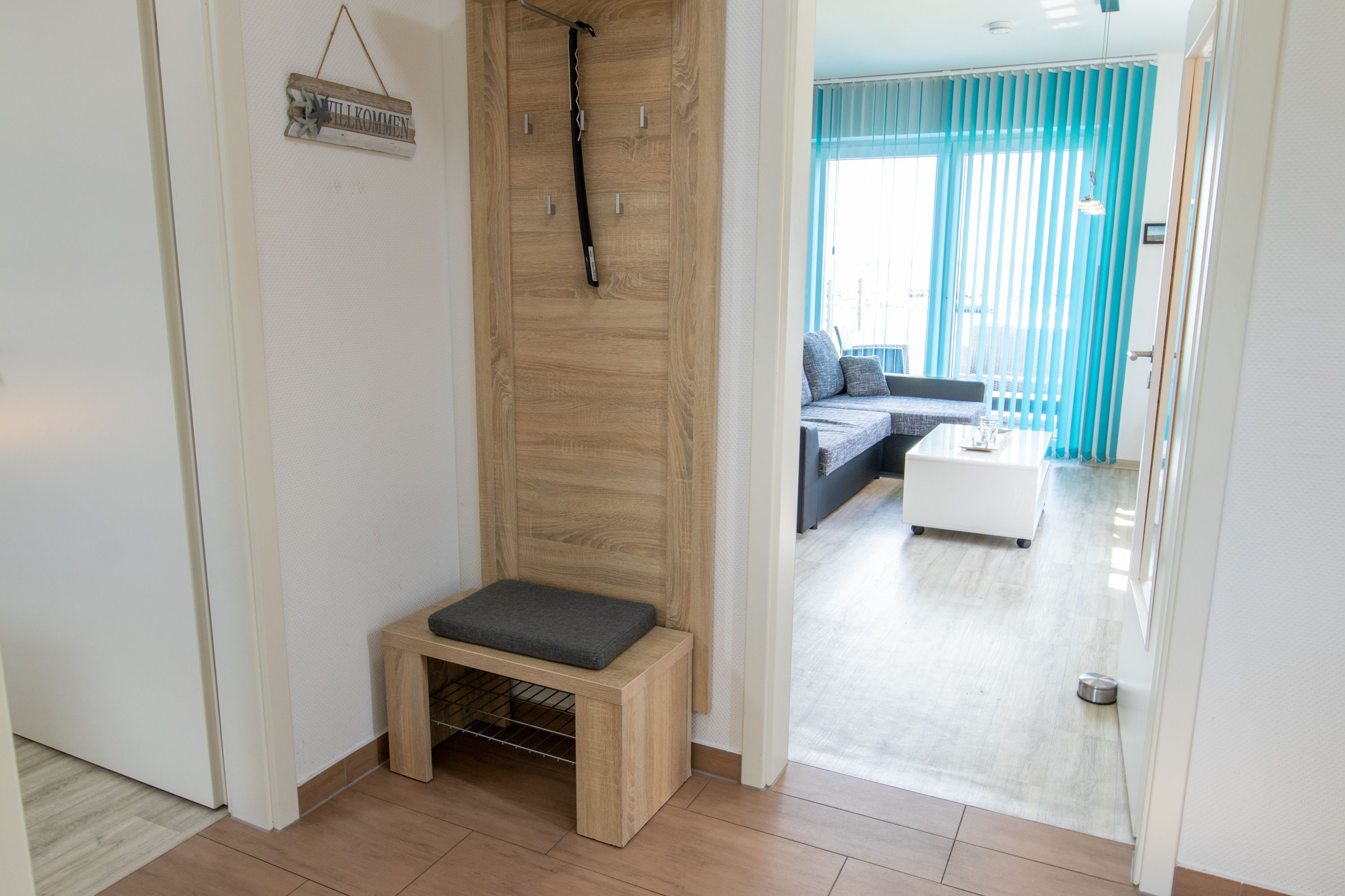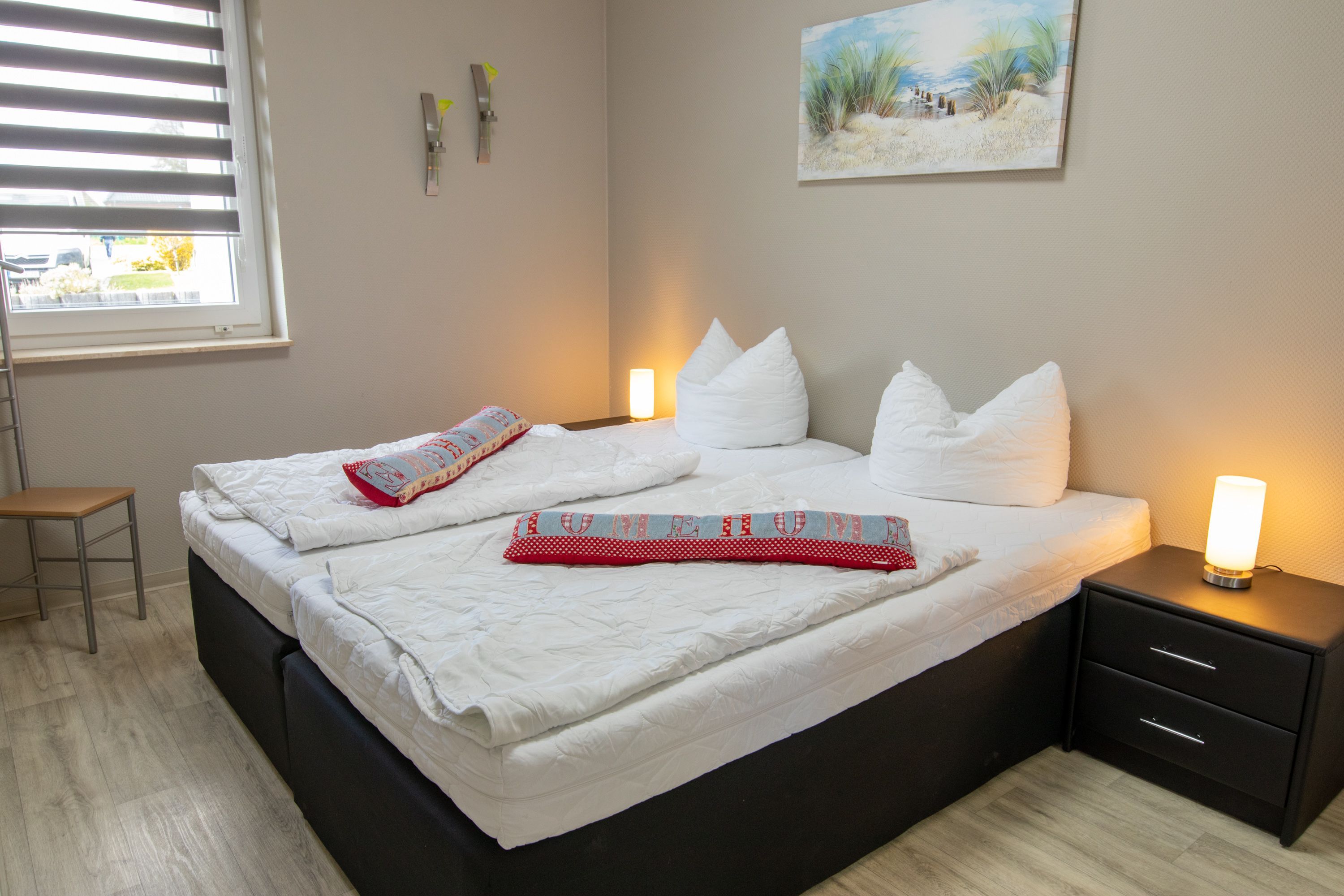 Die 48 m² große Ferienwohnung besteht aus einen Wohnzimmer mit Kamin, Flat Screen-TV, Stereoanlage und Schlafcouch (150x200) für 2 Personen. Weiterhin befindet sich im Wohnraum ein integrierter Küchenbereich mit vollausgestatteter Küche (Herd mit Backofen, Geschirrspüler, Kühlschrank mit Gefrierfach, Kühlschrank, Kaffeemaschine) und einer Essecke mit 4 Stühlen. Im Schlafzimmer befinden sich ein Doppelbett (180x200, getrennte Matratzen), ein großer Schrank für Ihre Garderobe und ein Flachbild-TV. Das Badezimmer ist mit Dusche und WC ausgestattet. Auf dem Flur befinden sich die Garderobe und ein kleiner Schuhschrank.