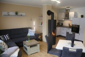 Unser modernes Appartement bietet Ihnen Platz für 2 bis 4 Personen. Der Wohn- und Eßbereich verfügt über eine voll ausgestattete offene Wohnküche mit Induktionskochfeld, Geschirrspüler, Mikrowelle und vielem mehr. Zum Relaxen ist das große Ecksofa mit Schlaffunktion ideal. Damit keine lange Weile aufkommt, stehen ein LED-TV mit großem Bildschirm, Spiele Karten und Bücher bereit. Auf dem Balkon kann man ab den frühen Vormittagsstunden bis zum Sonnenuntergang die Sonne genießen und im Hintergrund das Rauschen der Ostsee hören. In der kühlen Jahreszeit sorgt der Kaminofen für eine gemütliche Atmosphäre. Das Bad verfügt über eine bodentiefe Dusche, Handtuchwärmer und Fön. Im Schlafzimmer sorgt das große Bett von 1,80 m x 2,00 m für einen erholsamen Schlaf. Die hohen bodentiefen Fenster durchfluten das Appartement mit Tageslicht. Im gesamten Appartement ist eine Fußbodenheizung integriert. Für unsere kleinen Gäste stehen ein Babyreisebett sowie ein Hochstuhl bereit. Eine Waschmaschine steht zur kostenfreien Nutzung im Abstellraum bereit, dieser befindet sich in der Ferienwohnung.