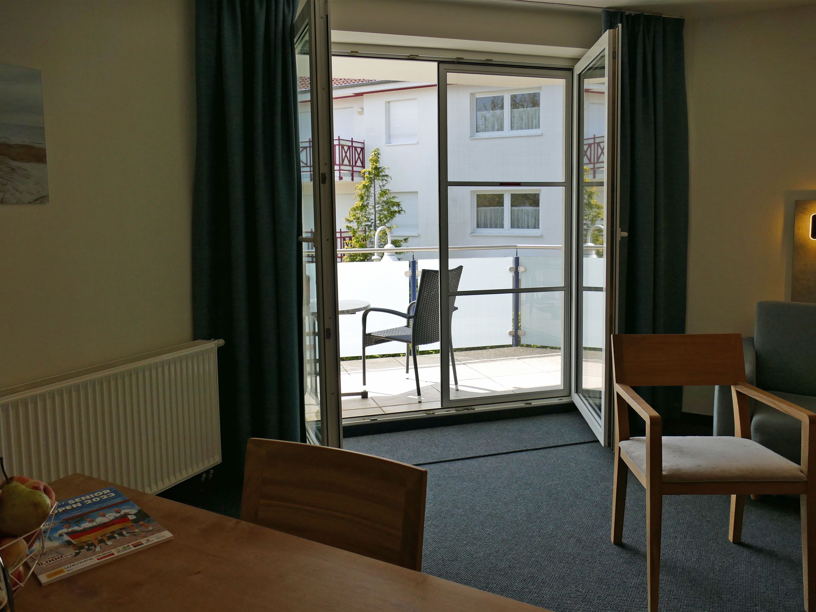 Der Wohnbereich ist einladend gestaltet und mit einem Flachbildfernseher, einer HiFi-Anlage, einer gemütlichen Sofaecke (inklusive Schlaffunktion) sowie einem Essplatz für bis zu vier Personen ausgestattet. Direkt angrenzend befindet sich die funktionale Küchenzeile mit Kühlschrank, Herdplatten und Geschirrspüler. Vom Wohnbereich gelangen Sie auf den Balkon oder die Terrasse, die mit Sitzgelegenheiten zum Entspannen einladen.