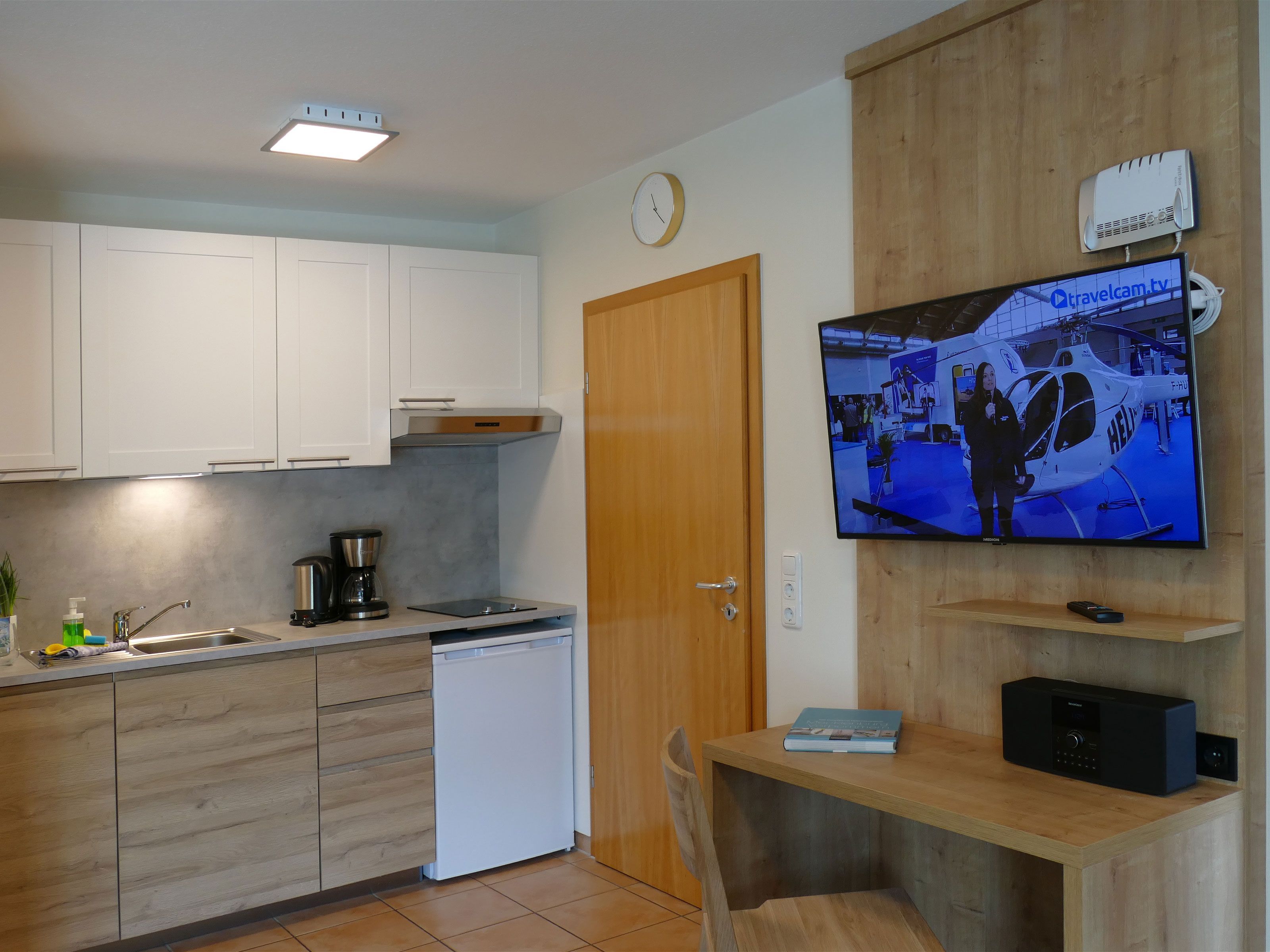 Wohnraum mit Sofa (Schlaffunktion 160/200), Fernseher und Stereoanlage