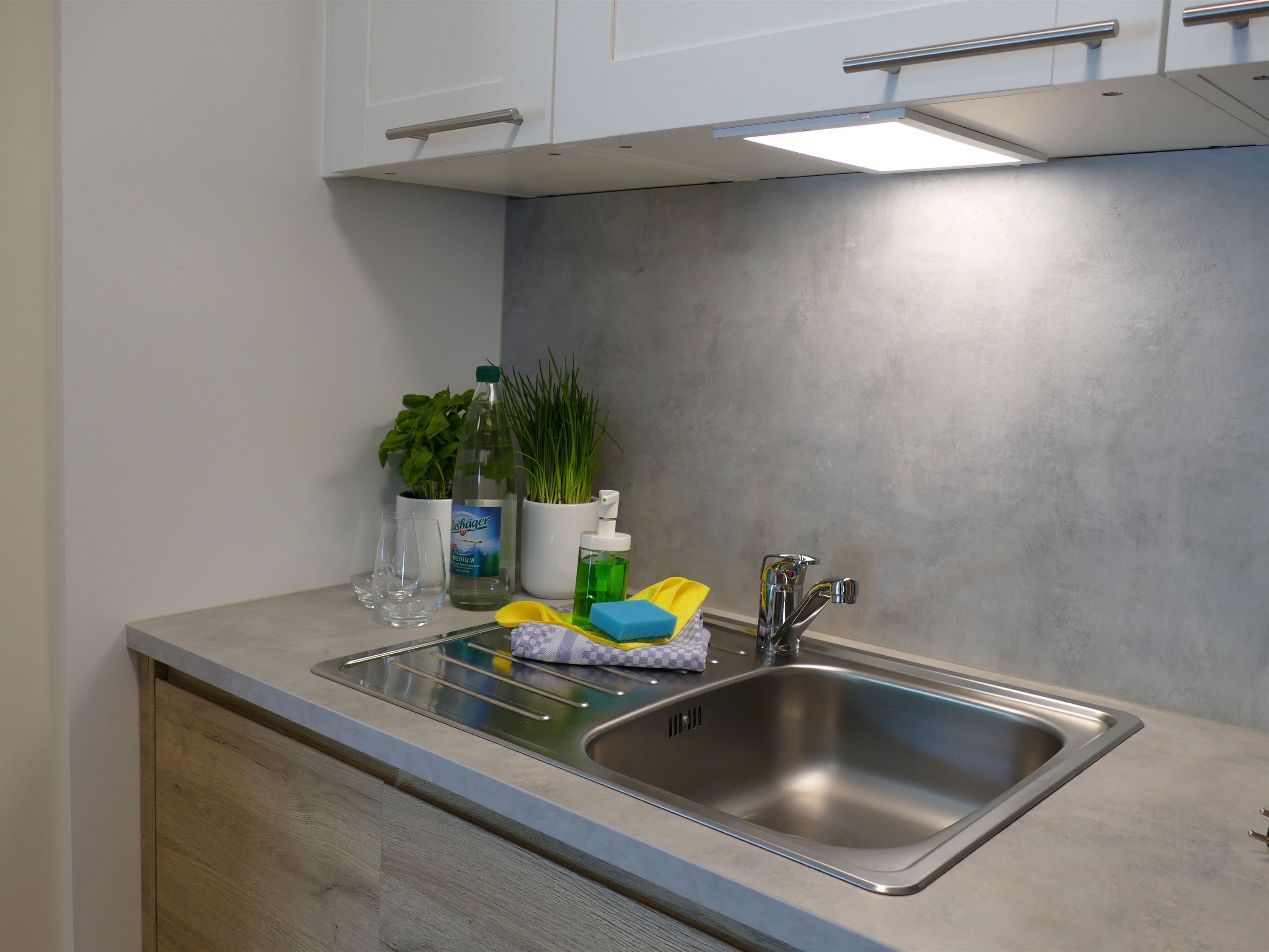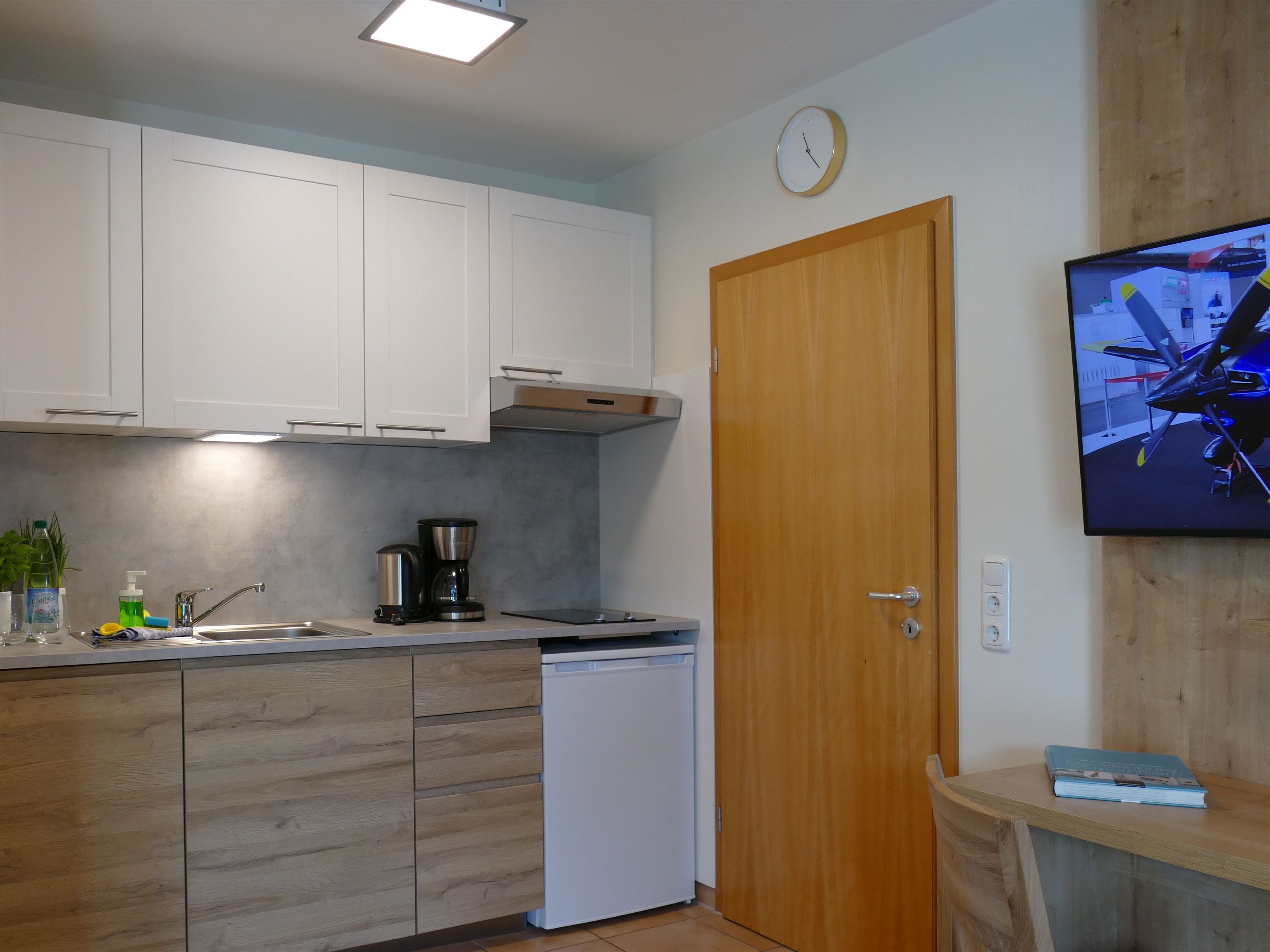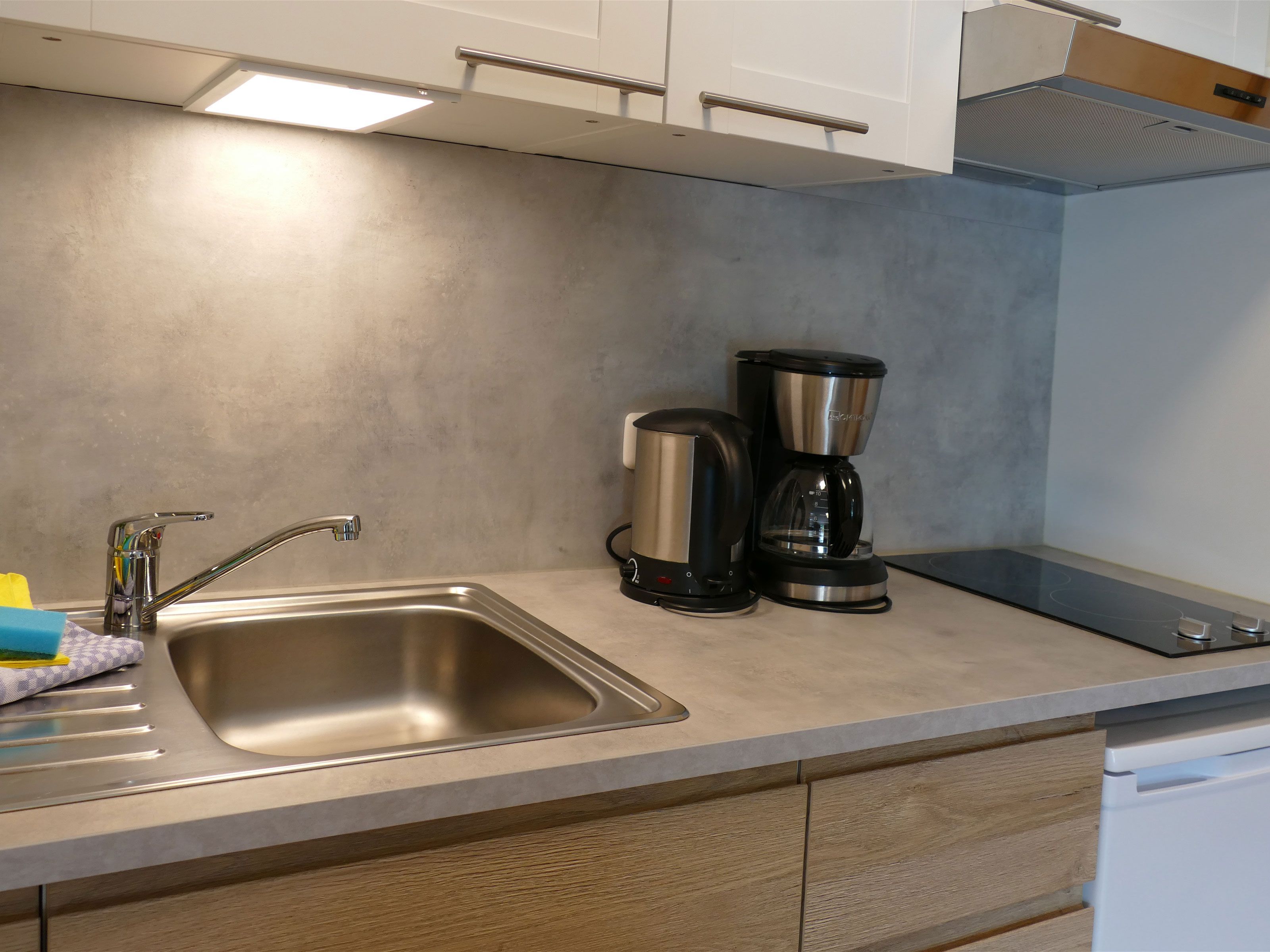 Küche mit 2-Platten-Herd, Geschirrspüler, Kühlschrank, Kaffeemaschine, Wasserkocher, Geschirr u. Besteck u.v.m.