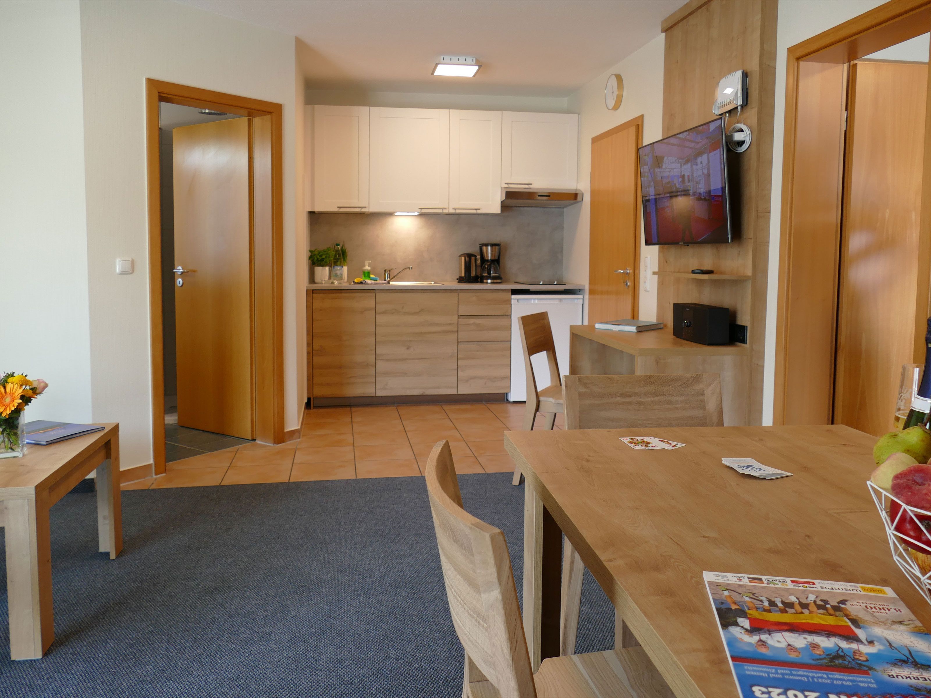 Die Komfort Suiten in der Pension Maiglöckchen, prämiert mit drei Sternen von der DEHOGA, bieten eine angenehme Kombination aus moderner Ausstattung und gemütlichem Ambiente. Auf etwa 50 m² erwarten Sie ein geräumiger Wohnbereich mit Küchenzeile und Balkon, ein separates Schlafzimmer, ein hochwertig ausgestattetes Badezimmer sowie zahlreiche Details, die Ihren Aufenthalt besonders bequem machen.