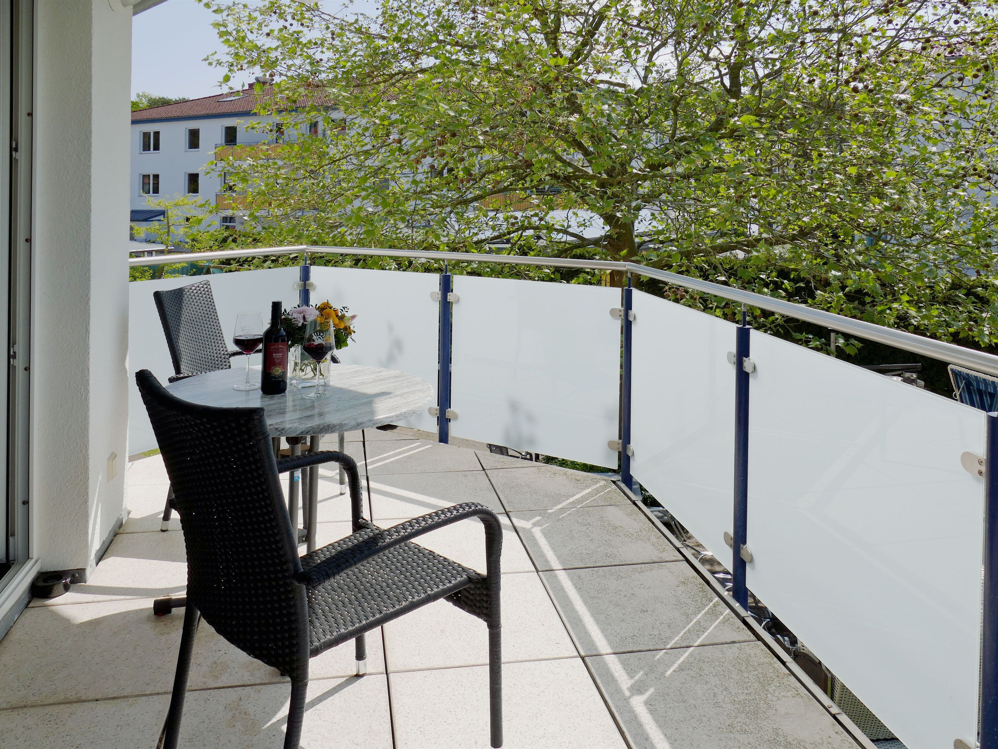 großer Balkon bzw. Terrasse mit Gartenmöbeln für 4 Personen