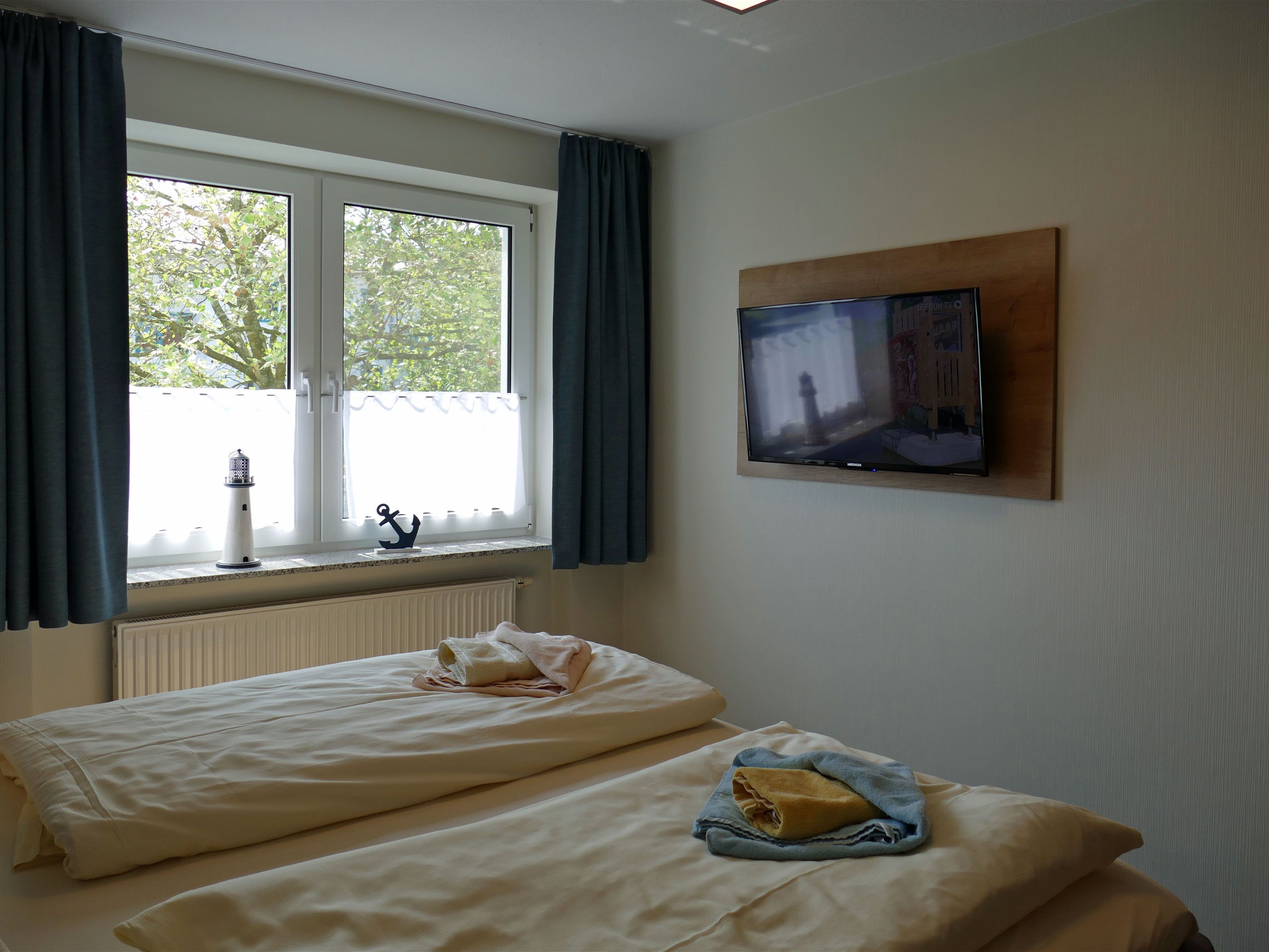 1 Schlafzimmer mit 2 vollwertigen Betten (90/200), Kleiderschrank und einem zusätzlichem Fernseher