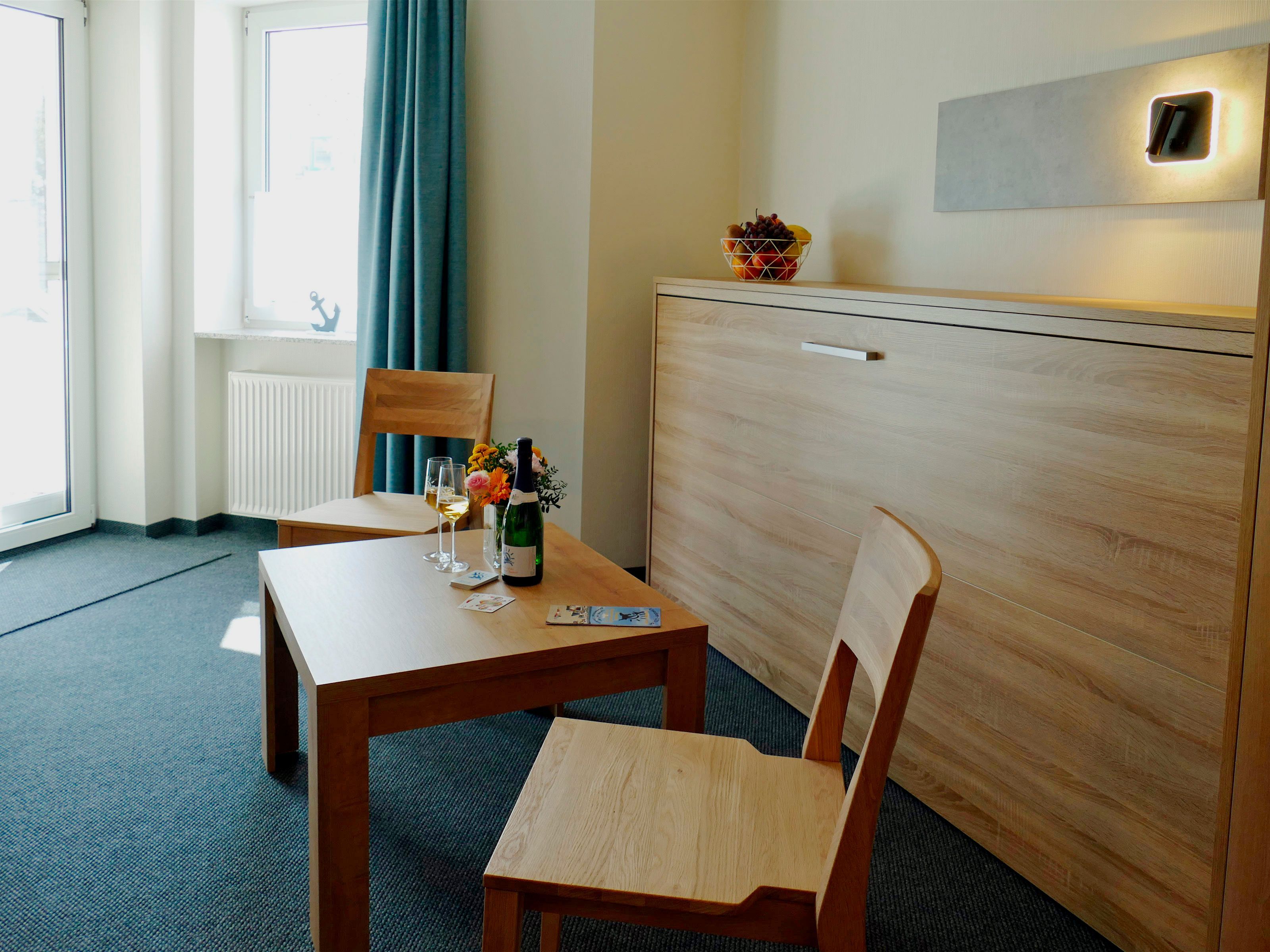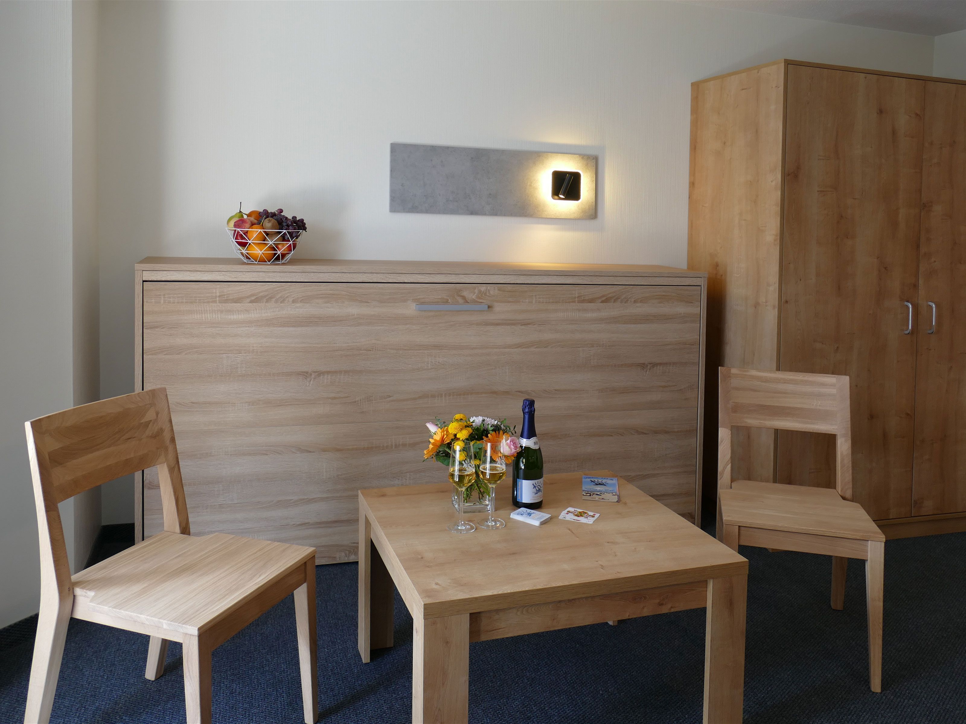 Der Schlafbereich verfügt über ein komfortables Doppelbett sowie ein integriertes Schrankbett, das zusätzlichen Schlafplatz schafft, ohne den Raum einzuengen. Eine kleine Sitzecke, ein großzügiger Kleiderschrank und ein praktischer Schreibtisch ergänzen die Ausstattung. Für Unterhaltung sorgt ein moderner Flachbildfernseher mit integrierter Musikanlage, der sowohl große als auch kleine Gäste begeistert.