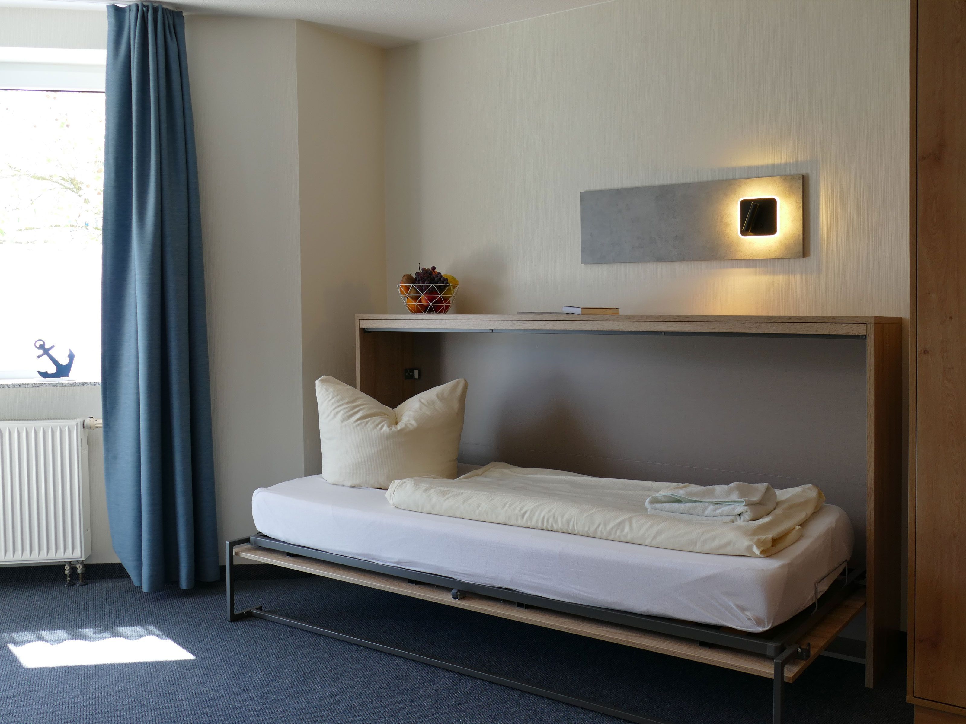 Der Schlafbereich verfügt über ein komfortables Doppelbett sowie ein integriertes Schrankbett, das zusätzlichen Schlafplatz schafft, ohne den Raum einzuengen. Eine kleine Sitzecke, ein großzügiger Kleiderschrank und ein praktischer Schreibtisch ergänzen die Ausstattung. Für Unterhaltung sorgt ein moderner Flachbildfernseher mit integrierter Musikanlage, der sowohl große als auch kleine Gäste begeistert.