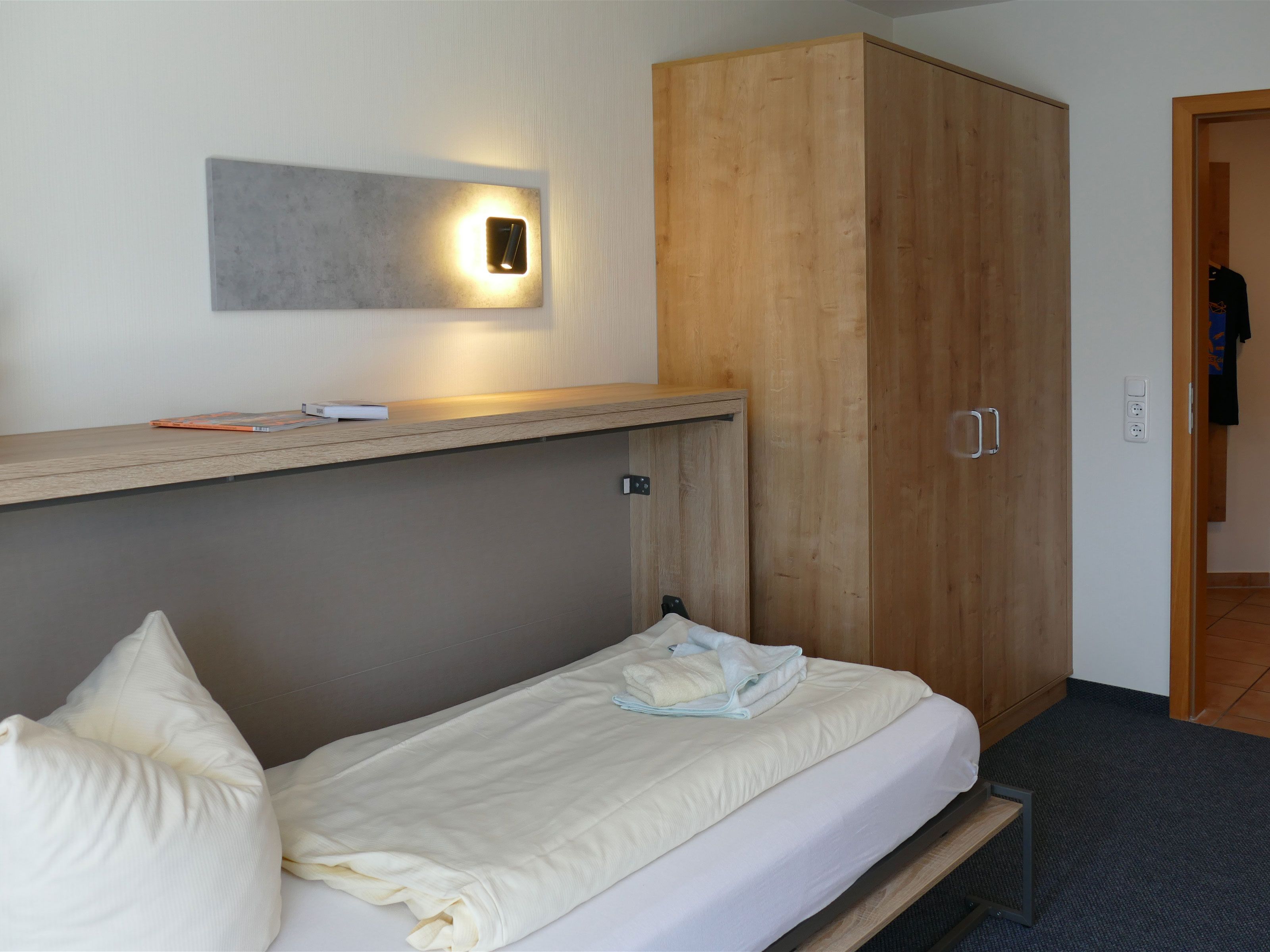 Der Schlafbereich verfügt über ein komfortables Doppelbett sowie ein integriertes Schrankbett, das zusätzlichen Schlafplatz schafft, ohne den Raum einzuengen. Eine kleine Sitzecke, ein großzügiger Kleiderschrank und ein praktischer Schreibtisch ergänzen die Ausstattung. Für Unterhaltung sorgt ein moderner Flachbildfernseher mit integrierter Musikanlage, der sowohl große als auch kleine Gäste begeistert.