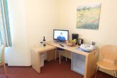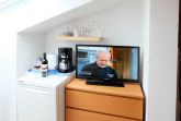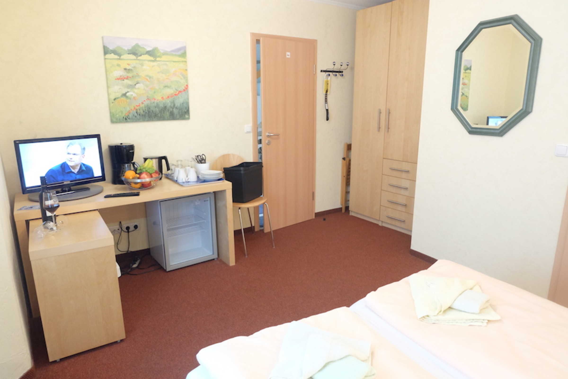Kühlschrank, Kaffeemaschine, Wasserkocher, Geschirr und Besteck u.v.m. im Zimmer; keine Kochmöglichkeit