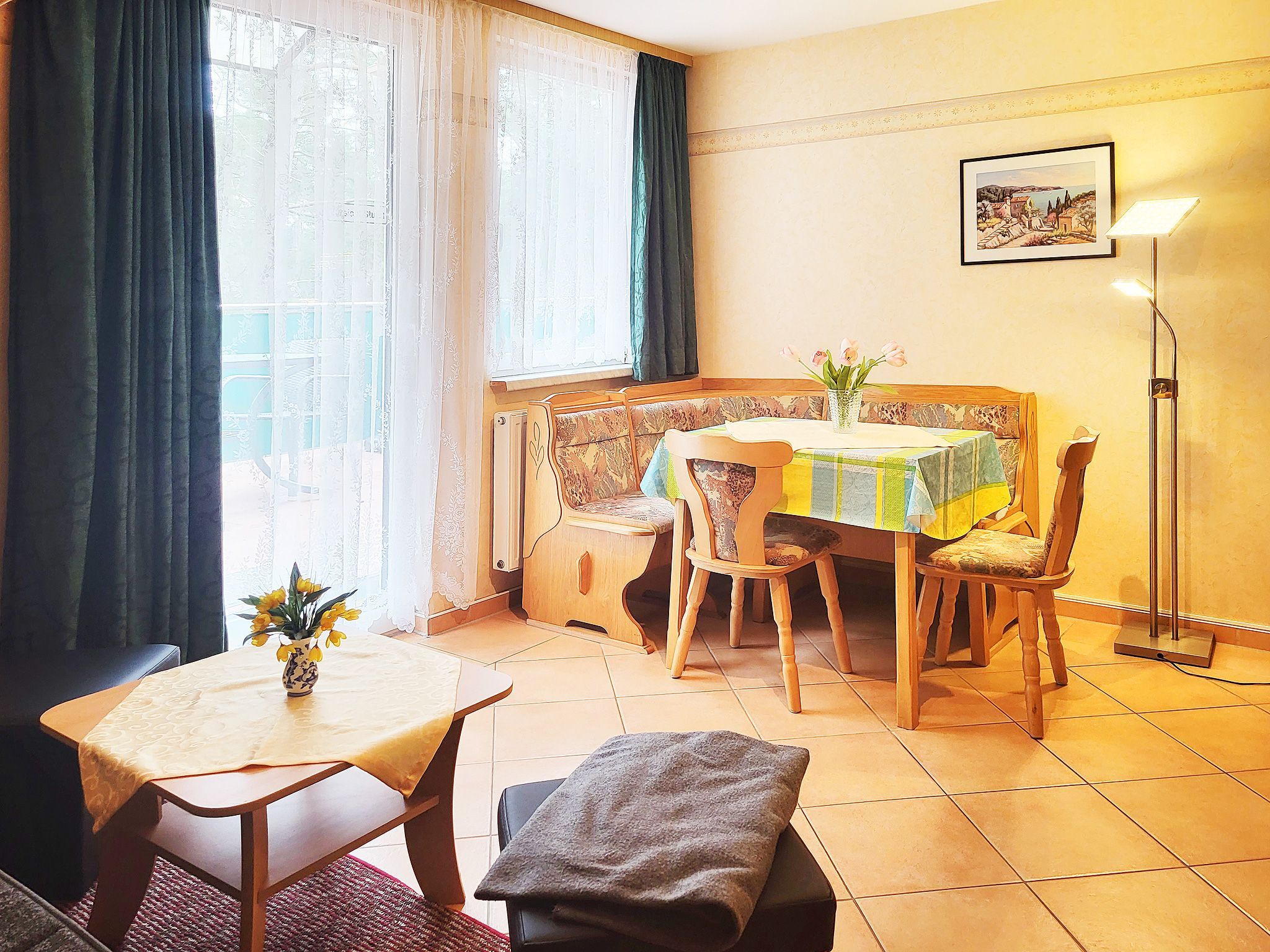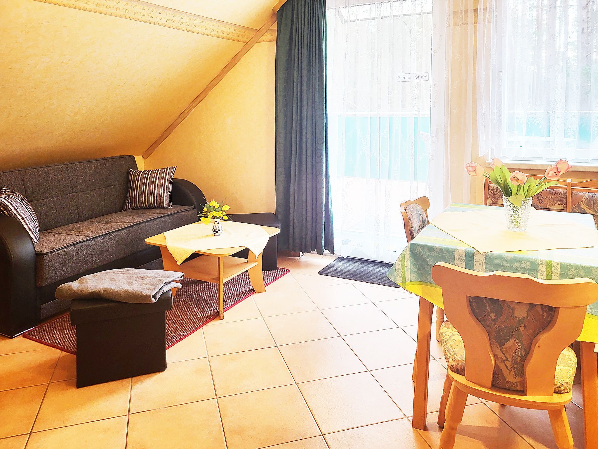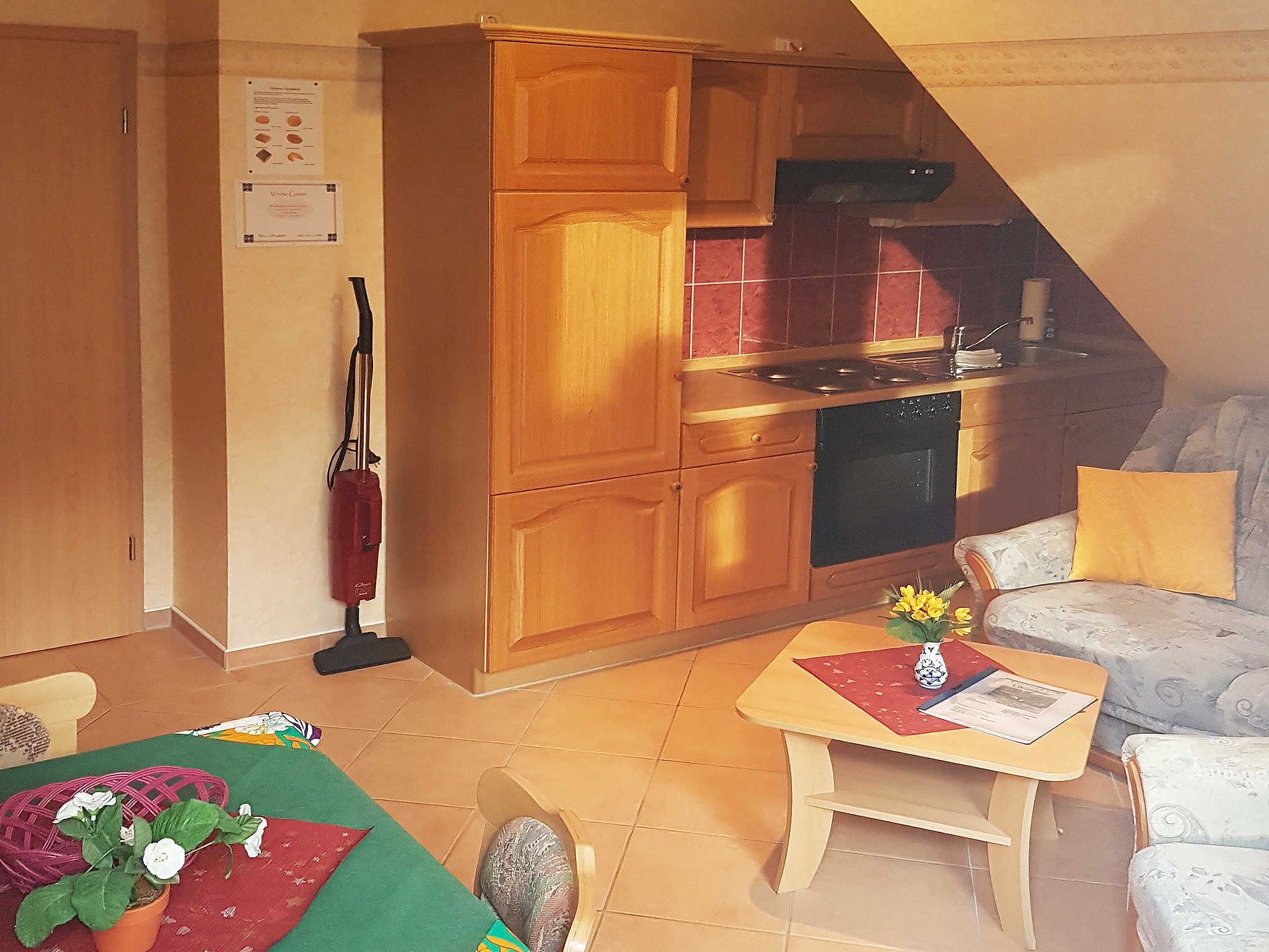 2 Raum-Wohng. bis 2 Pers., 1 SZ, Küche, Wohnzimmer, Bad, mit Dusche/WC, Flur, Terrasse o. Balkon. Frühstücksbüfett mit Voranmeldung möglich und auch Abendessen à la carte. Haustiere nur auf Anfrage!