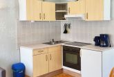 Küche mit 4 Plattenherd, Mikrowelle, Kühlschrank, Kaffeemaschine, Toaster,
