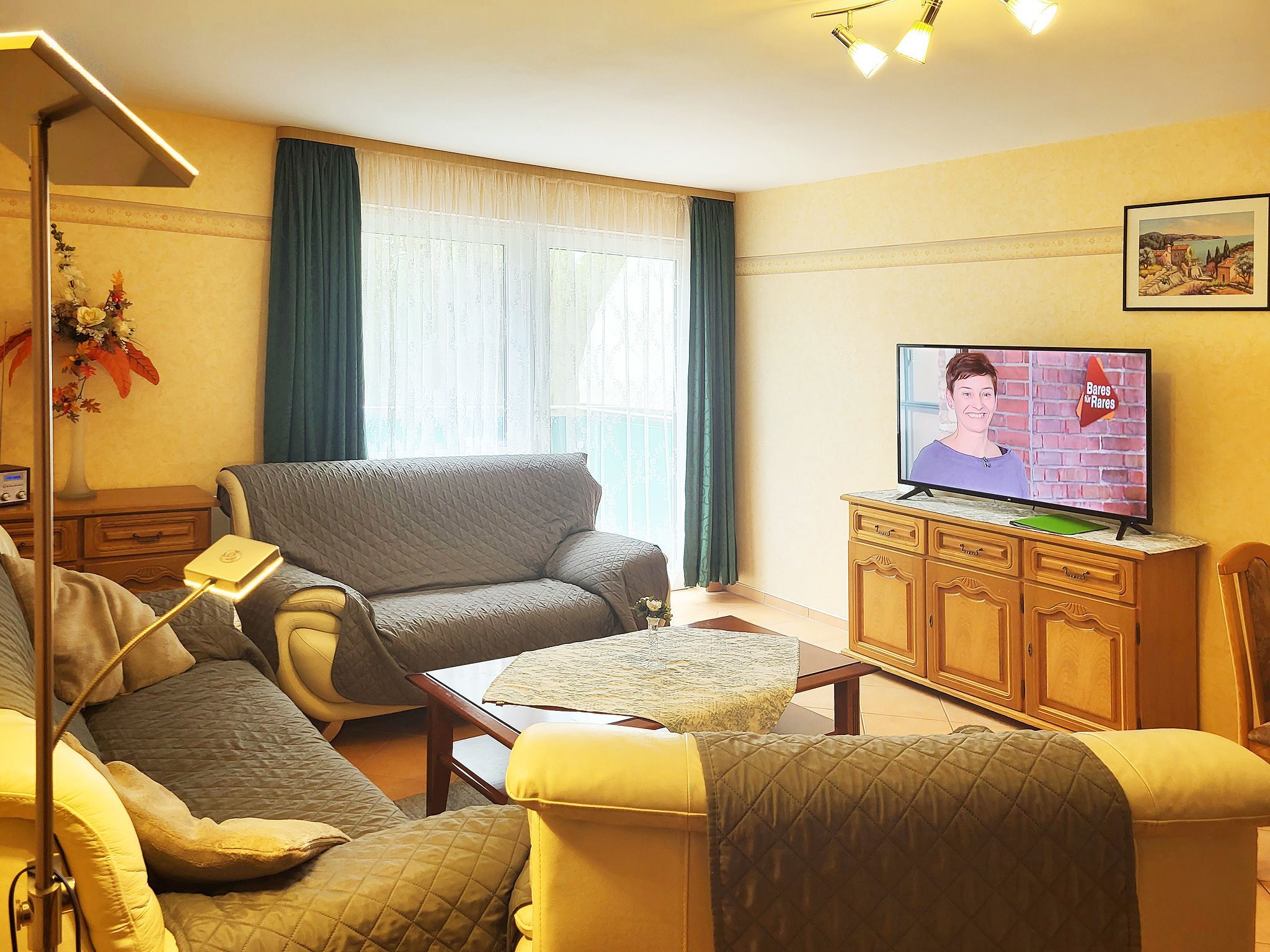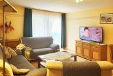 Wohnzimmer mit Saidbord, Doppelbett-Couch und Sessel, Radio, Flachbild- TV
