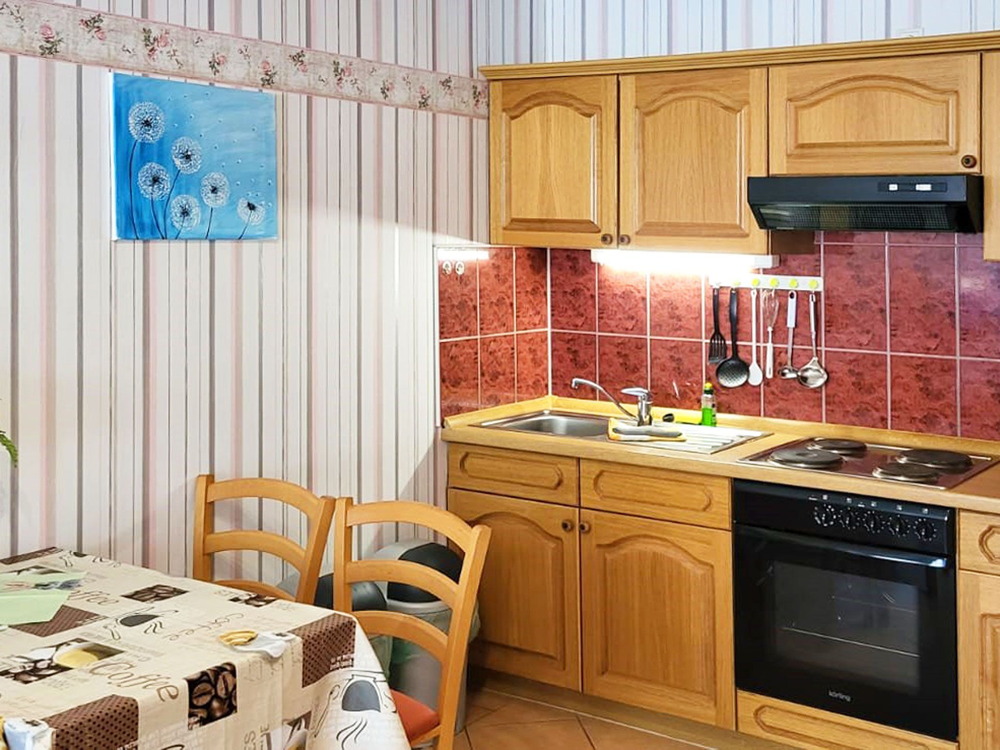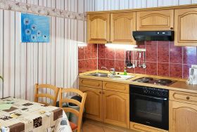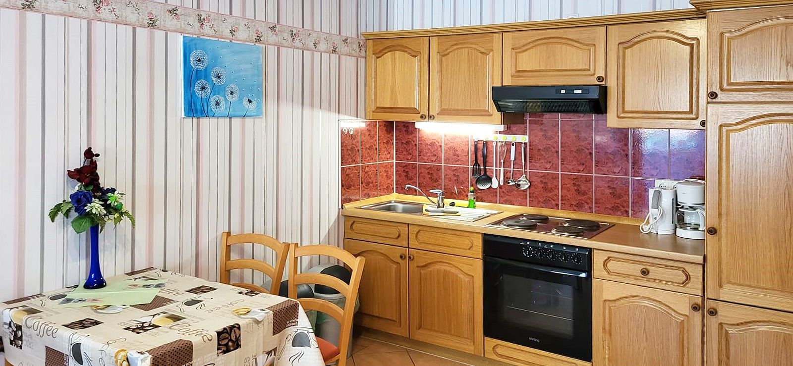 Küche mit 4 Plattenherd, Mikrowelle, Kühlschrank, Kaffeemaschine, Toaster,