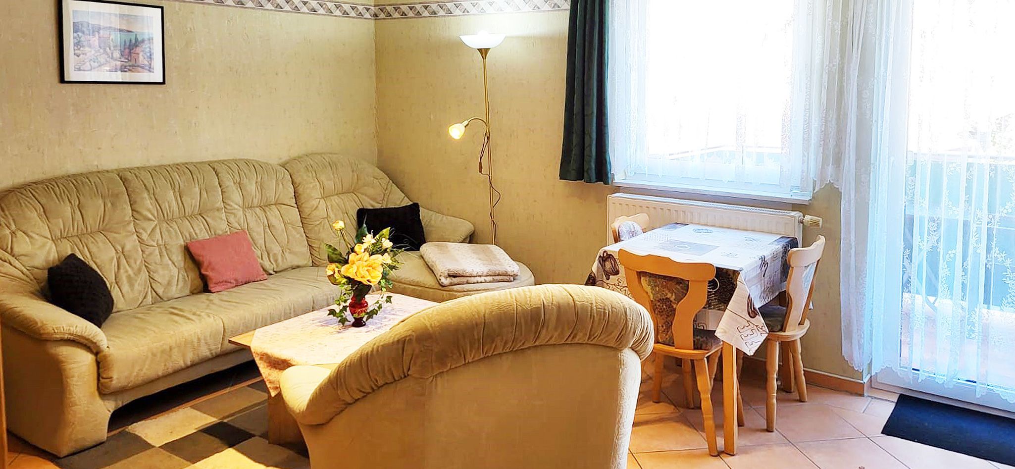 3 Raum-Wohng., 2 SZ (1 DB, 2 EB für Kinder 5-17 J.) Küche, Wohn Bad mit Dusche/WC, Flur, Balkon, Terrasse, Haustiere nur auf Anfrage! Frühstücksbüfett mit Voranmeldung möglich und auch Abendessen à la carte.