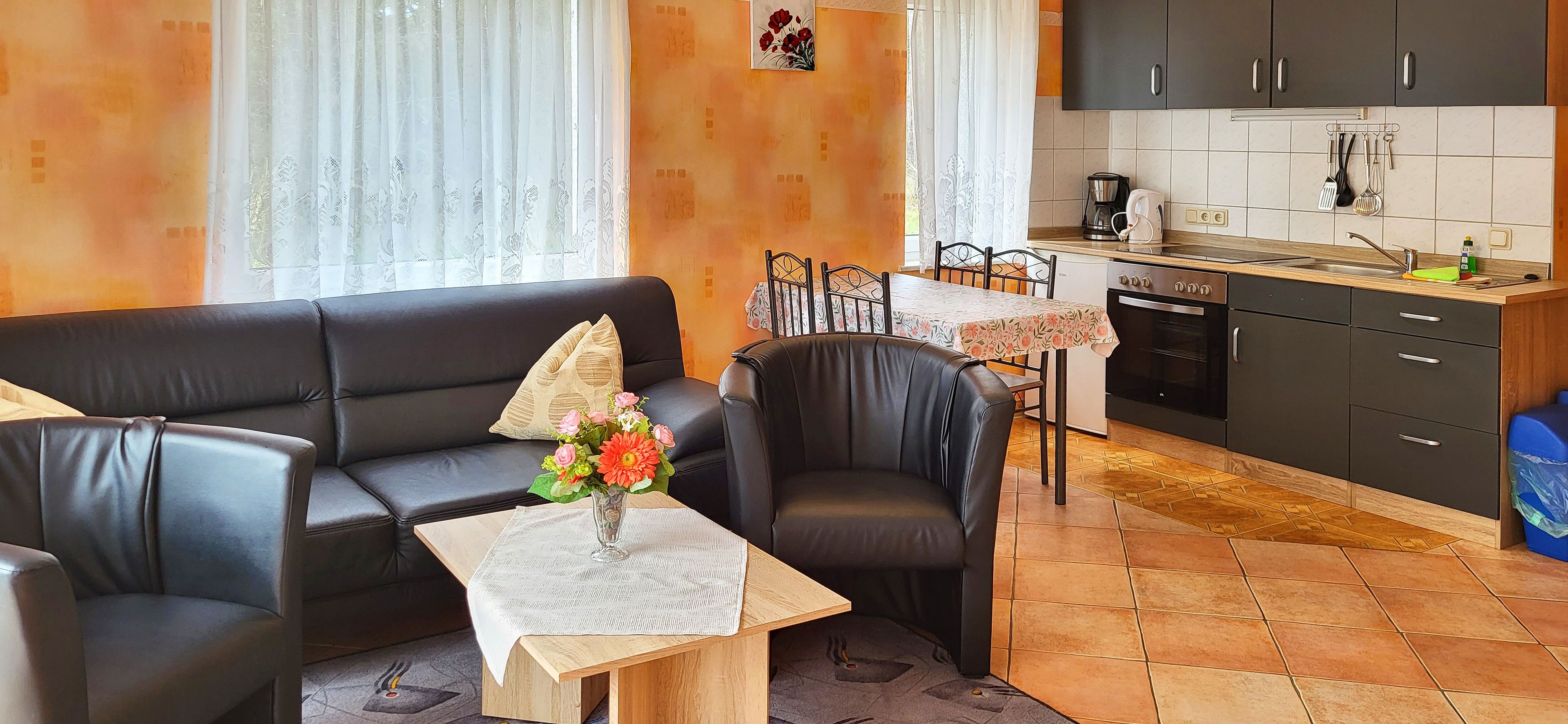 3 Raum-Wohng., 2 Schlafzimmer, Küche, Wohnzimmer, Bad mit Dusche/WC, Flur, Terrasse, Haustiere nur auf Anfrage! Frühstücksbüfett mit Voranmeldung möglich und auch Abendessen à la carte.