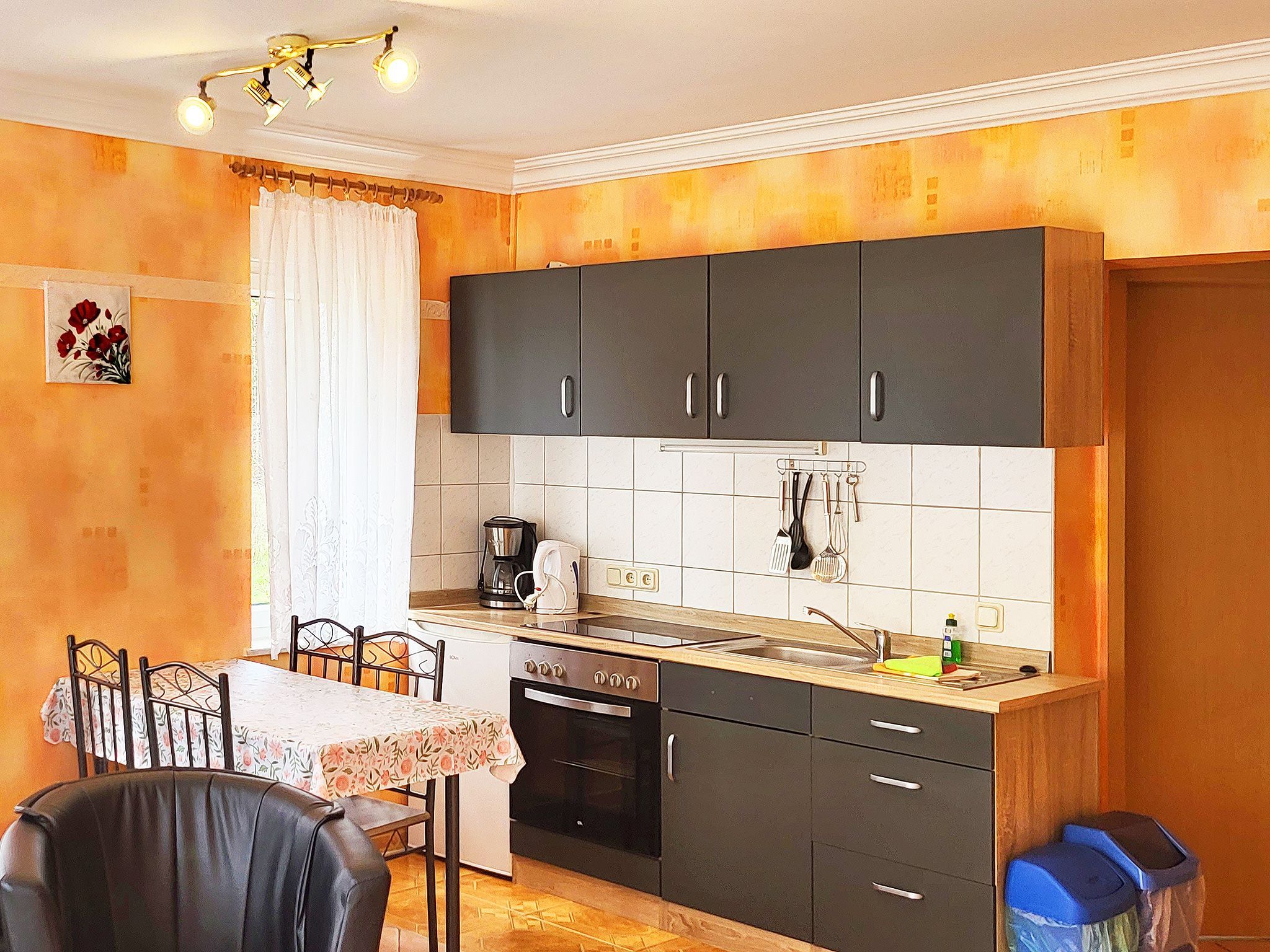 Küche mit 4 Plattenherd, Mikrowelle, Kühlschrank, Kaffeemaschine, Toaster,