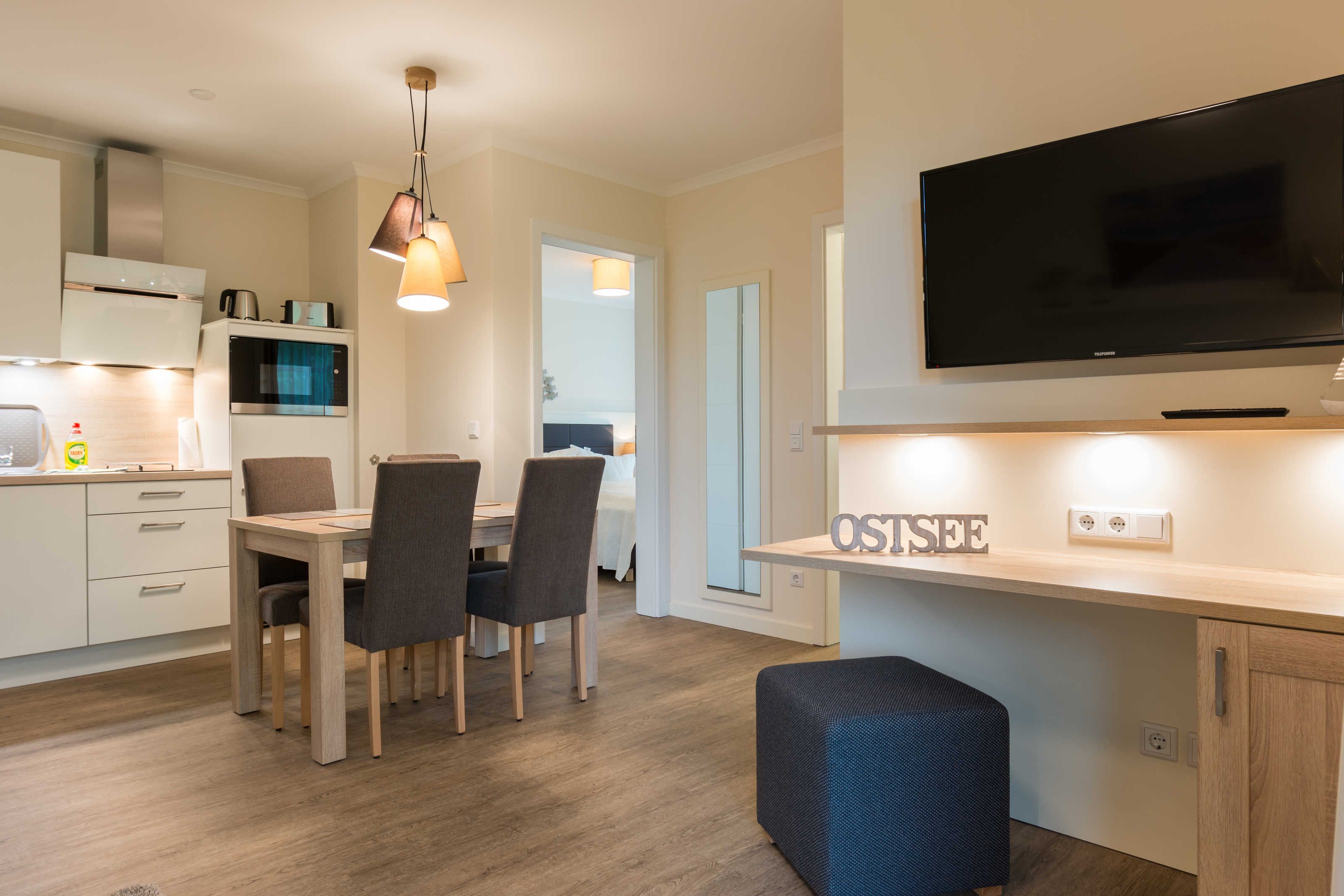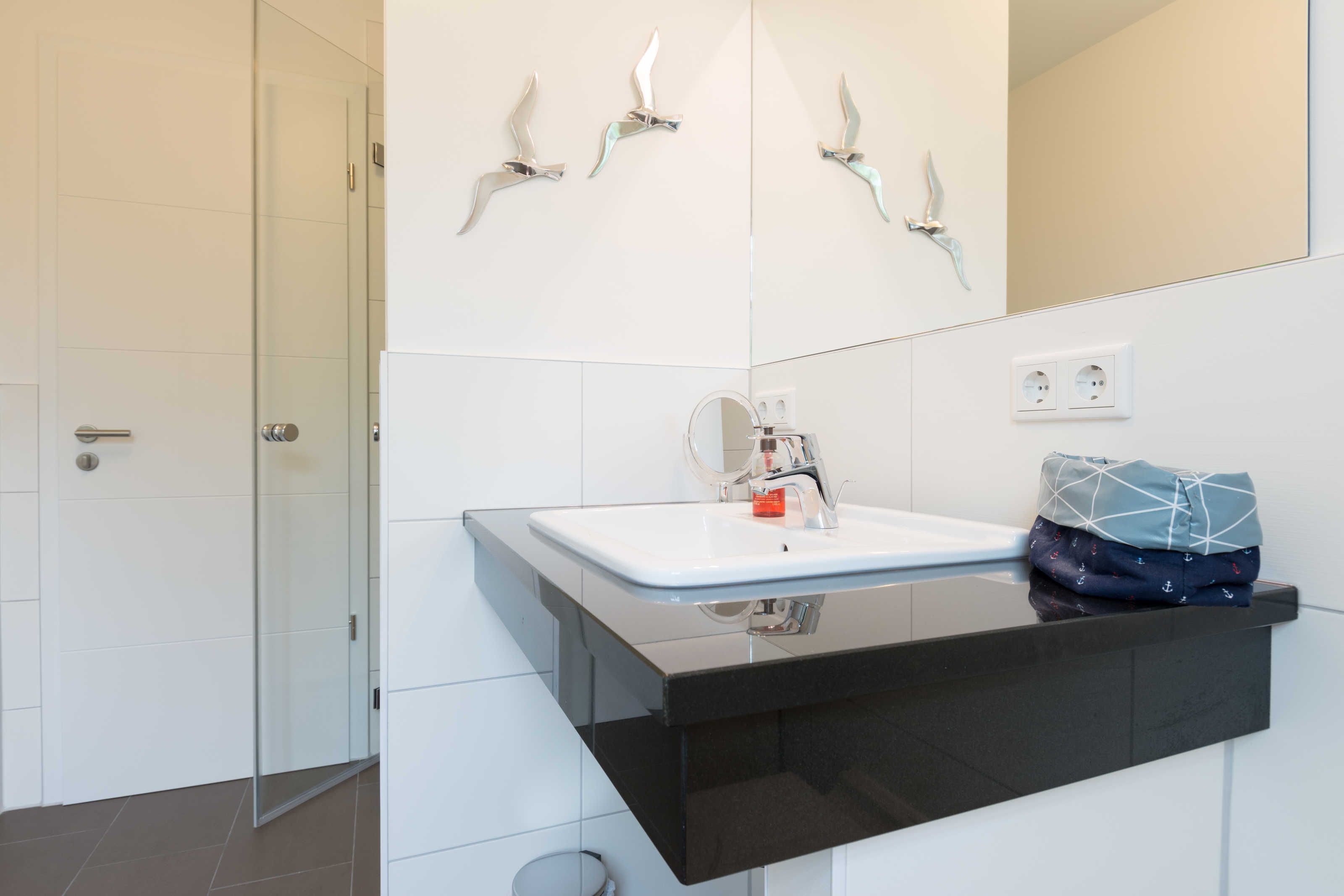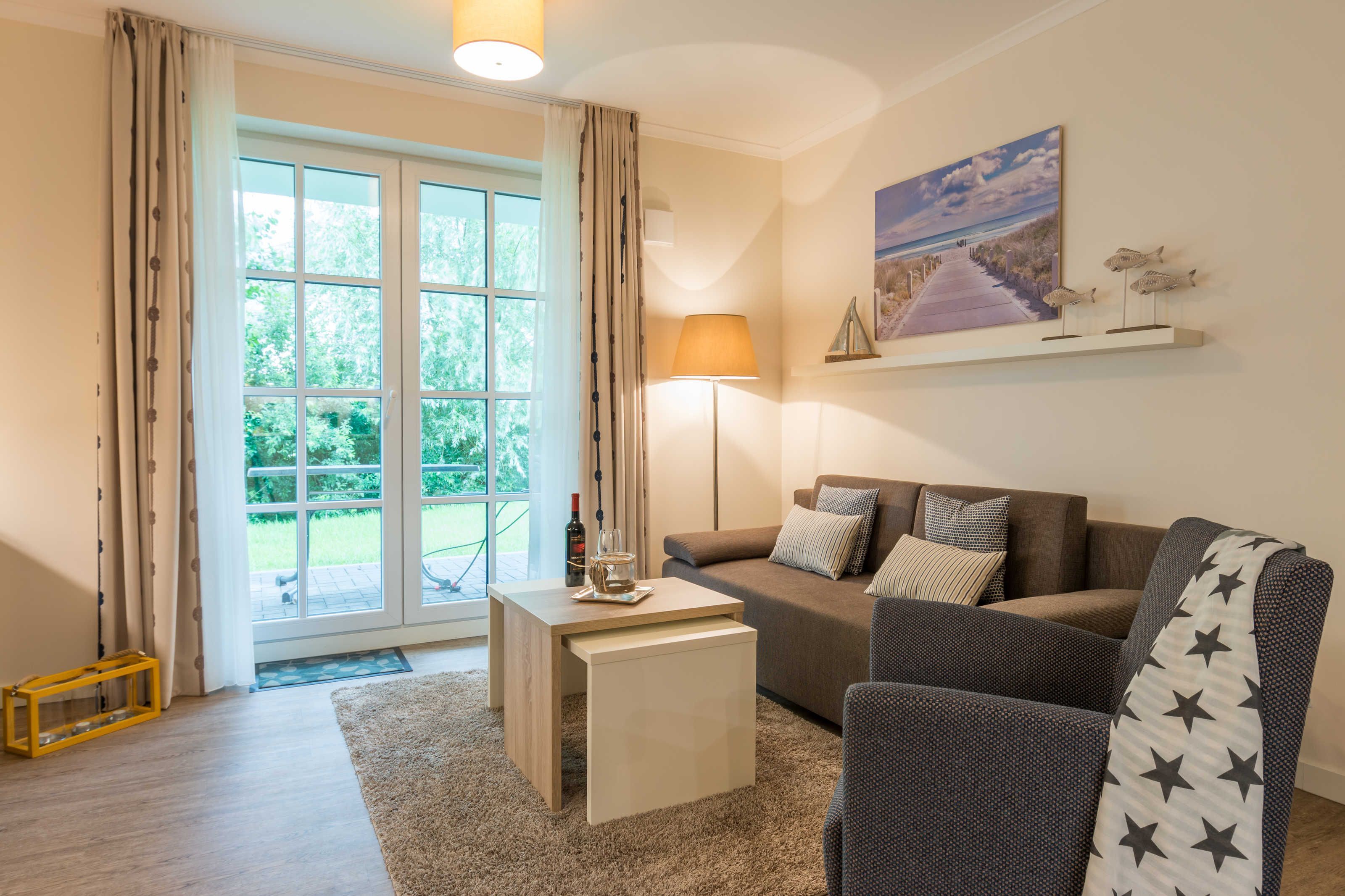 Der Wohnbereich ist modern und zeitlos im maritimen Stil ausgestattet und verfügt über eine gemütliche Schlafcouch inkl. Sessel und Hocker, einen Couchtisch, einen Esstisch mit 4 Stühlen sowie einen LED-TV, einen DVD-Player und eine Musikanlage. Im großen Schlafzimmer finden Sie neben einem weiteren LED-TV ein komfortables BoxSpringbett (1,80 x 2,00 m mit zwei einzelnen Matratzen) und einen geräumigen Kleiderschrank vor. Das kleinere Schlafzimmer ist mit einer Schlafcouch (1,50 x 2,00 m) und einen weiteren Kleiderschrank ausgestattet. Die hochwertige Einbauküche lässt keine Wünsche offen. Sie verfügt über Geschirrspüler, Kühlschrank mit Gefrierfach, Kaffeemaschine, Nespressomaschine, Wasserkocher, Toaster, ausreichend Geschirr und Besteck, 2-Platten-Herd (Ceran) und eine Mikrowelle mit Grillfunktion. Das Badezimmer ist mit einer bodengleichen Dusche, einem großen Waschtisch, einem Fön, einem Wandspiegel und einem Fenster ausgestattet. An Herbst- und Wintertagen sorgt in allen Räumen eine Fußbodenheizung für Wärme und Gemütlichkeit. Auf der mit Tisch und vier Stühlen möblierten Terrasse (süd-westliche Ausrichtung) lassen sich gemütliche Sonnen- und Abendstunden verbringen.