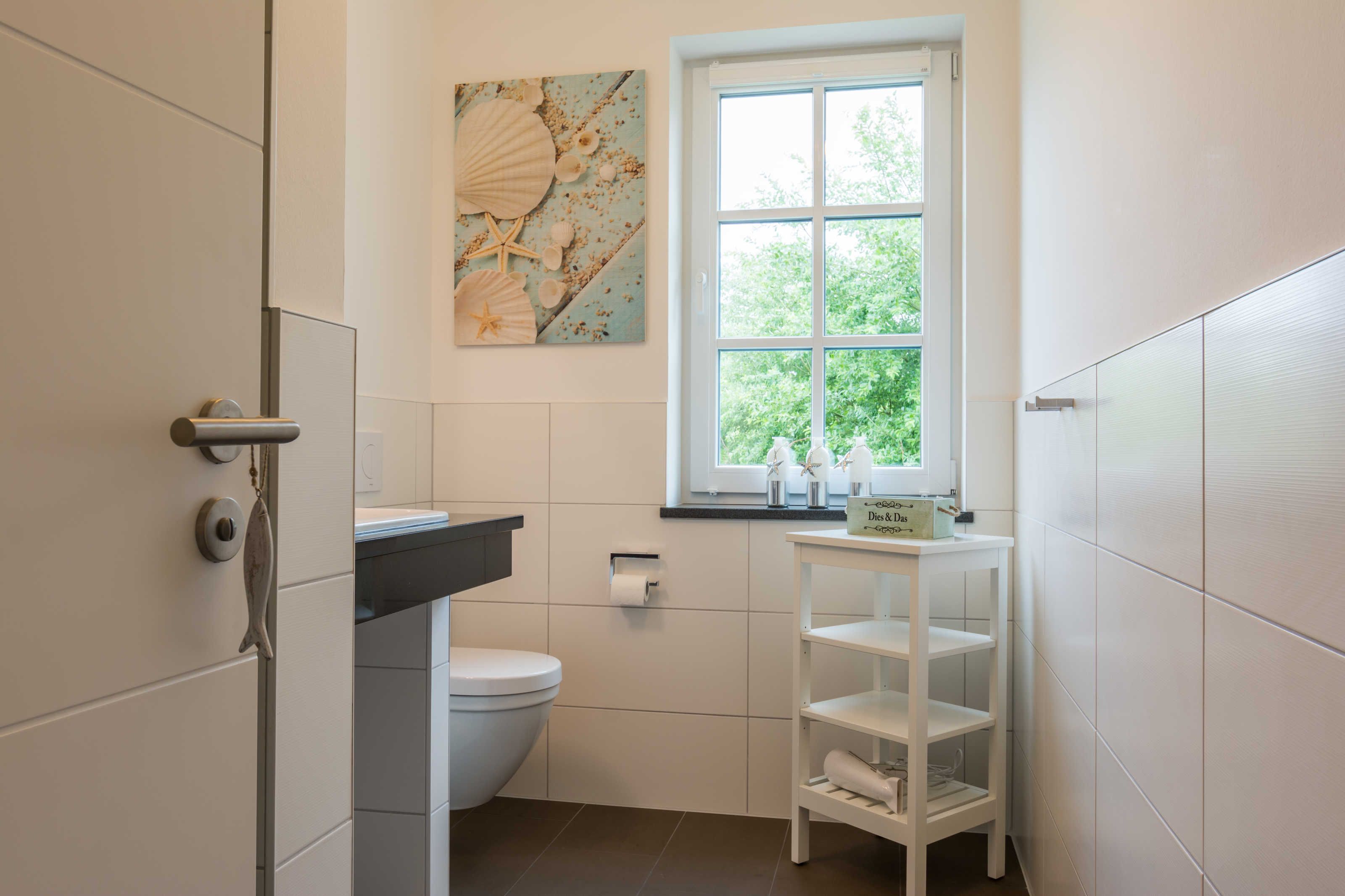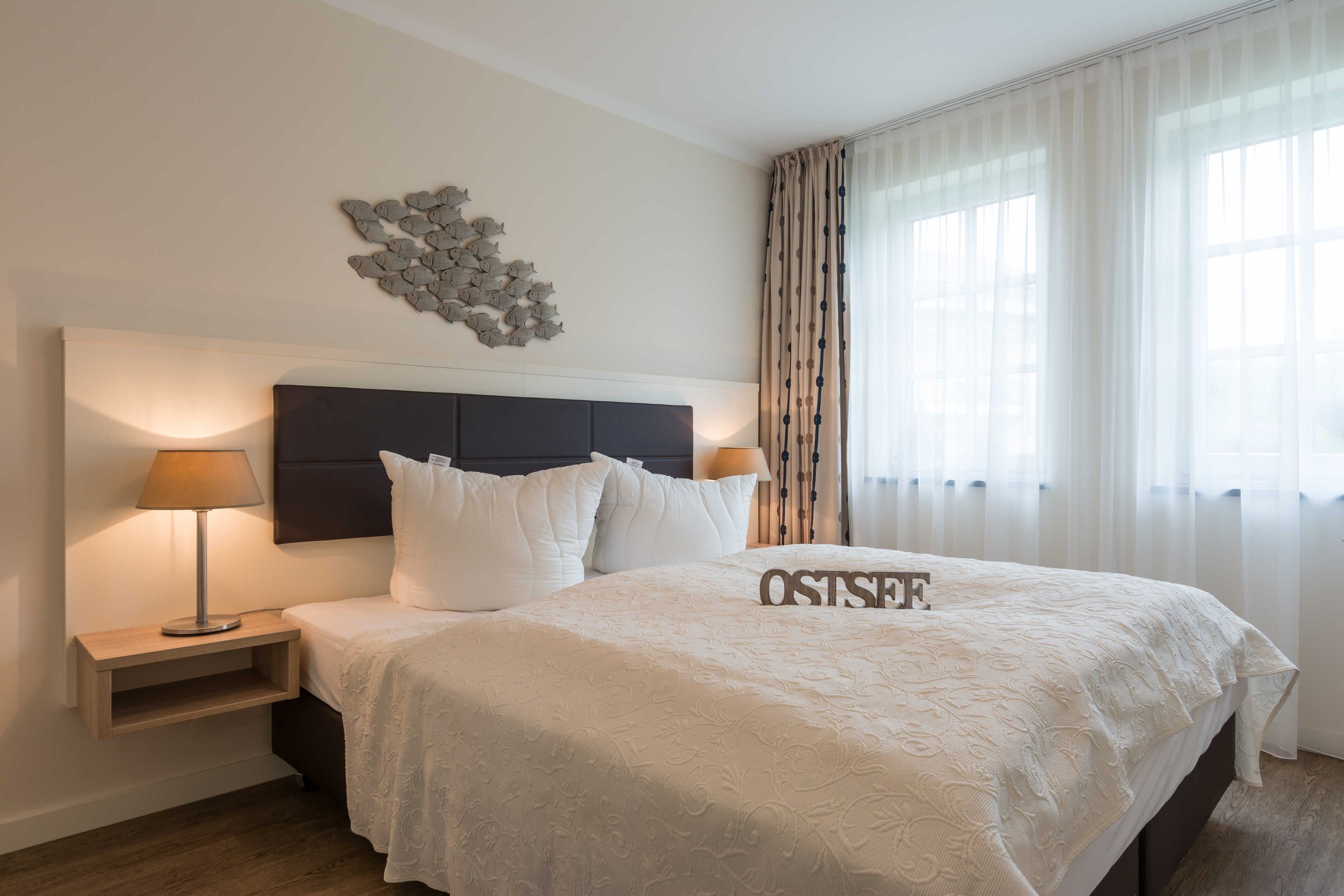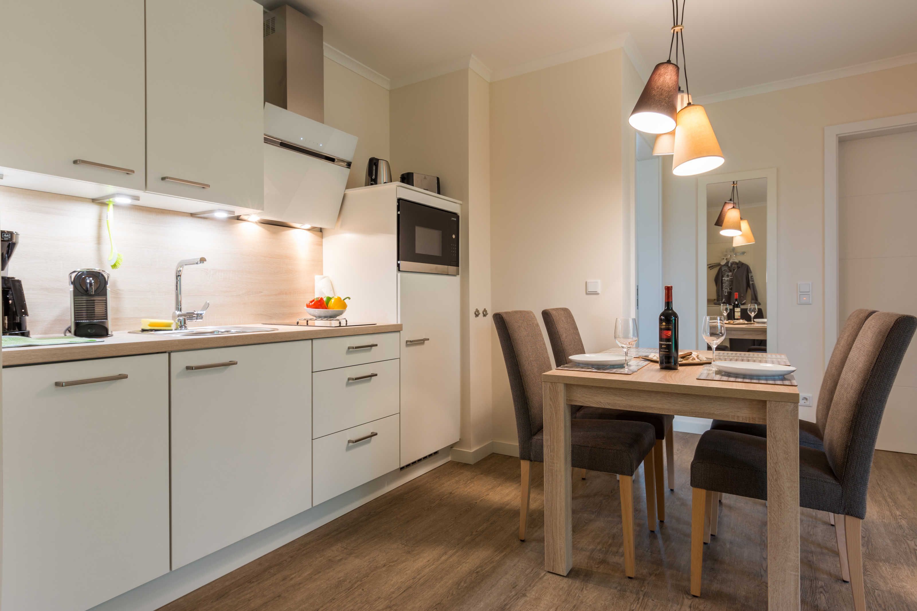 Der Wohnbereich ist modern und zeitlos im maritimen Stil ausgestattet und verfügt über eine gemütliche Schlafcouch inkl. Sessel und Hocker, einen Couchtisch, einen Esstisch mit 4 Stühlen sowie einen LED-TV, einen DVD-Player und eine Musikanlage. Im großen Schlafzimmer finden Sie neben einem weiteren LED-TV ein komfortables BoxSpringbett (1,80 x 2,00 m mit zwei einzelnen Matratzen) und einen geräumigen Kleiderschrank vor. Das kleinere Schlafzimmer ist mit einer Schlafcouch (1,50 x 2,00 m) und einen weiteren Kleiderschrank ausgestattet. Die hochwertige Einbauküche lässt keine Wünsche offen. Sie verfügt über Geschirrspüler, Kühlschrank mit Gefrierfach, Kaffeemaschine, Nespressomaschine, Wasserkocher, Toaster, ausreichend Geschirr und Besteck, 2-Platten-Herd (Ceran) und eine Mikrowelle mit Grillfunktion. Das Badezimmer ist mit einer bodengleichen Dusche, einem großen Waschtisch, einem Fön, einem Wandspiegel und einem Fenster ausgestattet. An Herbst- und Wintertagen sorgt in allen Räumen eine Fußbodenheizung für Wärme und Gemütlichkeit. Auf der mit Tisch und vier Stühlen möblierten Terrasse (süd-westliche Ausrichtung) lassen sich gemütliche Sonnen- und Abendstunden verbringen.