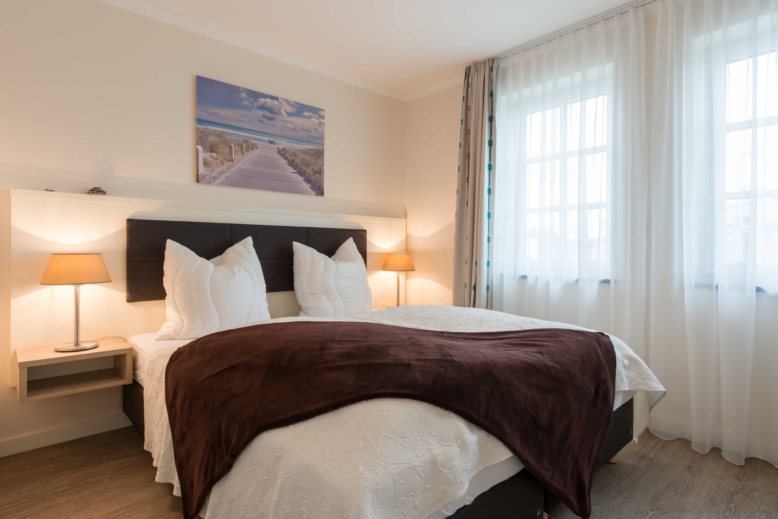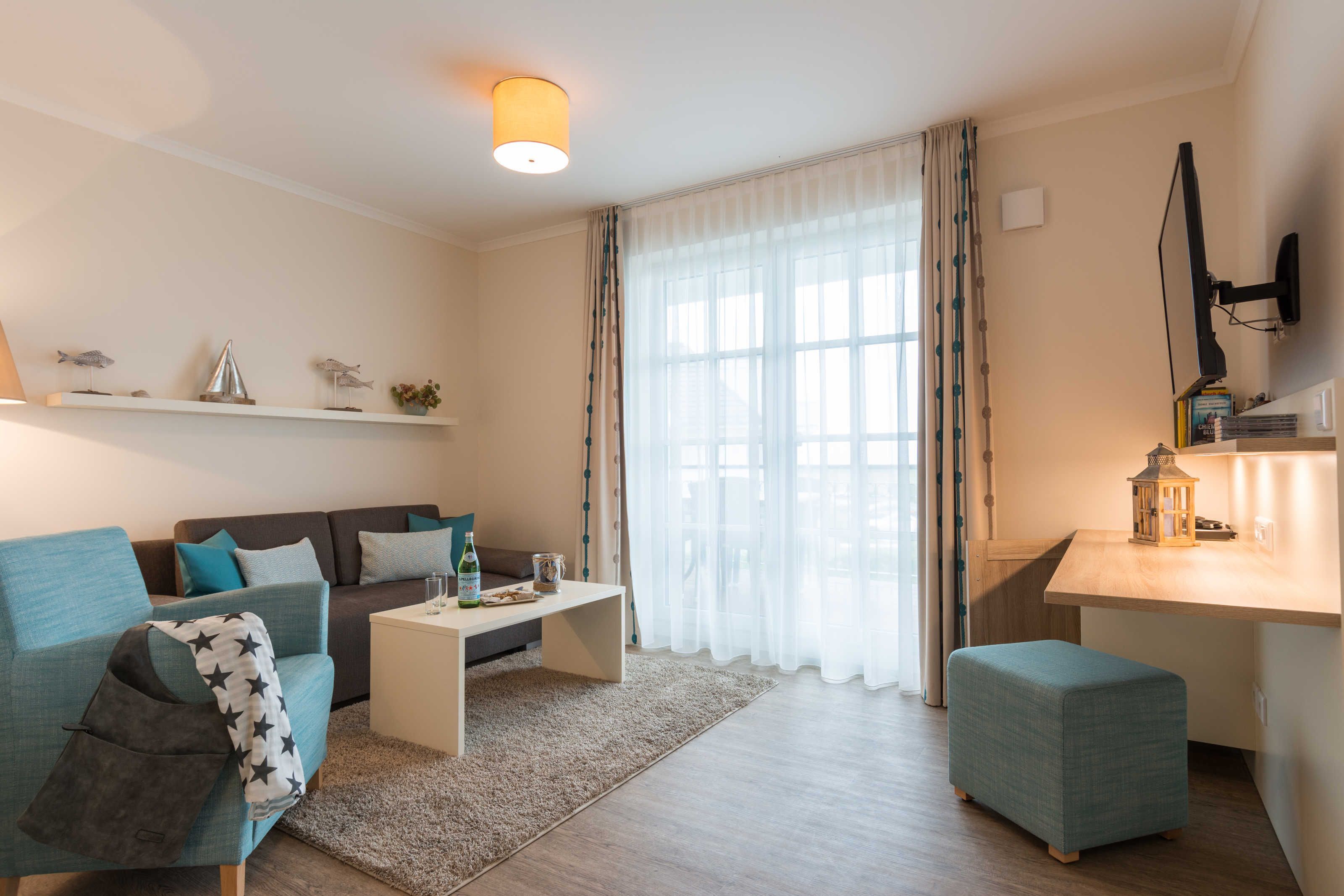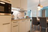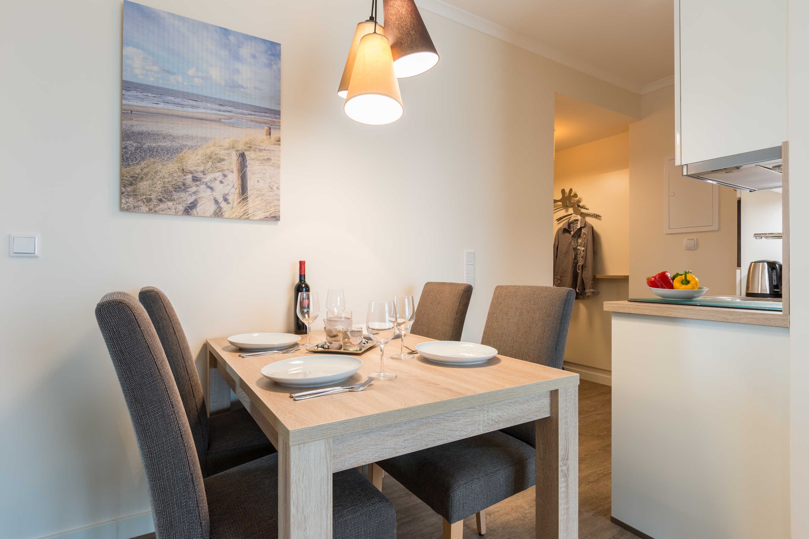 Der Wohn- und Essbereich verfügt über eine gemütliche Couch, einen Couchtisch sowie einen Esstisch mit vier Stühlen. Ein Flat-Screen-TV, ein DVD-Player und eine kleine Musikanlage gehören zur technischen Ausstattung. An kühlen Herbst- und Wintertagen sorgt in allen Räumen eine Fußbodenheizung für Wärme und Gemütlichkeit. Die exklusive hochmoderne Einbauküche mit einer Mikrowelle inkl. Grillfunktion, einer Kühl-Gefrierkombination, einem Geschirrspüler sowie einem 2-Platten-Glaskeramikkochfeld mit Dunstabzugshaube lässt keine Wünsche offen. Weitere Küchengeräte wie Wasserkocher, Toaster, Kaffeemaschine, Geschirr etc. sind selbstverständlich. In der Wohnung befinden sich zwei Schlafzimmer mit Doppelbett und Kleiderschrank (1 Boxspringbett 1,80 x 2,00 m mit zwei Einzelmatratzen und ein Boxspringbett 1,40 m x 2,0 m mit einer durchgehender Matratze). Das große Schlafzimmer verfügt über einen weiteren Flat-Screen-TV. Vom Wohnzimmer aus ist der Balkon in Nord-West Richtung zu erreichen. Das Badezimmer ist elegant gefliest mit ebenerdiger Dusche.