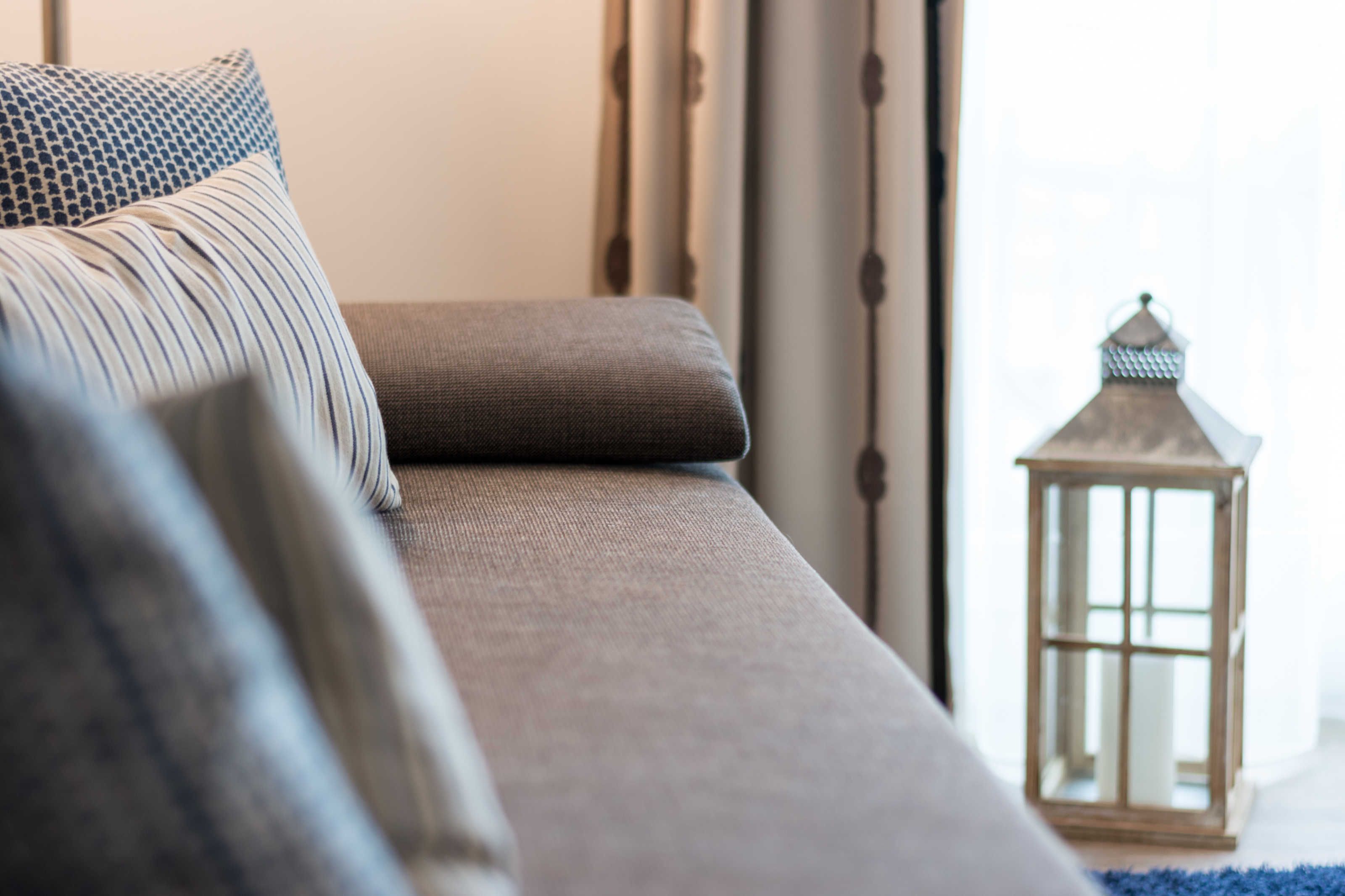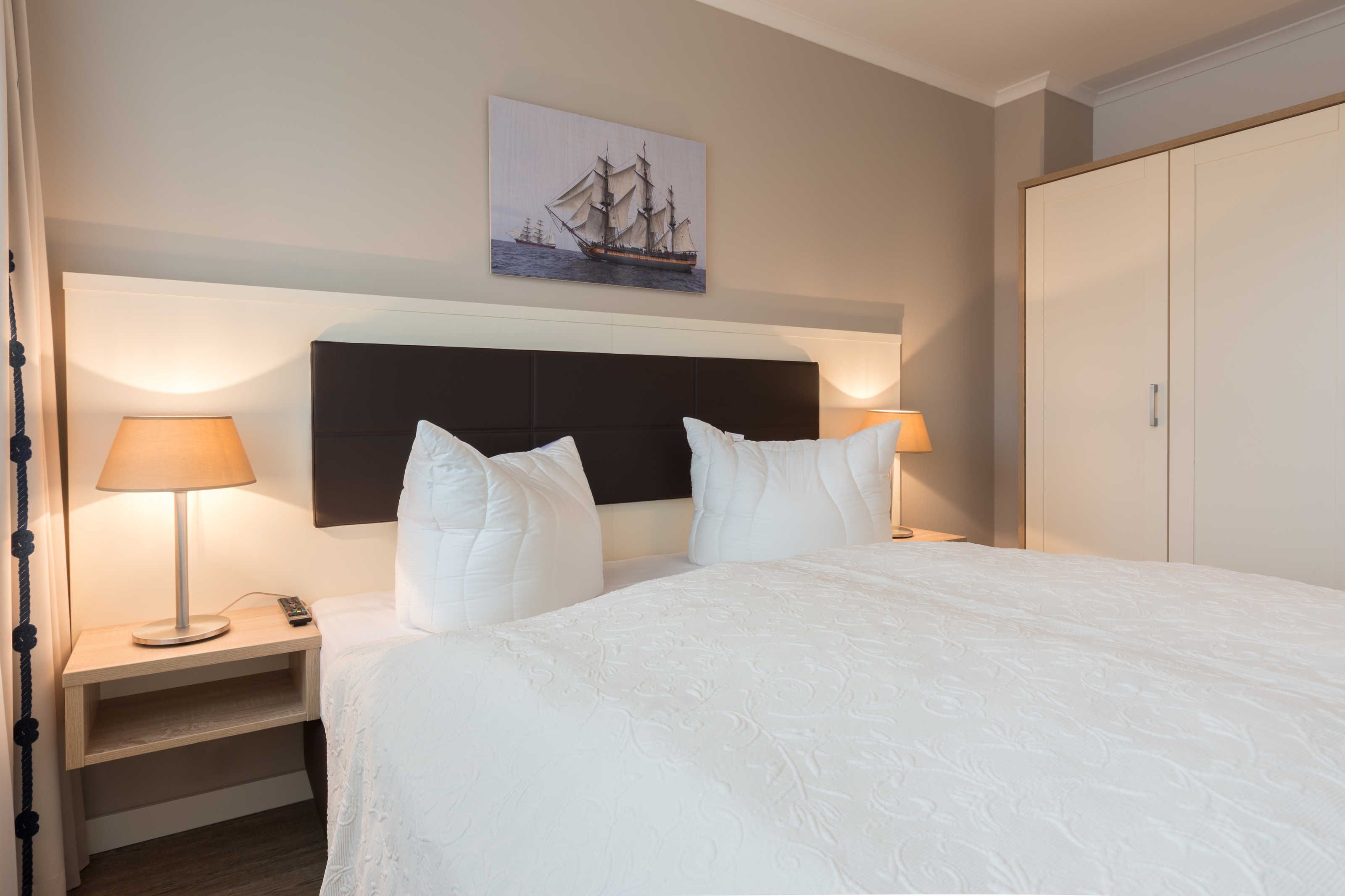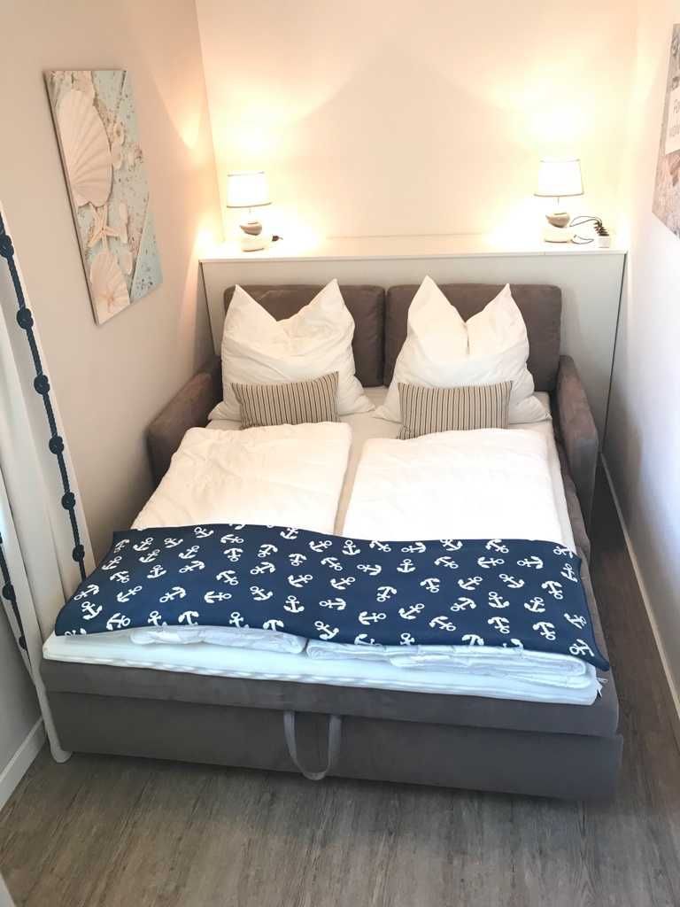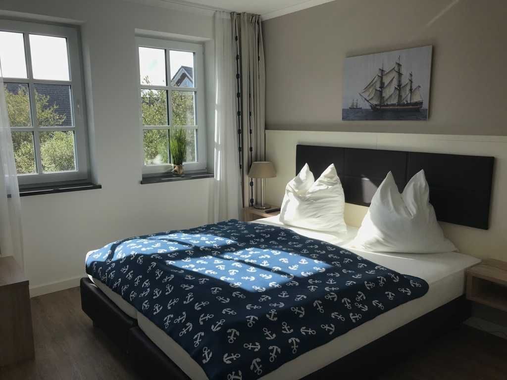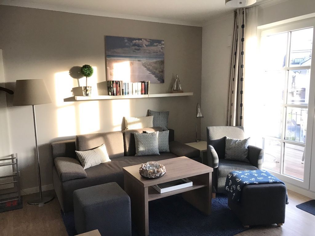 Im hellen und geschmackvoll eingerichteten Wohnzimmer laden eine gemütliche Couch mit passendem Sessel sowie ein großer Esstisch, der vier Personen bequem Platz bietet, zum Verweilen ein. Die Couch ist ausziehbar und kann so als zusätzliche Schlafmöglichkeit (1,50 m x 2,00 m) genutzt werden. Weiterhin gehören ein LED-TV, ein DVD-Player sowie eine kleine Stereo-Anlage zur Ausstattung. Direkt am Wohnzimmer befindet sich ein Balkon in östlicher Richtung. Genießen Sie hier ein gemütliches Frühstück in angenehmer Morgensonne. Neben dem Wohnbereich verfügt die Ferienwohnung über zwei separate Schlafräume. Im großen Schlafzimmer finden Sie neben einem weiteren LED-TV zwei komfortable Box-Springbetten (0,90 m x 2,00 m) und einen großen und geräumigen Kleiderschrank. Im zweiten Schlafzimmer befinden sich eine Schlafcouch (1,60 m x 2,00 m) und ein weiterer Kleiderschrank. Die Schlafräume bieten genug Platz für ein Kinderreisebett und können durch entsprechende Vorhänge gut abgedunkelt werden. An Herbst- und Wintertagen sorgt in allen Räumen eine Fußbodenheizung für angenehme Wärme und Gemütlichkeit.