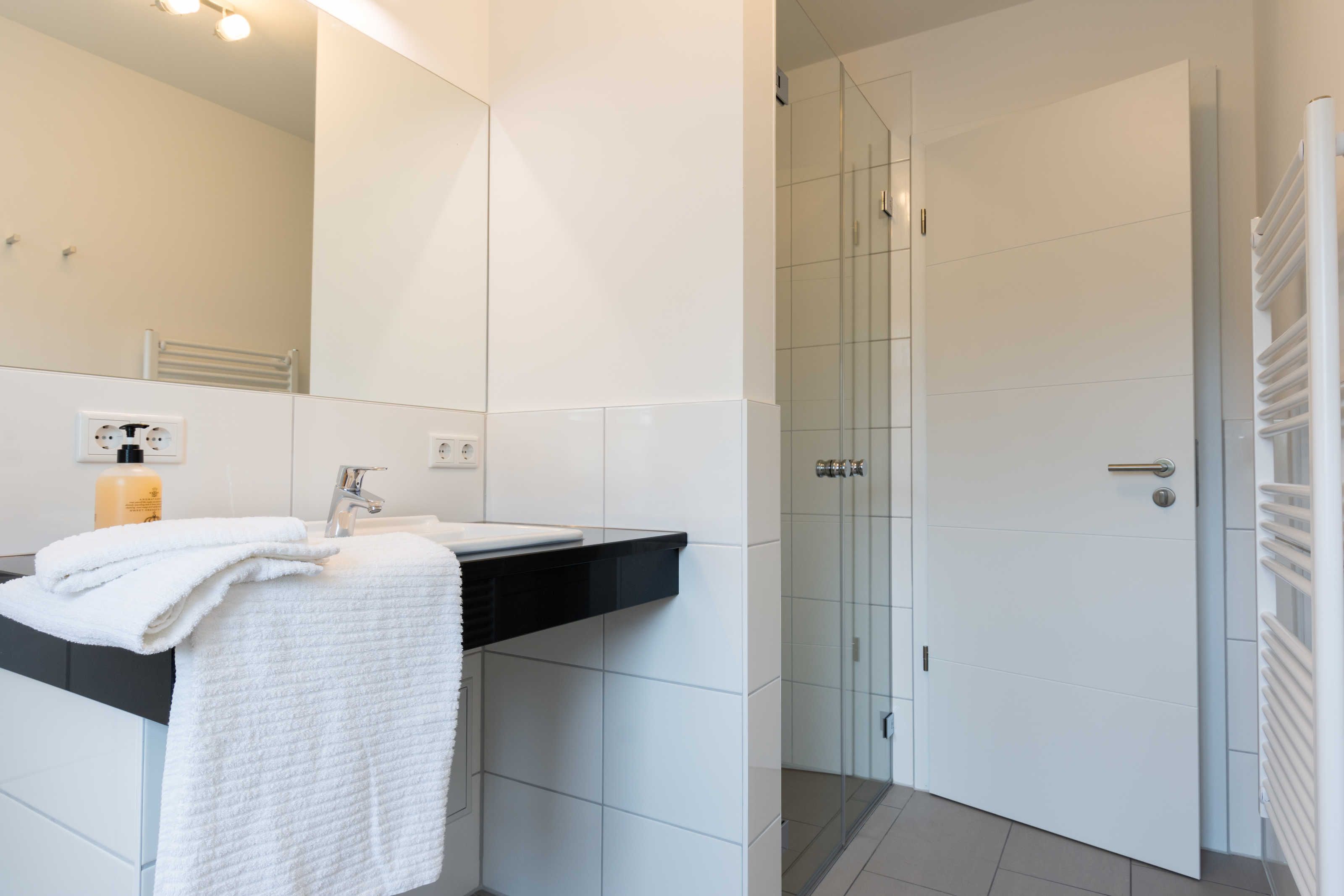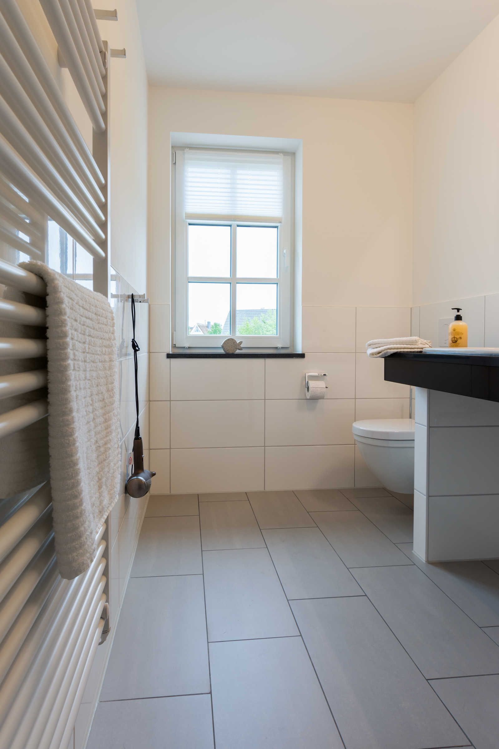 Das helle Badezimmer mit Fenster und bodengleicher Dusche verfügt über einen wandhängenden Badezimmerschrank, einen Waschtisch mit großem Spiegel, einen Kosmetikspiegel, einen Haartrockner und einen elektrisch beheizbaren Handtuchhalter.
