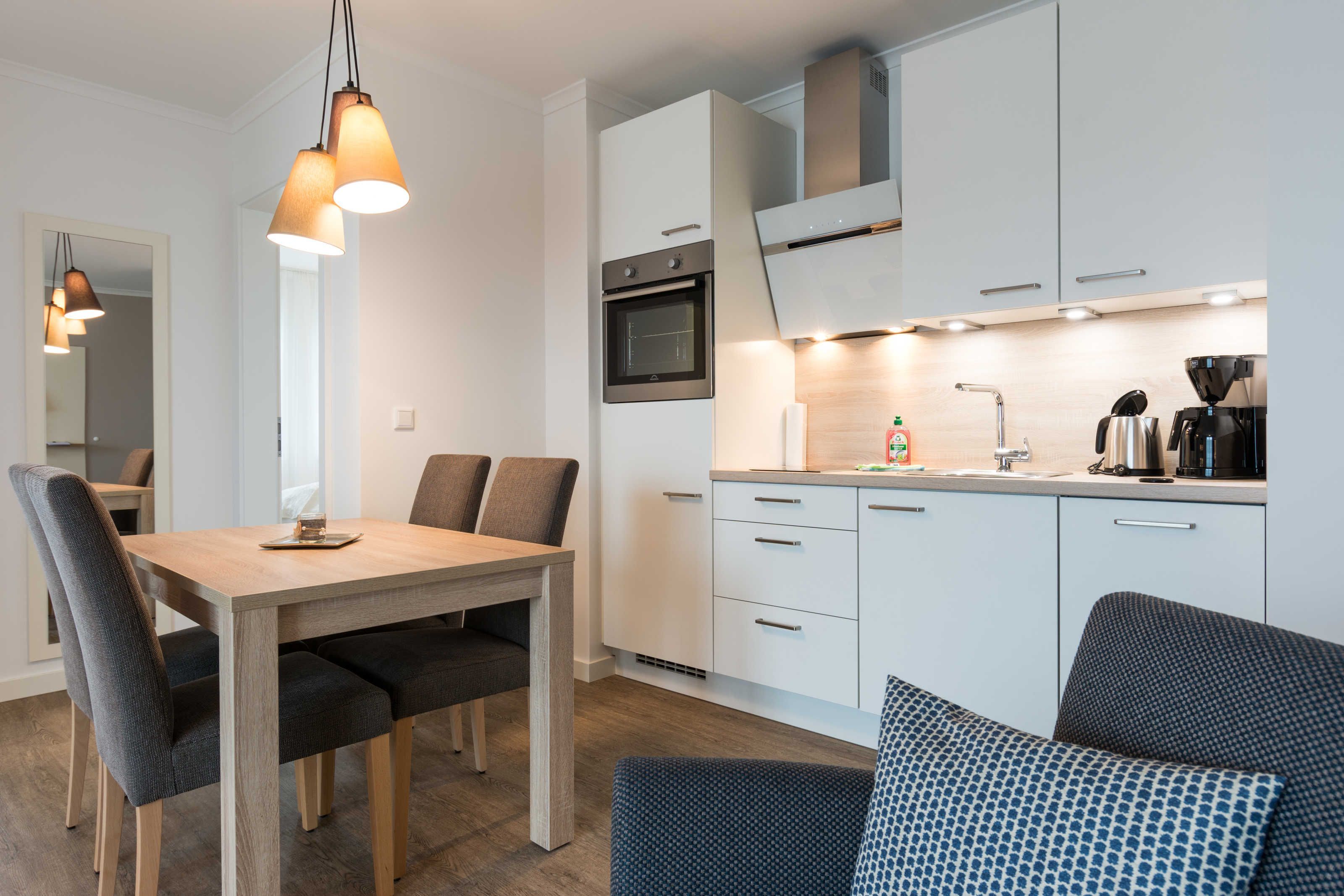 Die komplett ausgestattete Einbauküche verfügt über einen Geschirrspüler, einen Kühlschrank mit Gefrierfach, einen Backofen, ein Cerankochfeld, Toaster, Kaffeemaschine und einen Wasserkocher. Geschirr und Gläser sind in ausreichender Zahl vorhanden.